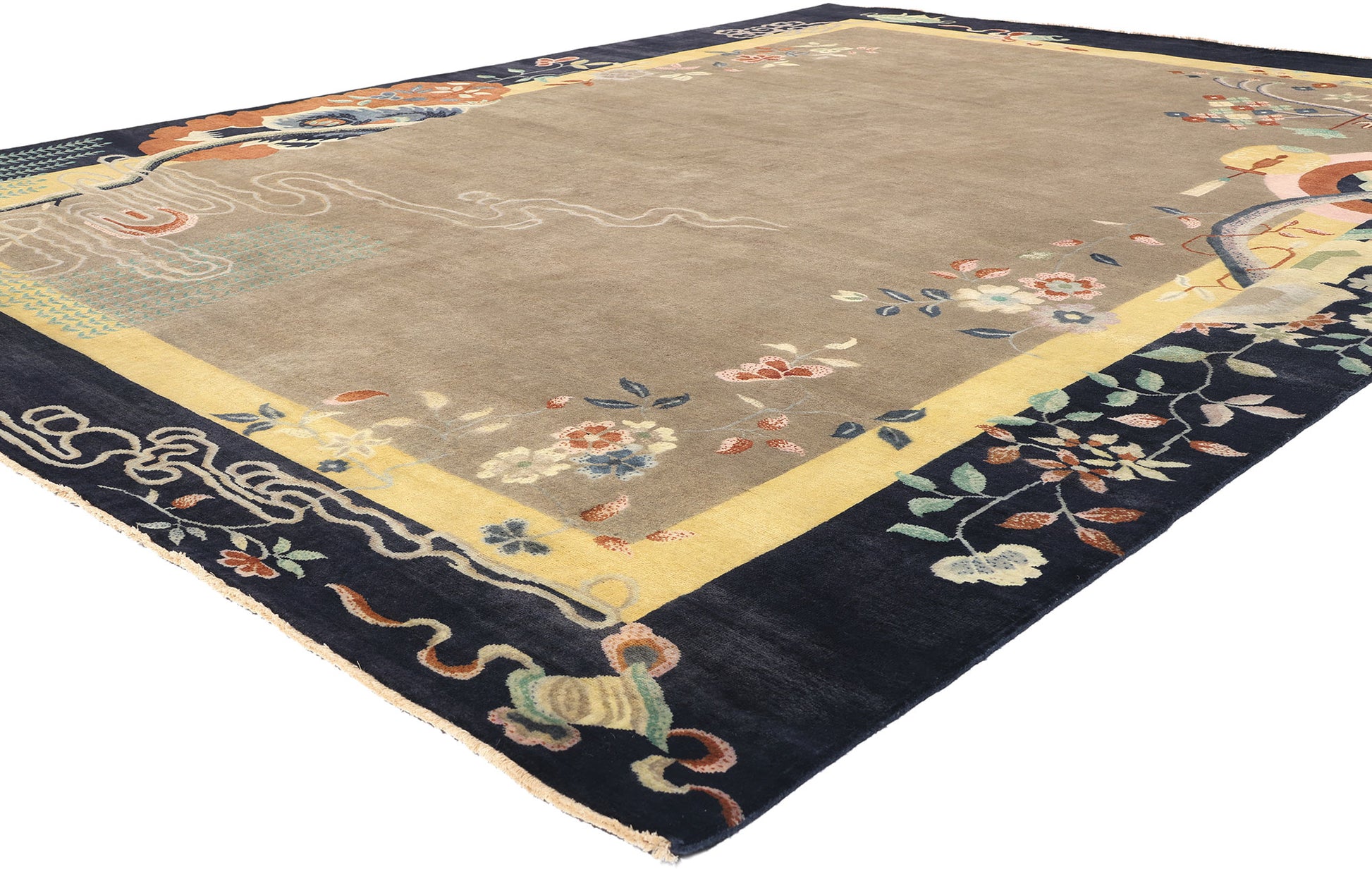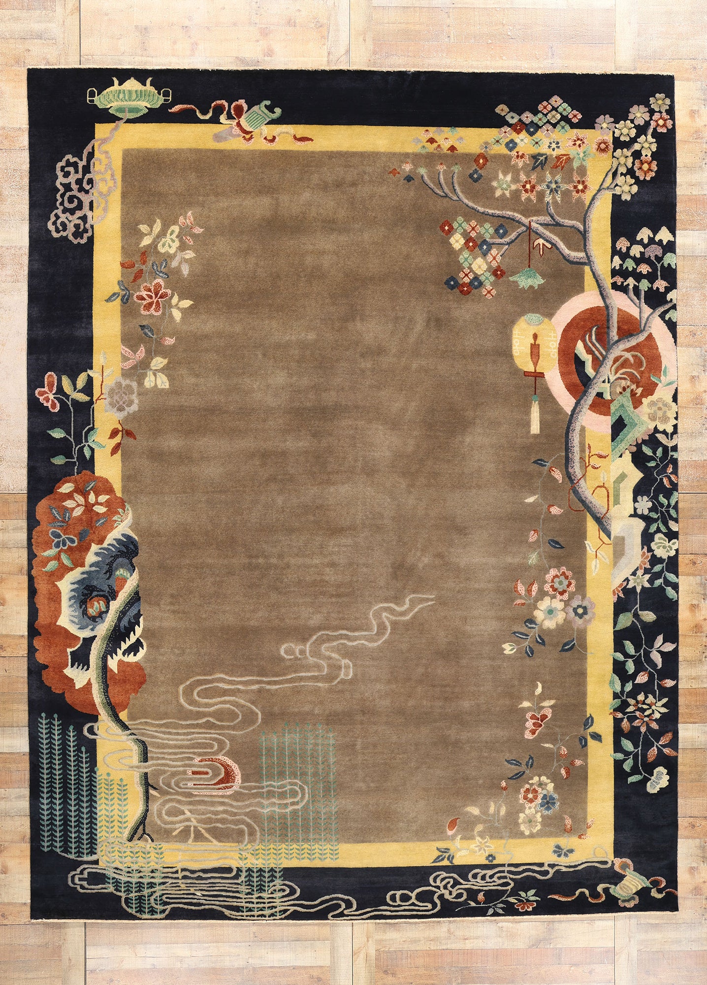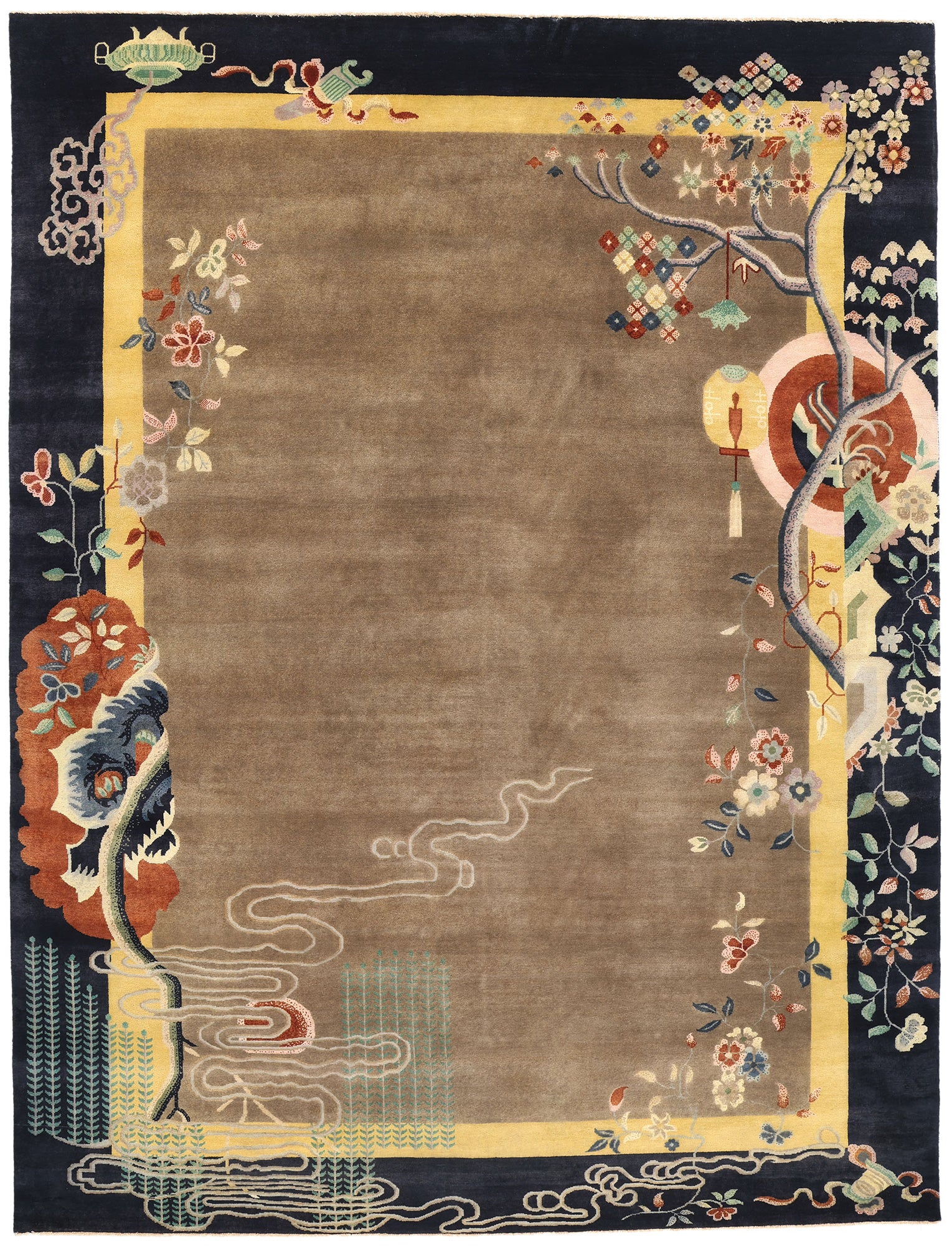 At the heart of the rug's design is a serene, neutral-toned field that serves as a tranquil canvas for the vivid, symbolic elements that surround it. The taupe background enhances the vibrant colors of the surrounding motifs, allowing each detail to stand out with clarity and grace. The floral patterns that dance along the border are a celebration of nature's beauty, featuring a delicate array of lotuses, peonies, chrysanthemums, and plum blossoms. Each flower is meticulously rendered, with the lotus symbolizing purity and spiritual awakening, the peony representing wealth and honor, the chrysanthemum signifying longevity and rejuvenation, and the plum blossom embodying resilience and perseverance in the face of adversity.