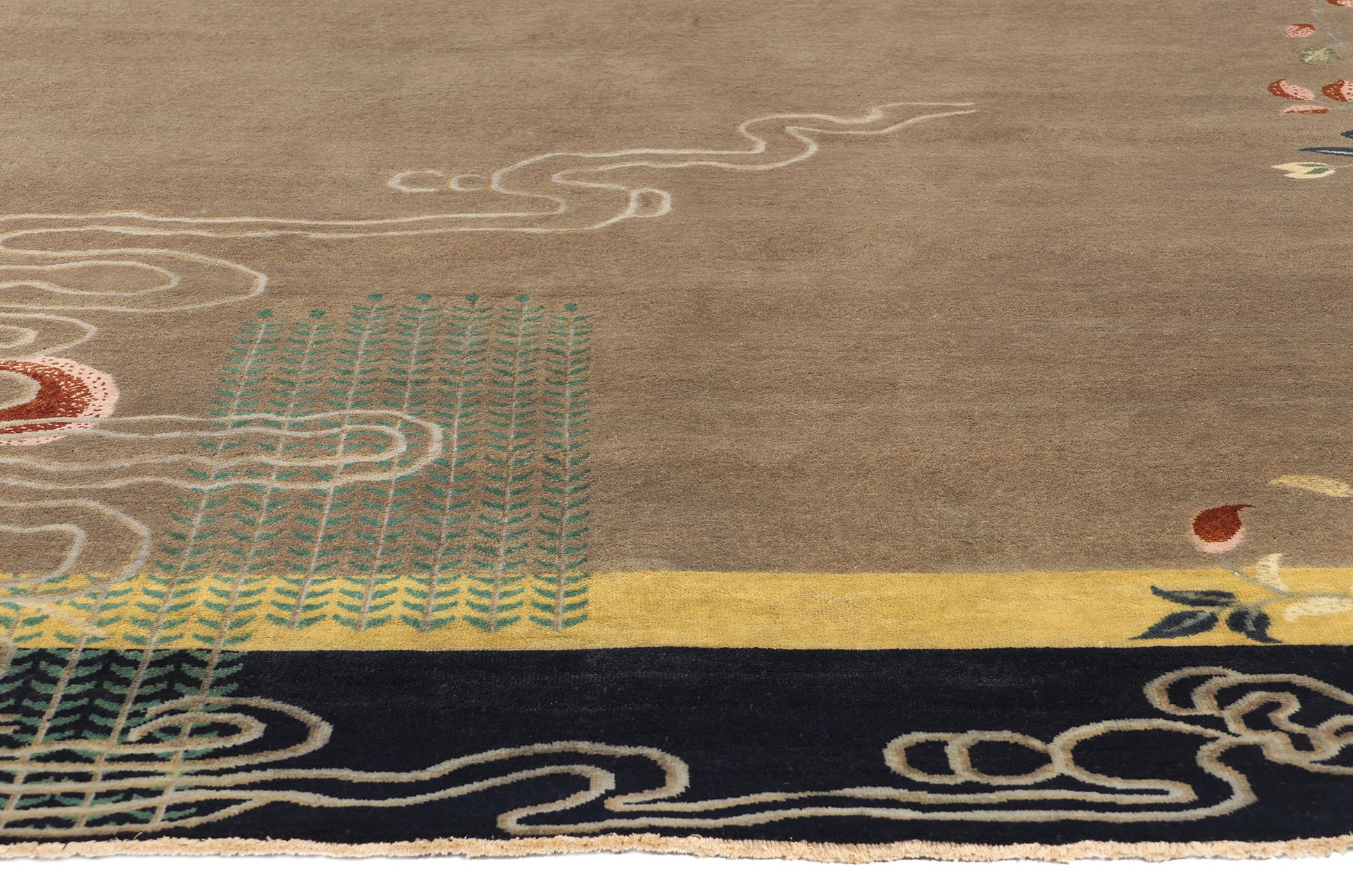 This meticulous arrangement of scholarly objects, clouds, and floral motifs not only reflects the cultural richness of Chinese symbolism but also demonstrates the rug's exceptional craftsmanship. The use of these symbols invites contemplation and appreciation, making the rug not just a decorative piece but a medium through which ancient wisdom and values are communicated. The harmonious blend of these elements creates a captivating narrative that is as aesthetically pleasing as it is culturally meaningful.