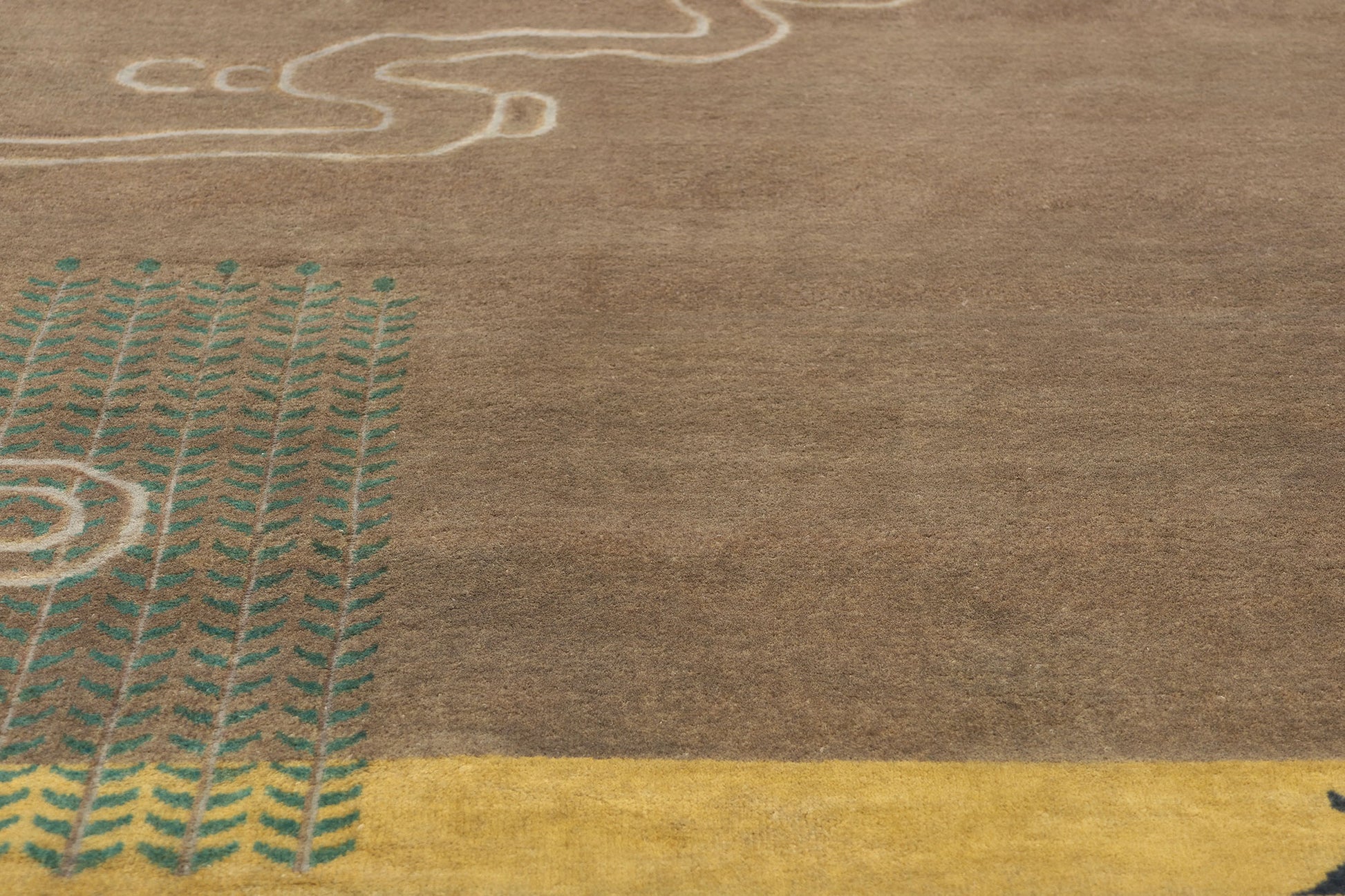 In the lower corners, the design incorporates swirling cloud motifs, also known as "auspicious clouds," which are believed to connect the earthly realm with the divine. These clouds, with their soft, flowing lines, bring a sense of movement and ethereal beauty to the composition, further enhancing the rug's overall allure. The clouds, traditionally seen as bearers of blessings, add a spiritual dimension to the rug, imbuing it with a sense of serenity and divine favor.