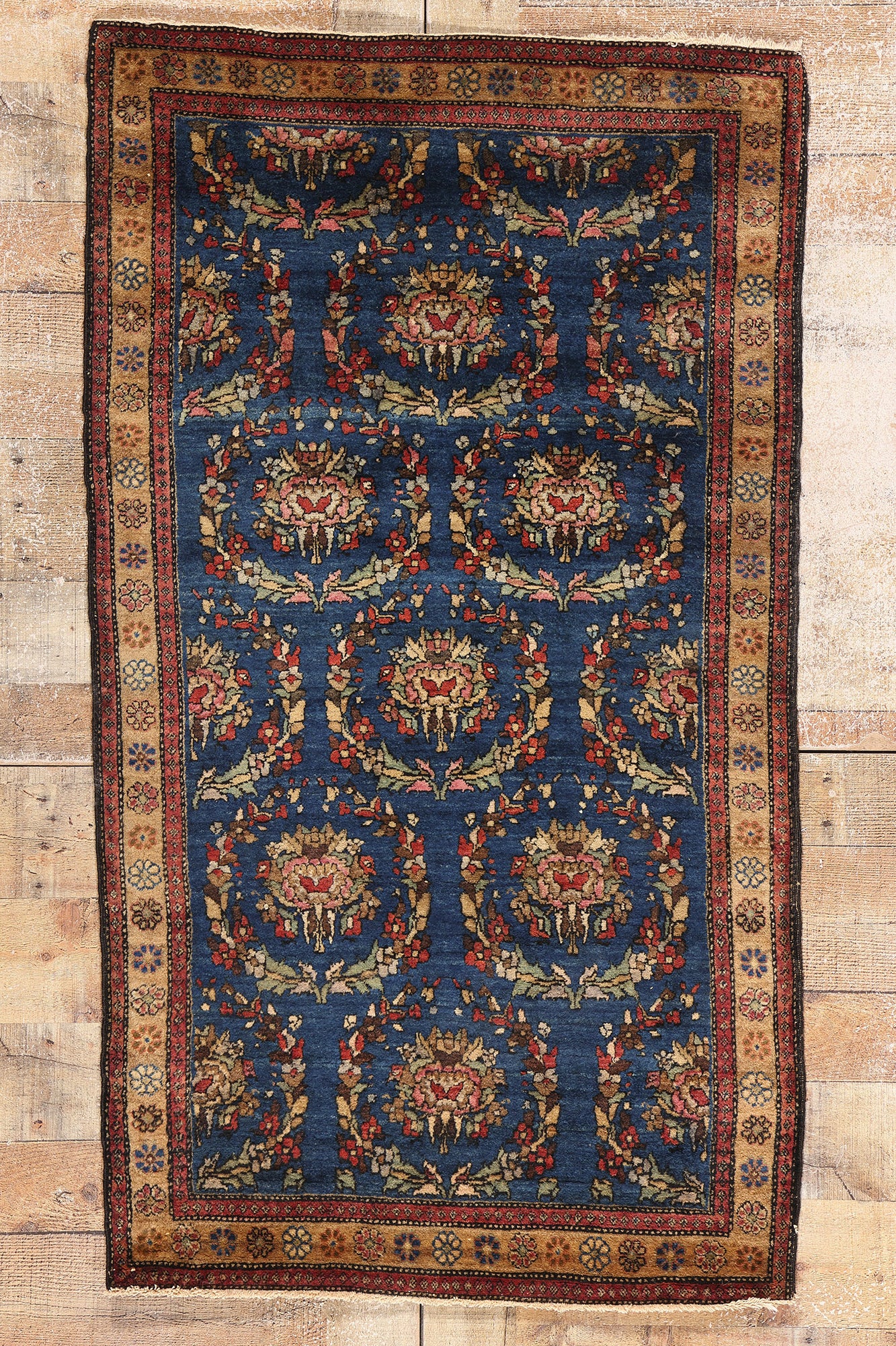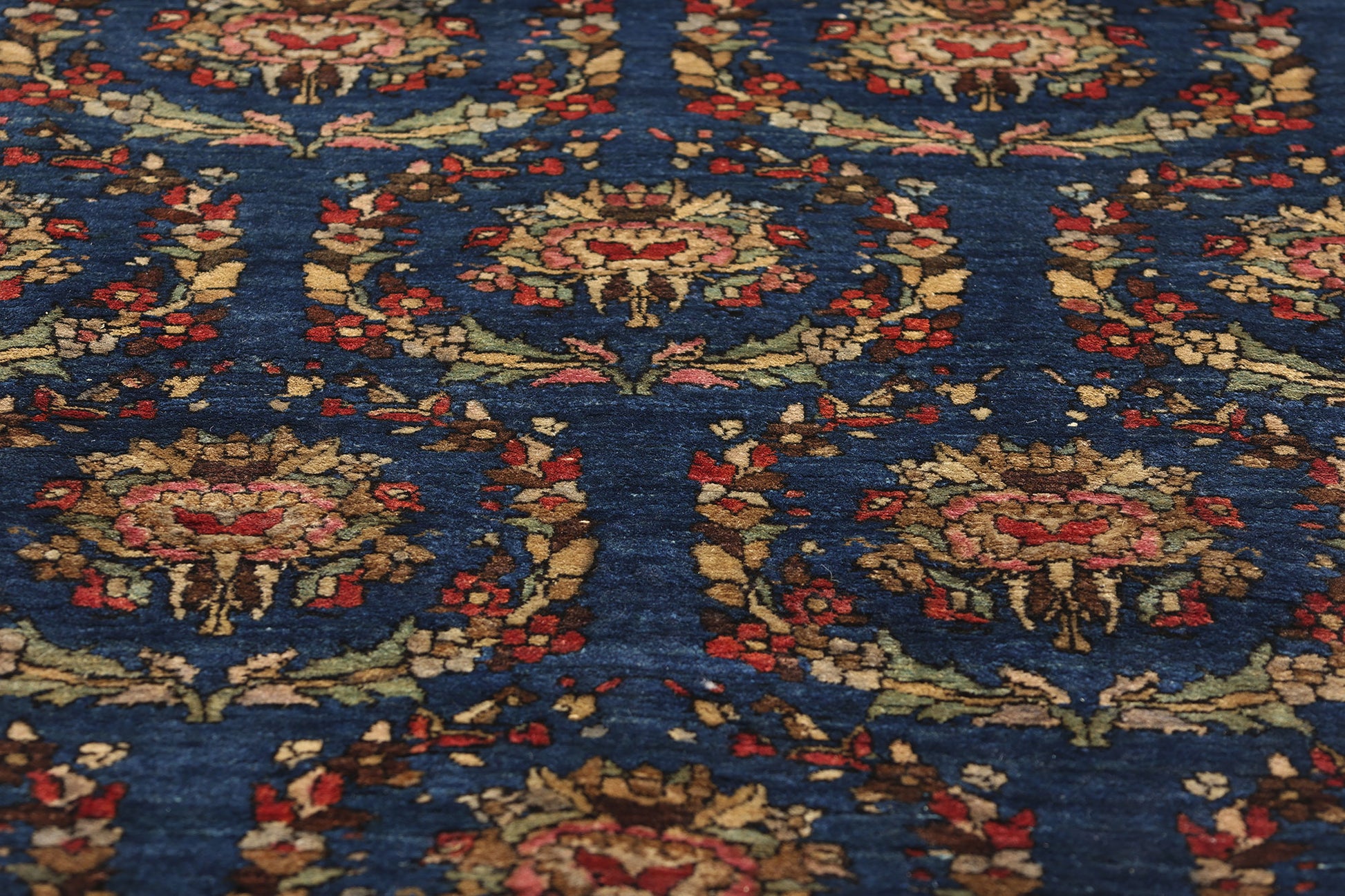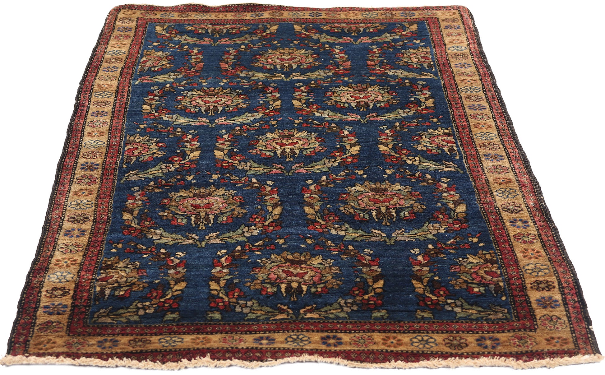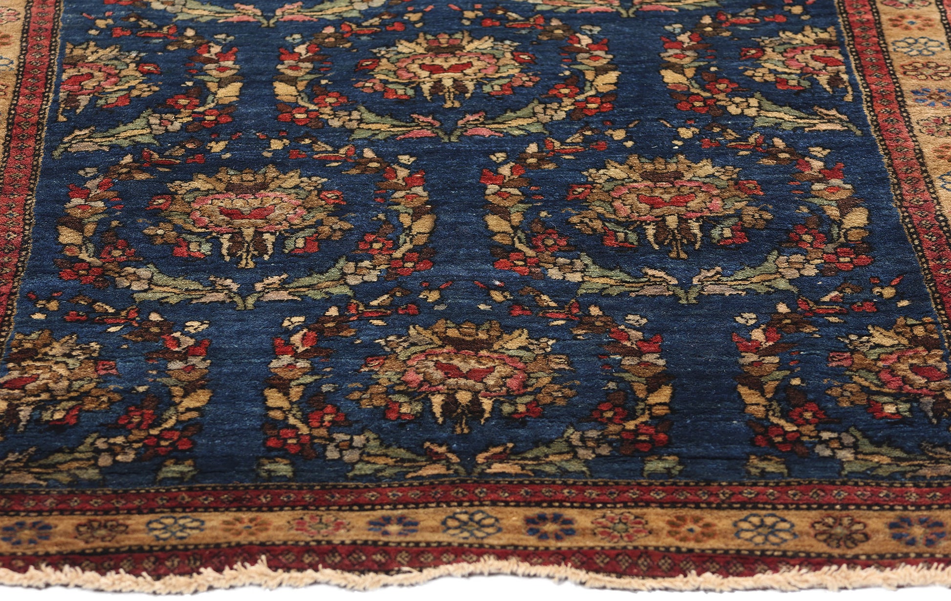 This hand-knotted wool antique Persian Sarouk rug exudes timeless elegance and reflects the rich cultural heritage of Persian artistry. Crafted in the Sarouk region of Iran, this piece is a masterpiece of design, blending traditional motifs with exceptional craftsmanship. Its luminous navy blue field serves as the perfect backdrop for a repeating floral medallion pattern, creating a harmonious and balanced composition that is both captivating and refined.