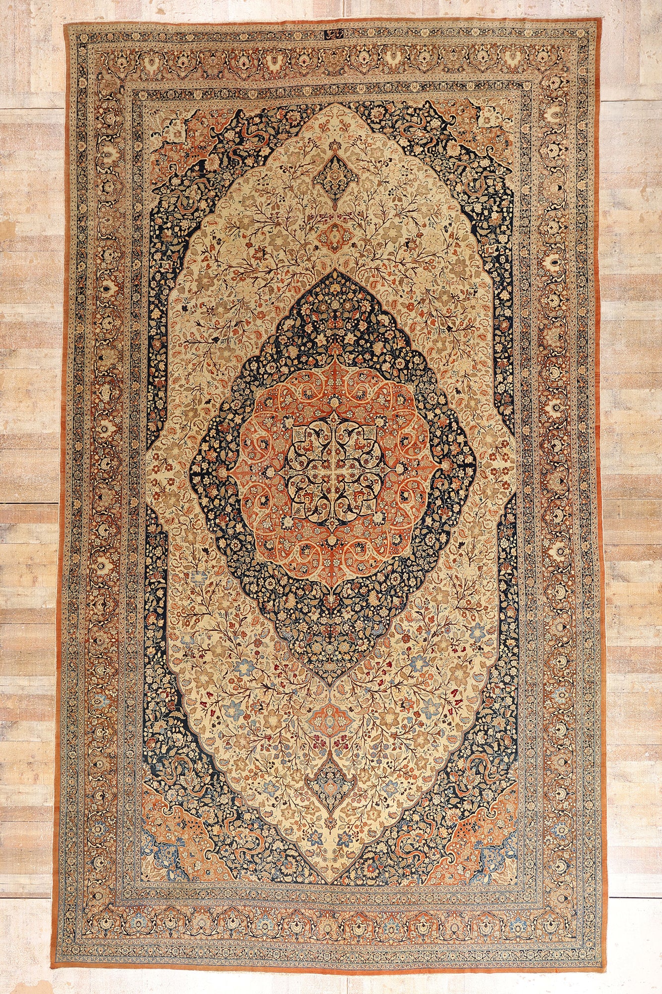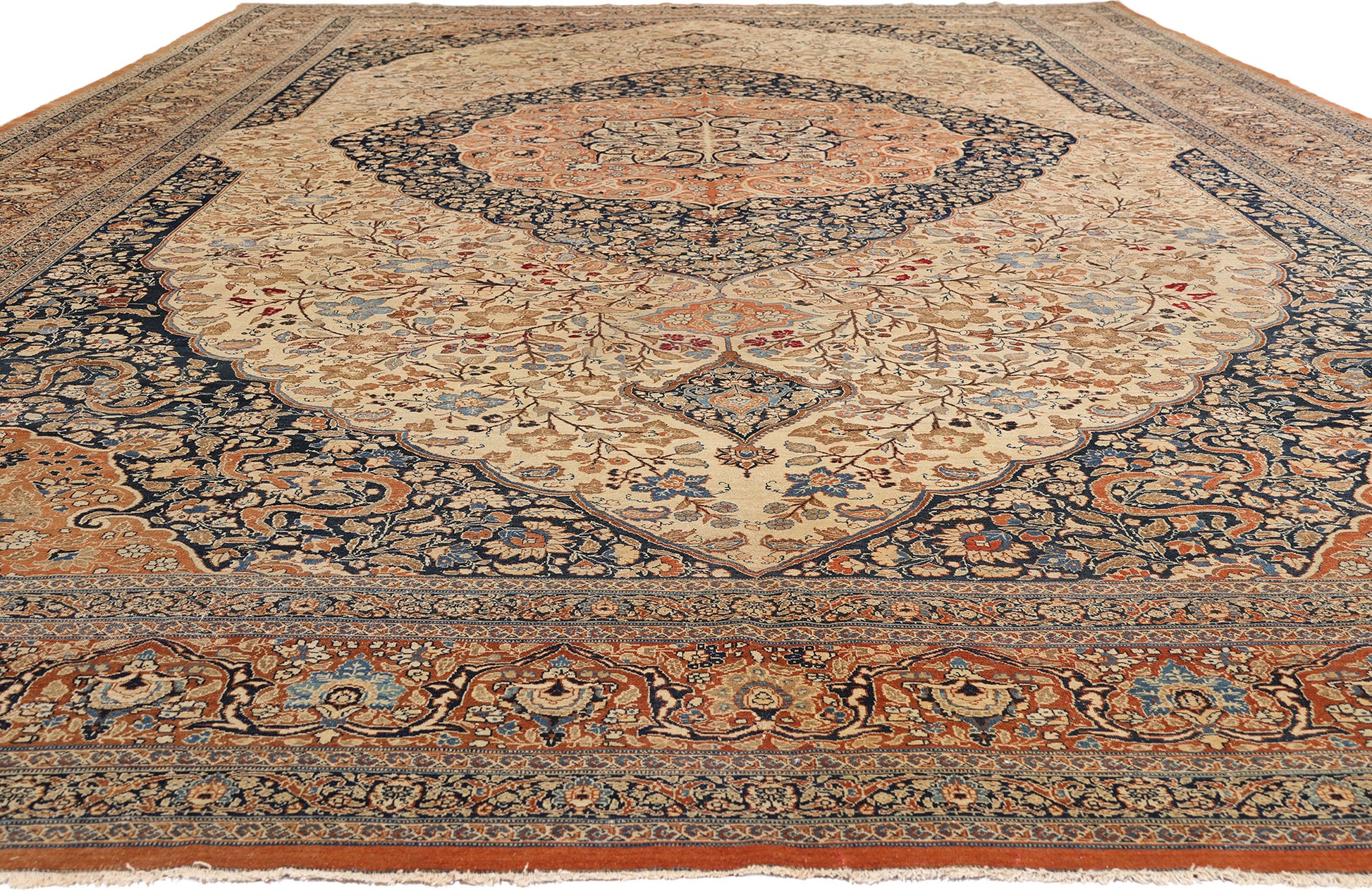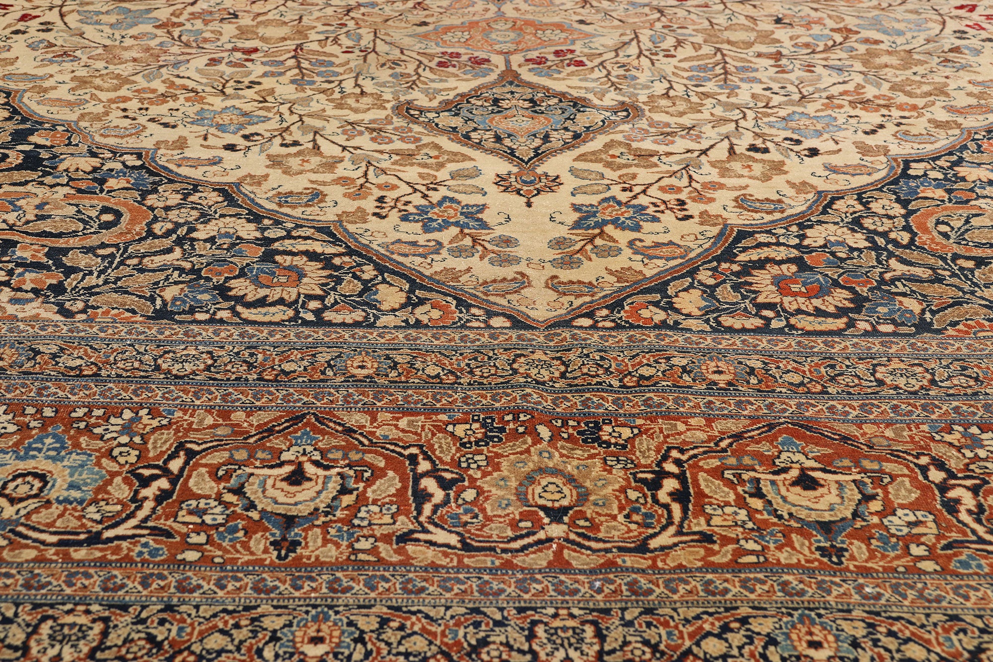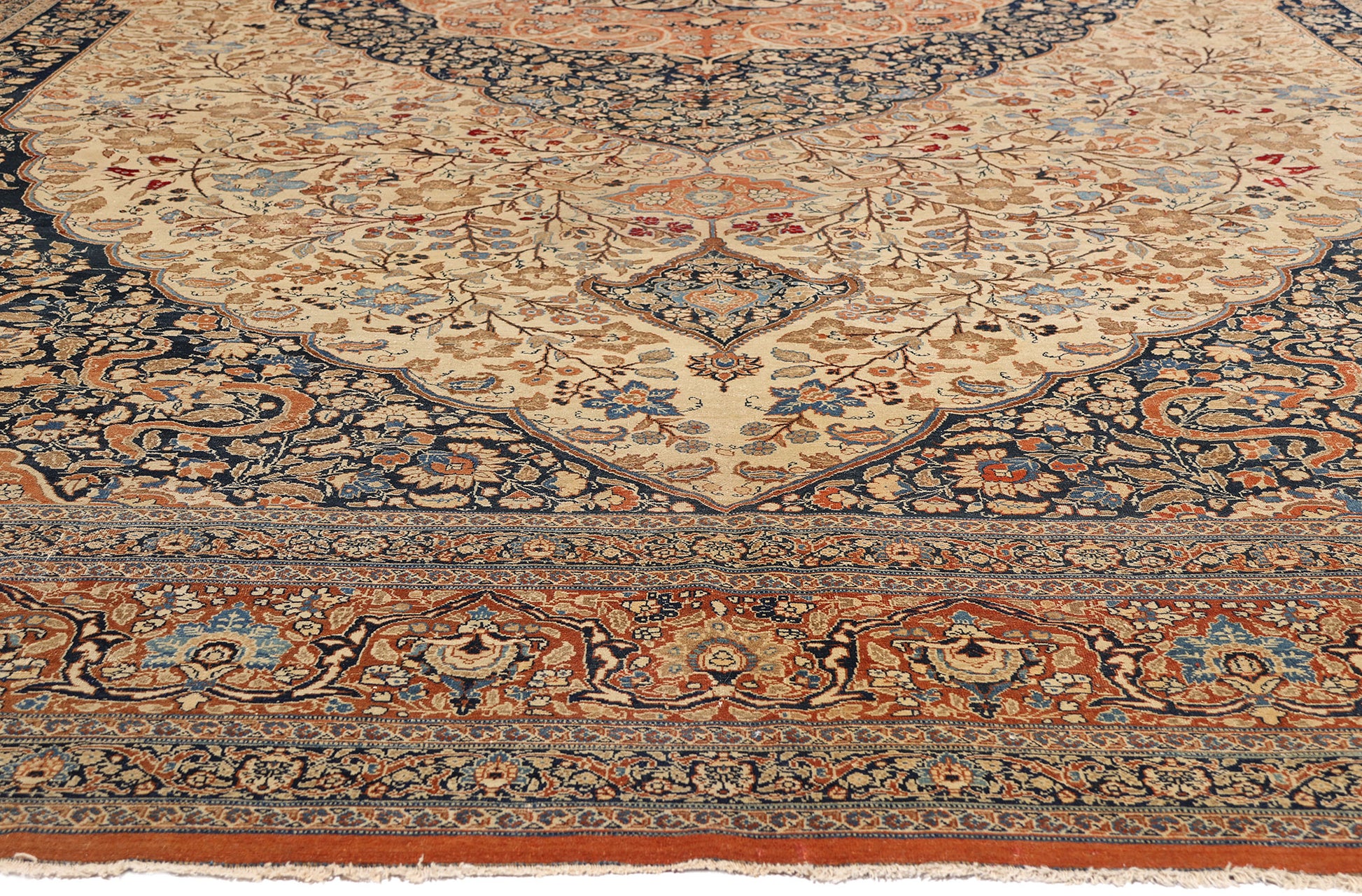 Surrounding the majestic medallion, the warm beige field becomes a luminous ground for an abundance of flowering vines, palmettes, and delicate foliage. These botanical forms are enlivened by refined Chinese cloudband motifs—an echo of Tabriz’s historic role as a crossroads of Silk Road aesthetics. The corner spandrels mirror the medallion’s scalloped geometry, seamlessly integrating floral ornamentation with sinuous arabesque movement, creating a continuous visual dialogue across the surface.