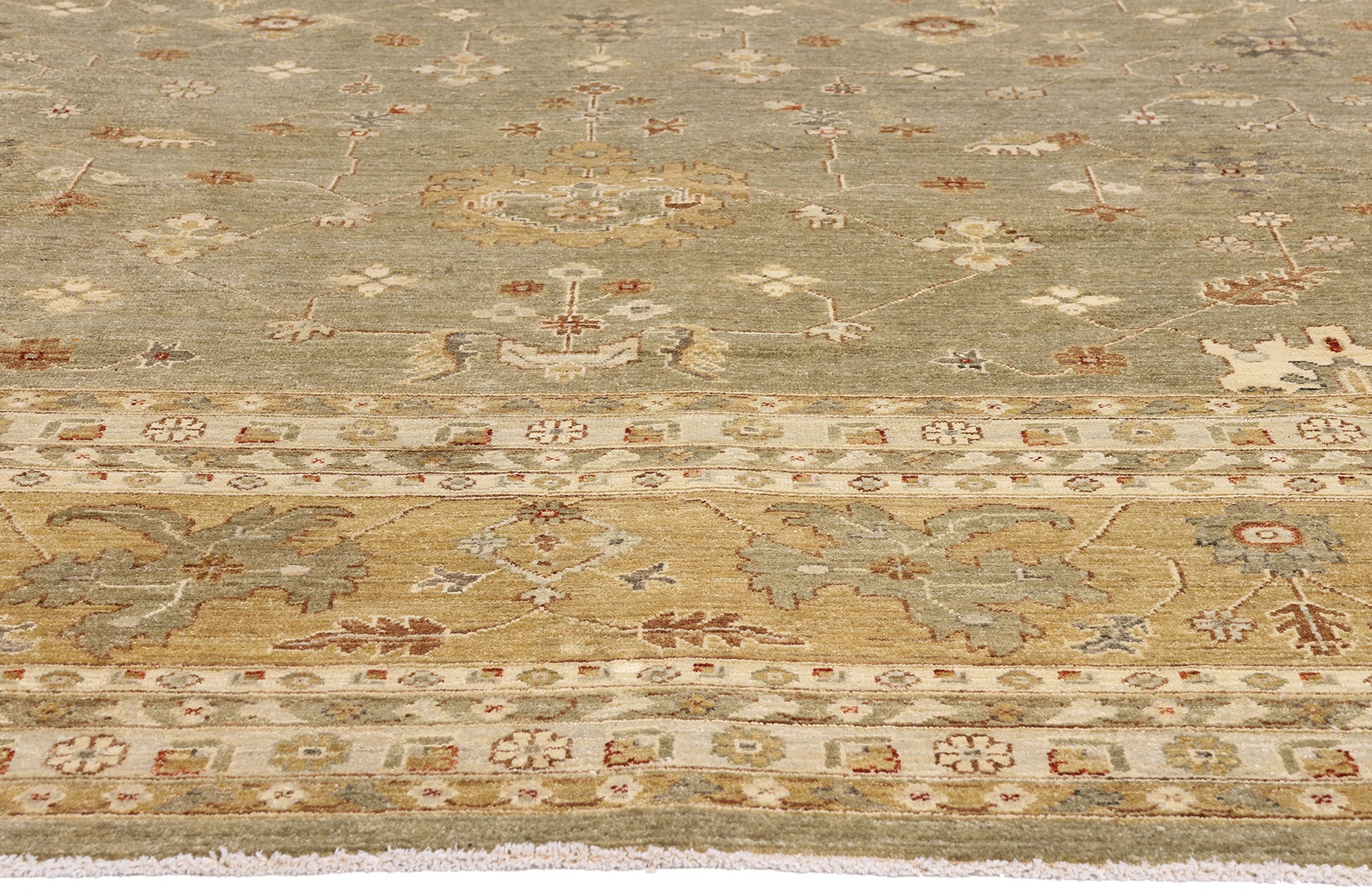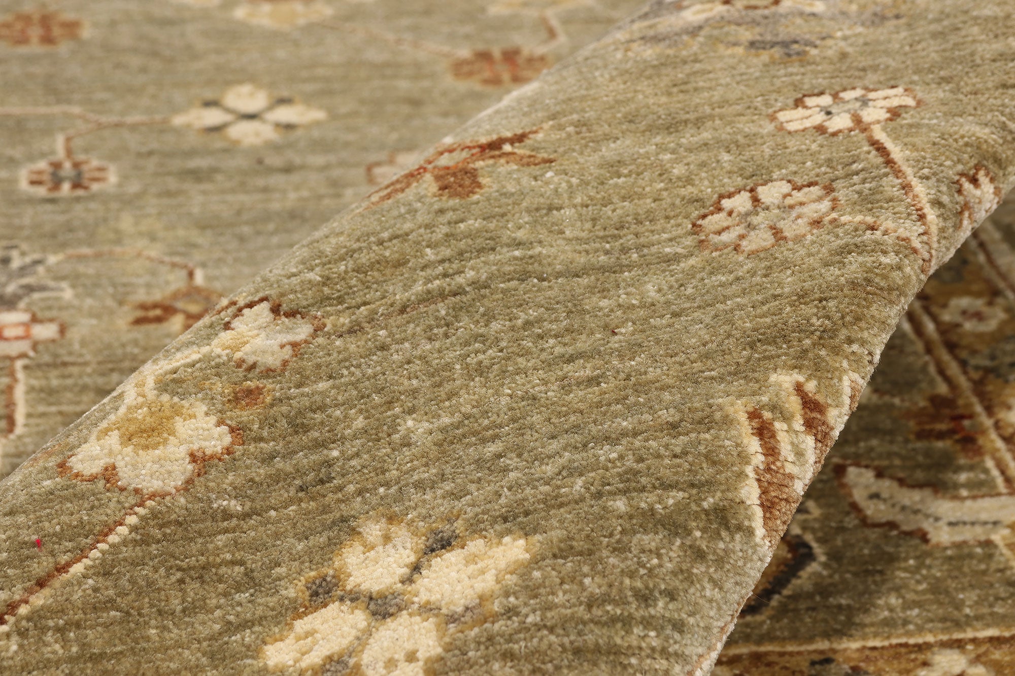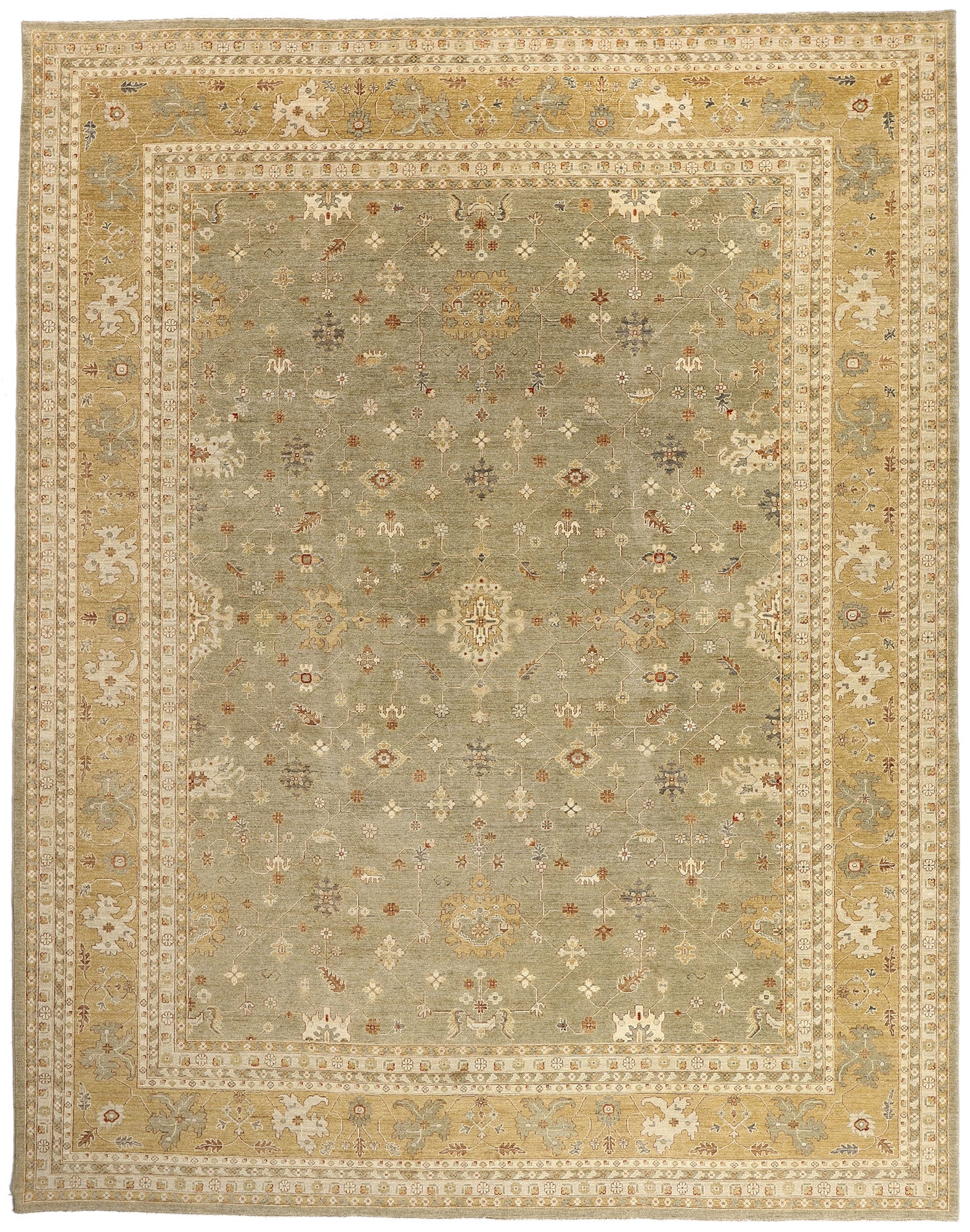 Surrounding the exceptional field, a richly articulated botanical border forms a graceful enclosure, reinforcing the sense of cultivated order. Flowing vine scrolls, abstracted leaves, and floral forms are framed by a series of inner and outer guard bands, each acting as a subtle layer of refinement. The sumptuous borders do not dominate; instead, they guide the eye inward, creating depth and cohesion while enhancing the rug’s architectural presence within a room.