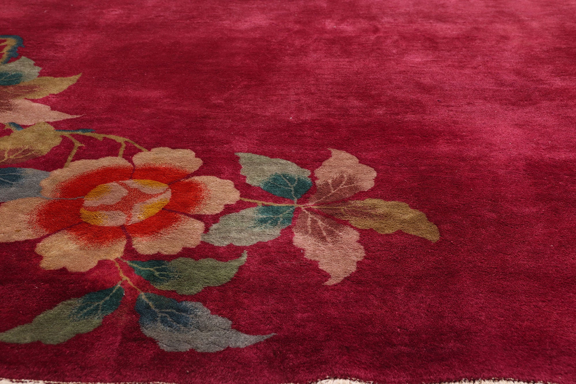 The open ruby field between these botanical statements is deliberate and refined, allowing the richness of the wool pile to shimmer under changing light. This exceptional composition speaks to a modernist sensibility—where heritage and inventiveness meet—honoring traditional Chinese symbolism while embracing the streamlined elegance coveted by international tastemakers of the 1920s and 1930s. The interplay of saturated red, celadon, coral, sapphire, and soft gold evokes a jewel box palette, reinforcing the sense of rarity and prestige that defined the Nichols aesthetic.