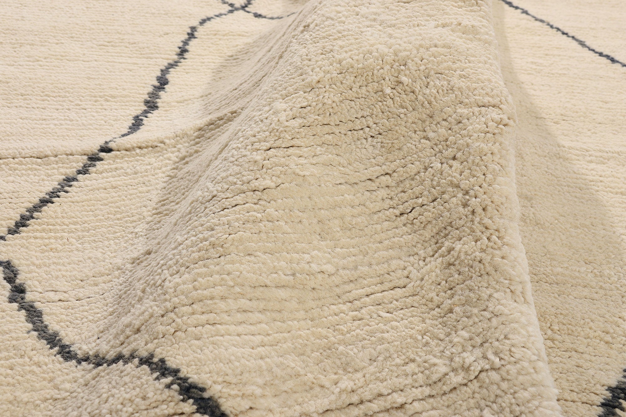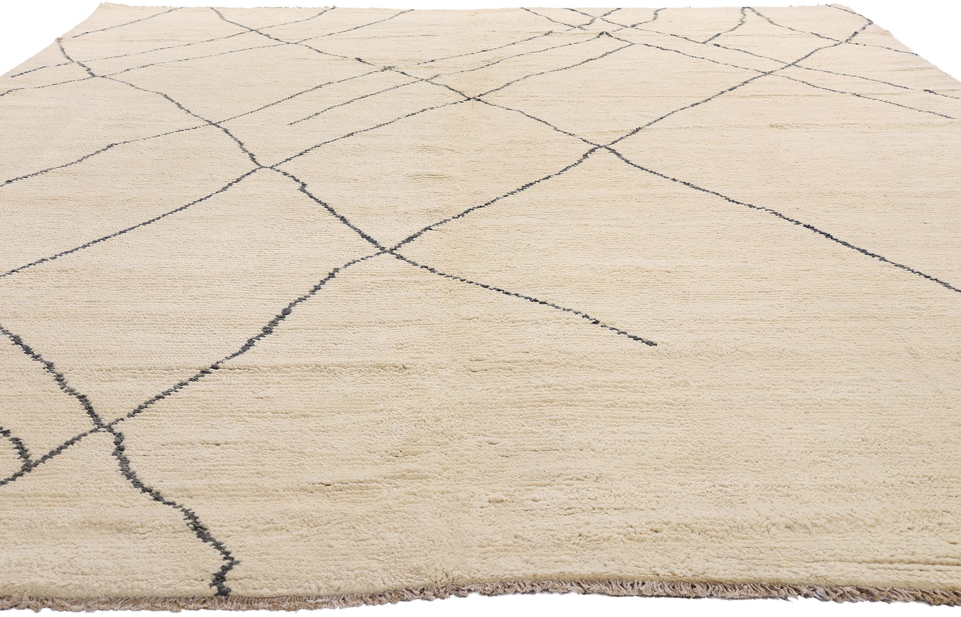 In this rarefied creation of organic modernism, simplicity is elevated to the realm of the sublime. Hand-knotted from the softest wool and dyed in an undisturbed ivory tone, this extraordinary Moroccan rug from India captures the essence of quiet luxury. A network of irregular charcoal lines traverses the field like ancient caravan routes etched into the sands of memory—silent, meditative, eternal. It is not a pattern, but a language. One that speaks of restraint, intention, and elemental beauty.