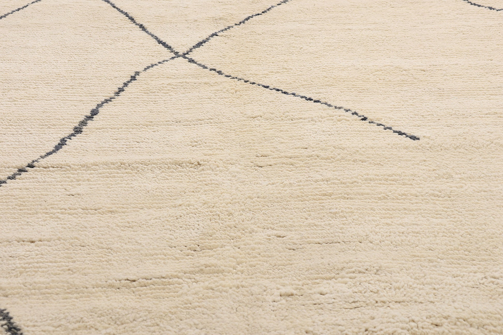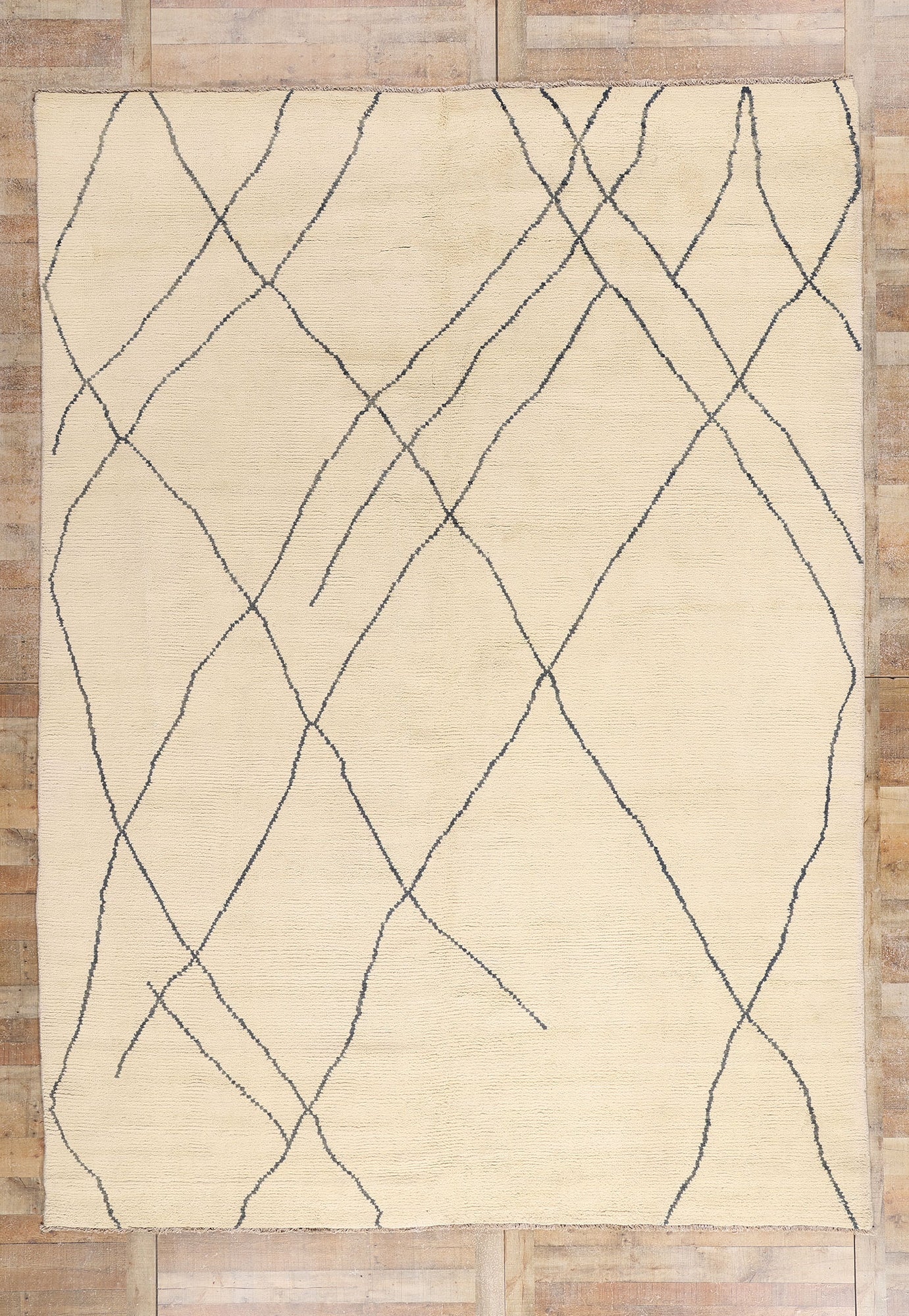 This exquisite work of art channels the purity of organic design with a sensibility rooted in wabi-sabi—the Japanese philosophy of beauty in imperfection—yet it also whispers of the great Moroccan weaving traditions that honor rhythm, landscape, and soul. The minimalist composition is bold in its quietude, offering an exclusive sense of openness and clarity, like a breath taken after long silence. The irregular lattice dissolves into abstraction, inviting interpretation and emotional connection.