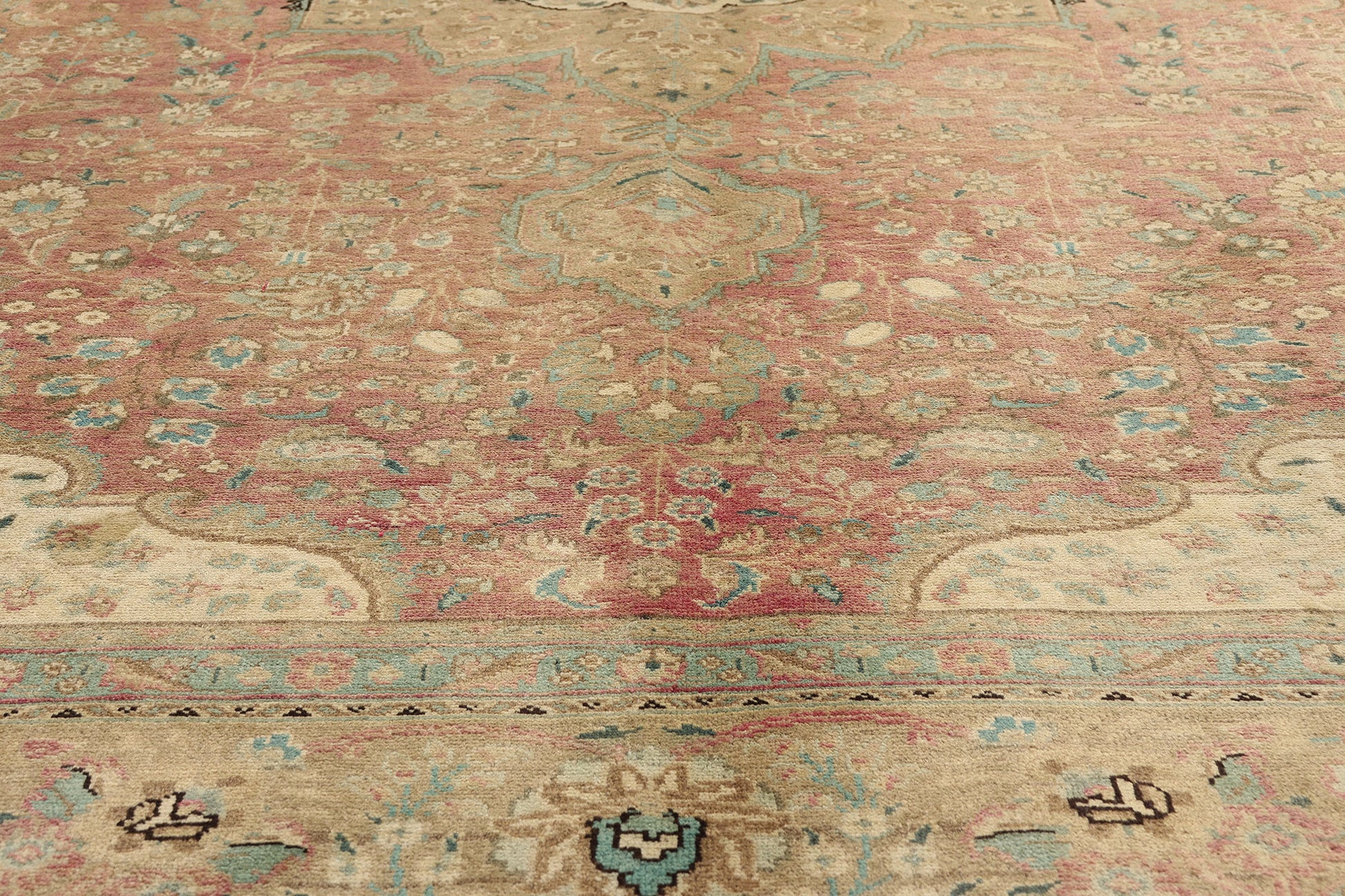 The precious rug’s beauty is crowned with a botanical border composed of an elaborate procession of palmettes and floral garlands, flanked by inner and outer floral meander guard bands. These rhythmic bands encircle the design with intention and refinement—testament to the meticulous artistry of Tabriz’s master weavers. Rare, poetic, and deeply evocative, this cherished masterpiece offers more than decor—it offers legacy. A statement of cultivated taste, cultural stewardship, and a commitment to preserving the enduring beauty of handwoven excellence.