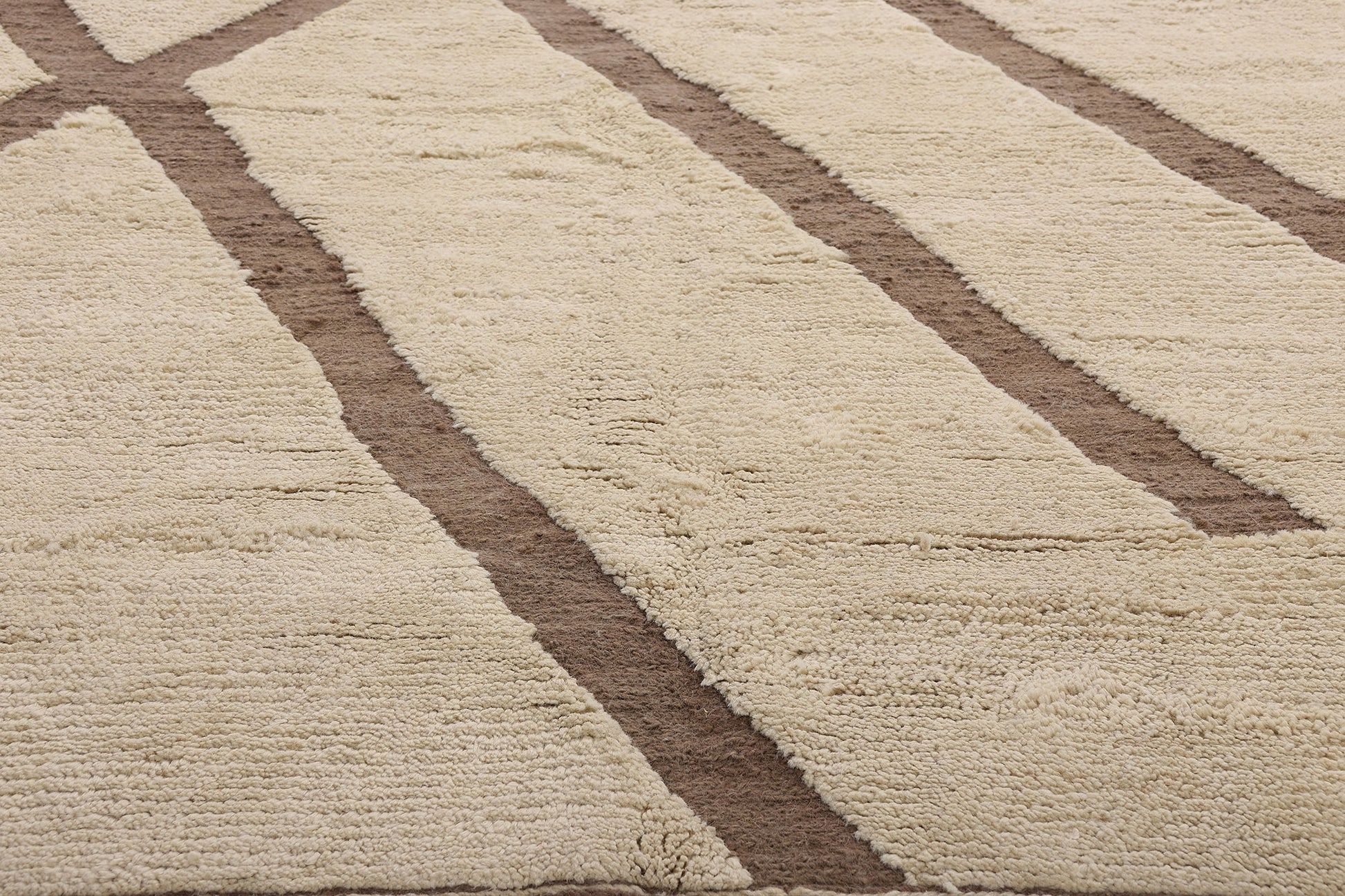 In this masterfully hand-knotted modern Moroccan rug, we encounter more than design—we encounter inscription. Each meandering line in warm, earthen brown traverses the ivory expanse like an ancient gesture resurrected, a cartographic trace of human movement across untamed terrain. These intersecting paths are not arbitrary—they are memory made visible, calligraphic remnants of a quiet ritual, a spiritual language rendered in precious wool. Rare is the textile that transcends function and becomes an act of meditative mark-making.