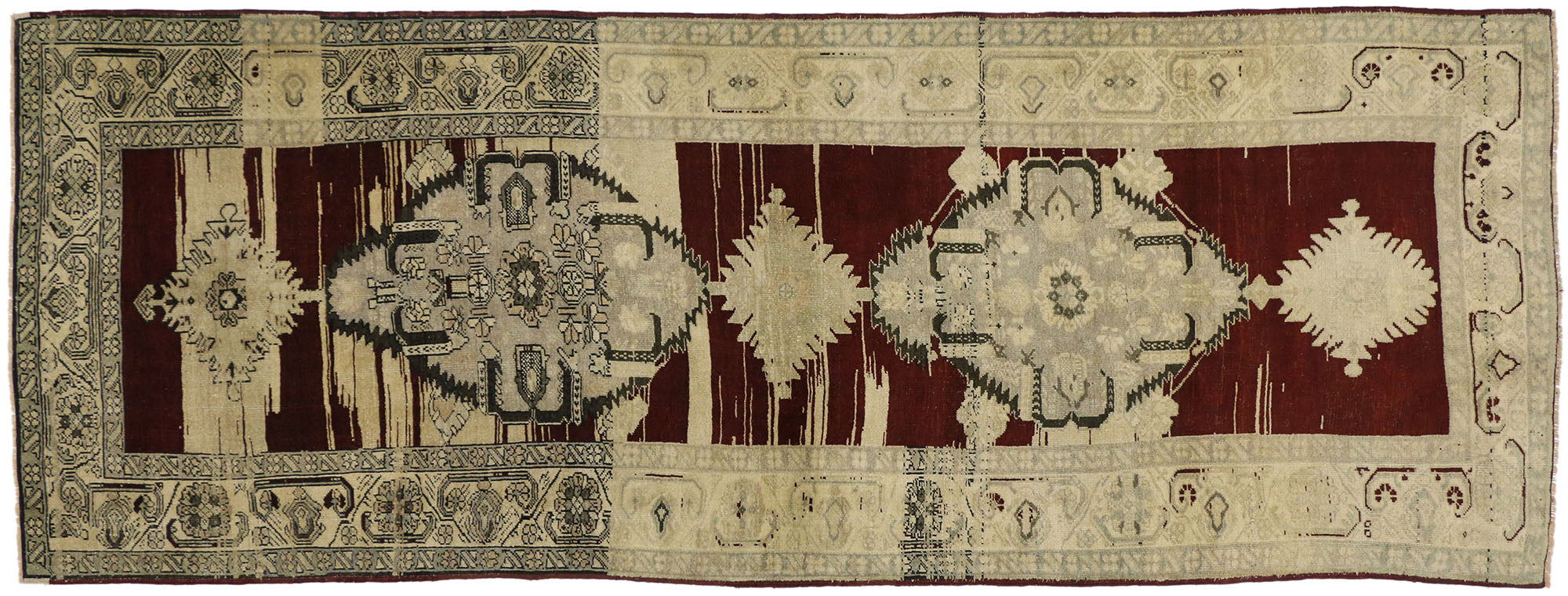 51268 Vintage Turkish Oushak Carpet Runner with Modern Style, Hallway Runner. This captivating vintage Turkish Oushak runner features a magnificent composition highlighting its selection of high contrasting colors and rich waves of exquisite abrash. The stunning medallions feature layers of meticulous detailed segments that have been washed out with the abrash. The traditional border creates a refined frame highlighting the lavish abrash. Rendered in beautiful shades of beige, ecru, sand, tan, champagne, gray, deep burgundy wine and dark forest green, this Oushak runner epitomizes the geometric design of Turkish style. Perfect for living rooms, bedrooms, kitchens, bathrooms, hallways, foyers and entryways. Hand-knotted wool. Made in Turkey. Abrash. Measures: 04’00 x 10’09.