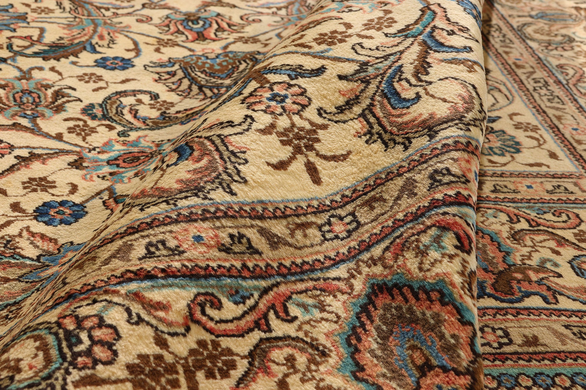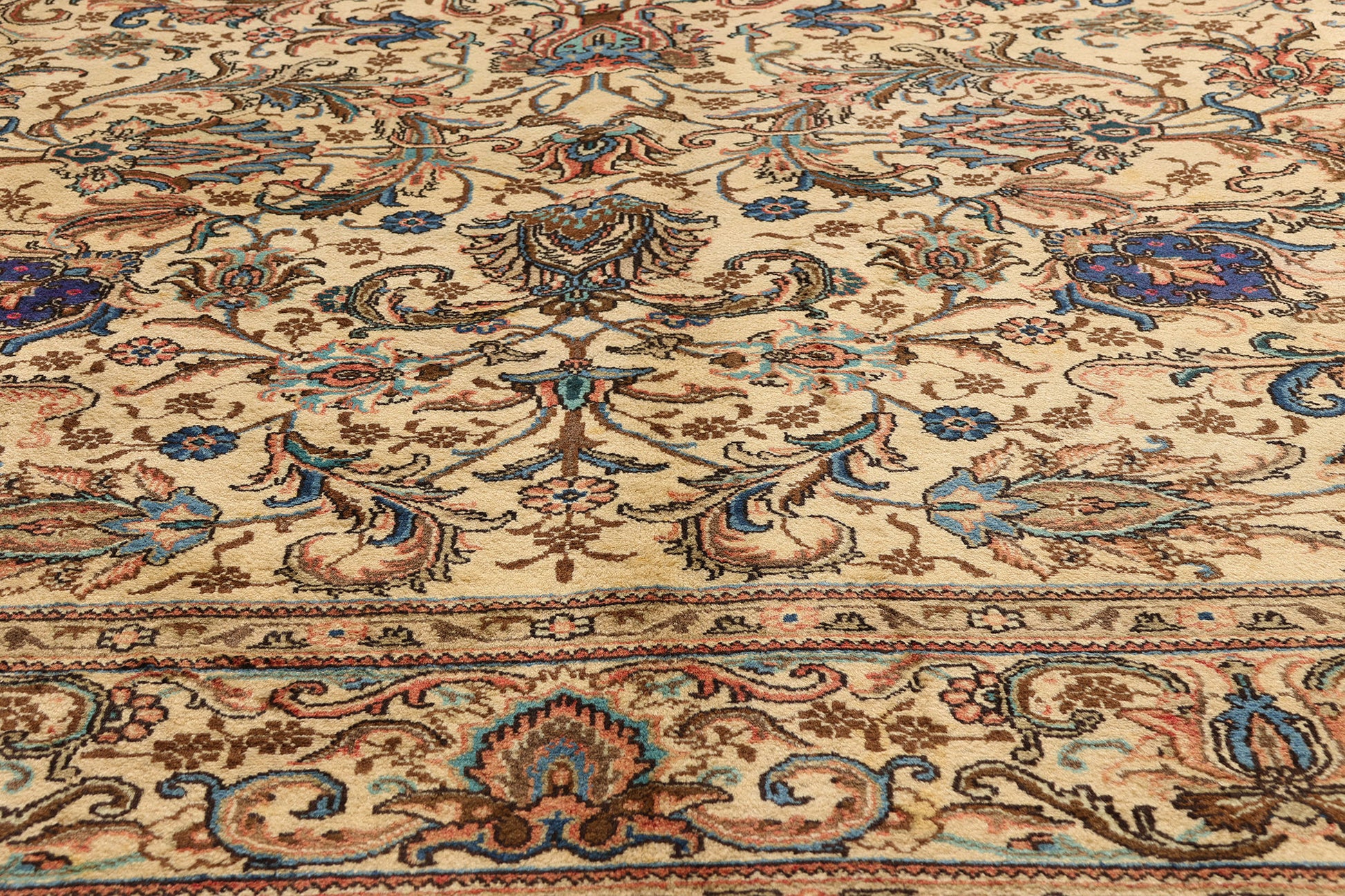 The allover floral composition is a lyrical garden of blooming palmettes, lotus blossoms, peonies, lilies, tulips, rosettes, and curled Saz leaves, all entwined in a dance of acanthus scrolls and arabesque vinery. Every signature motif is a tribute to nature's elegance, meticulously woven to echo the ornamental sophistication of Persia’s golden artistic epochs. This symphony of organic forms speaks to the soul of the collector—one who reveres beauty as both object and ideal.