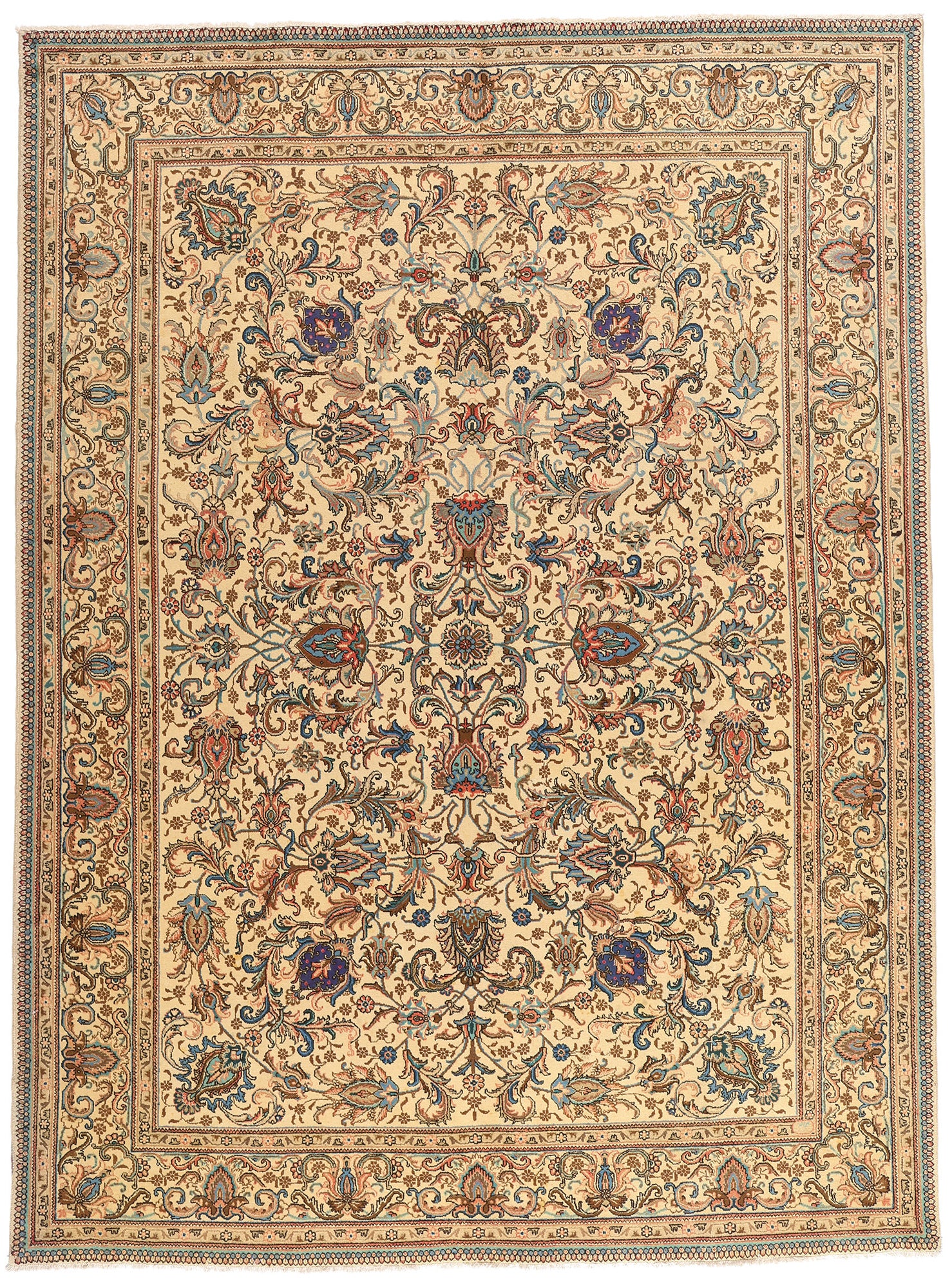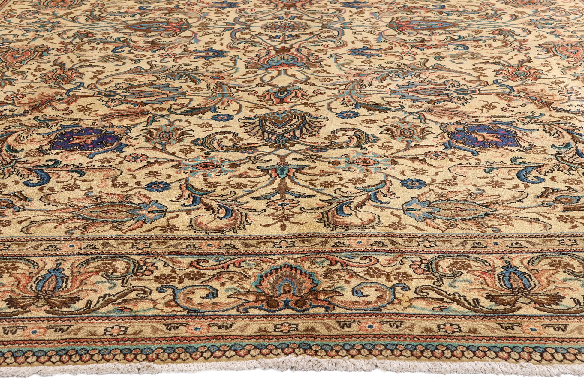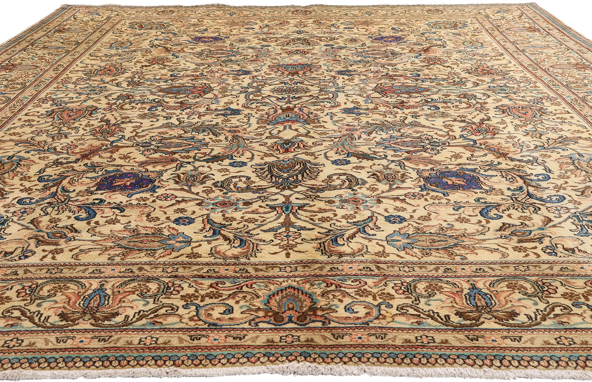 A triumph of classical design and Persian cultural heritage, this hand-knotted wool vintage Tabriz rug offers an experience rooted in rarity, refinement, and the legacy of masterful artisanship. Set against an ivory field that radiates light and airiness, this extraordinary masterpiece is an invitation into a world of botanical grandeur and timeless luxury—crafted not merely to adorn, but to elevate.