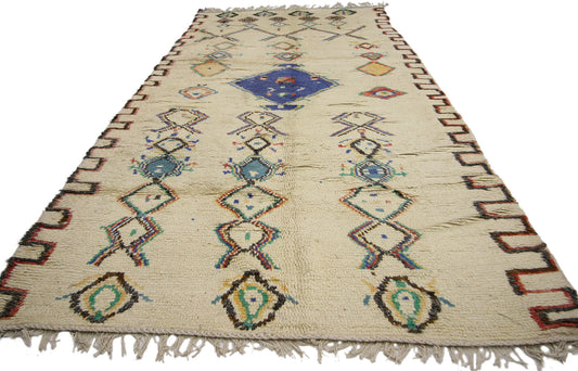 - Azilal Rugs: Azilal rugs are known for their vibrant and colorful designs, featuring abstract geometric patterns and bright, contrasting colors on a natural wool base or beige background.