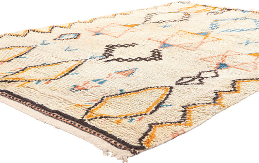 - Azilal Rugs: Azilal rugs are known for their vibrant and colorful designs, featuring abstract geometric patterns and bright, contrasting colors on a natural wool base or beige background.