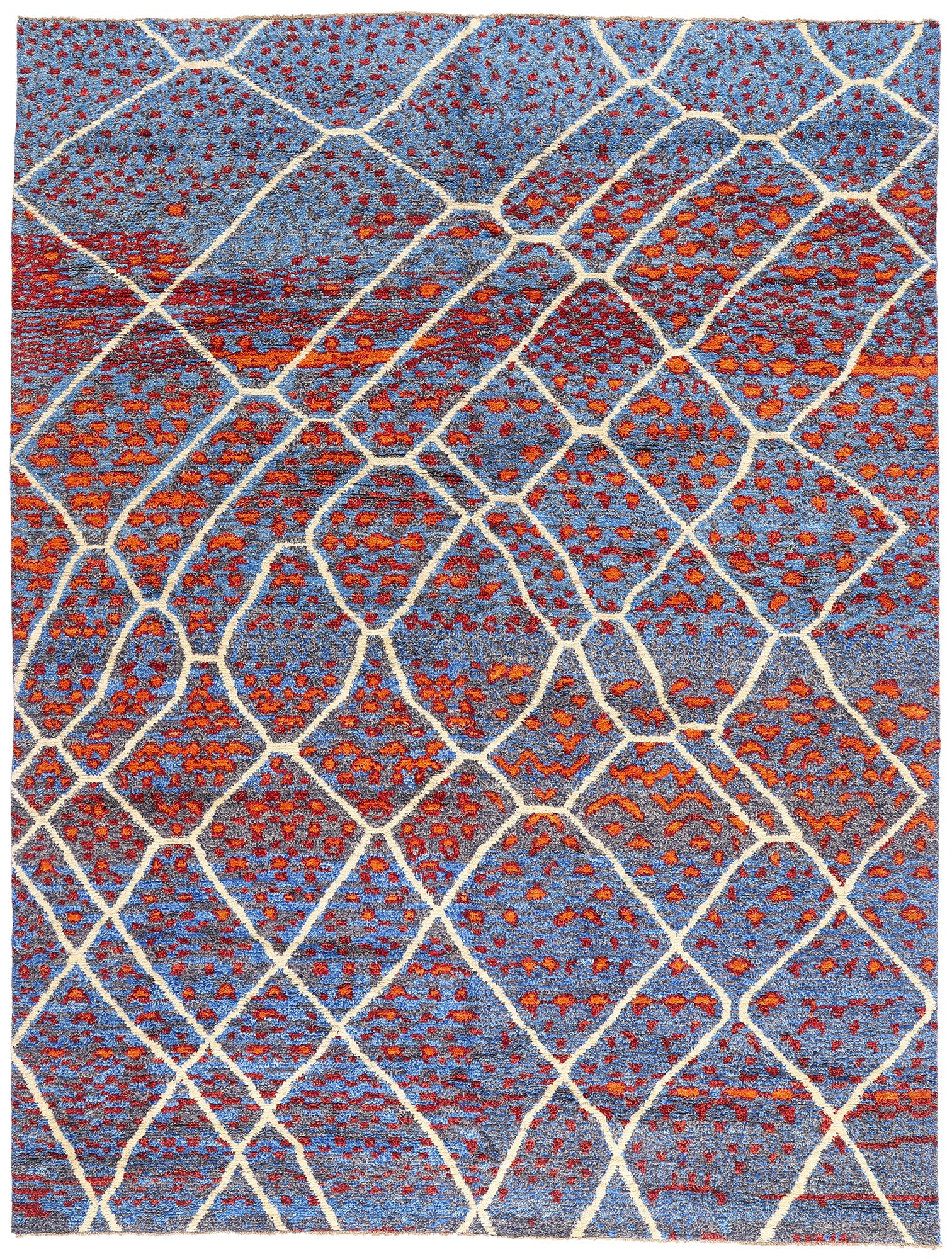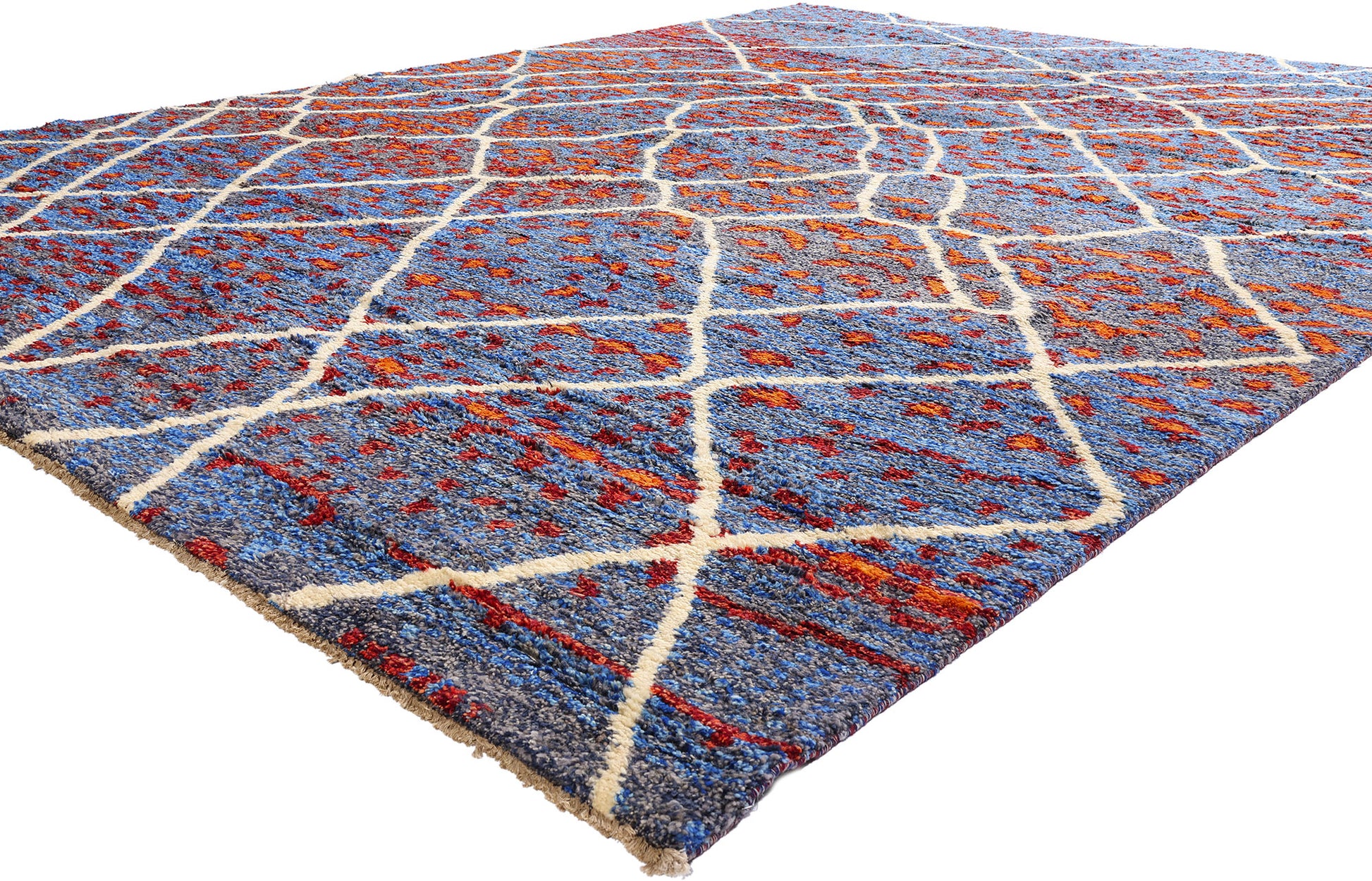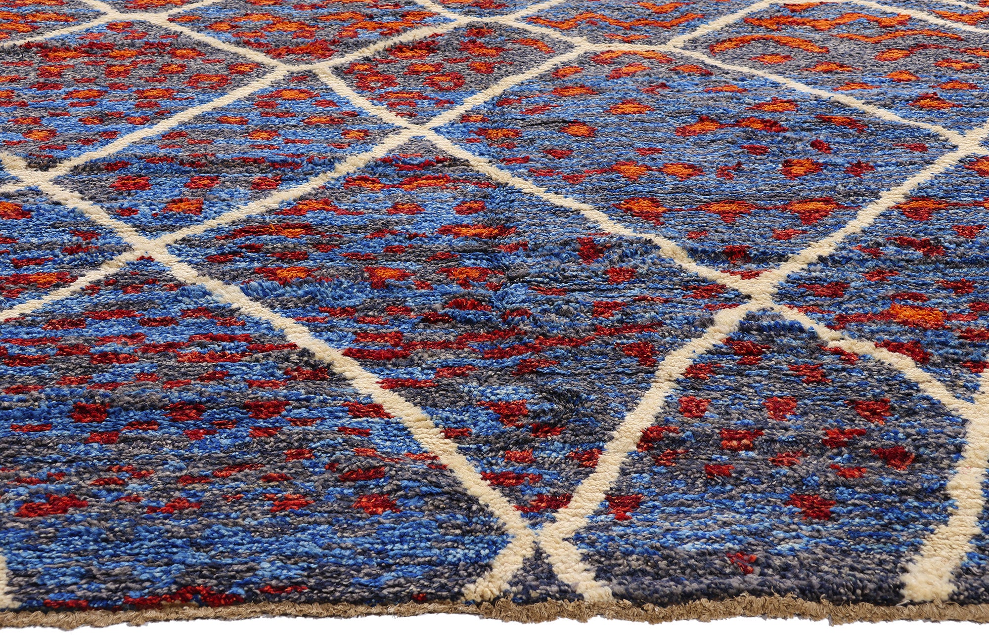 Step into a world where tradition collapses into modernist ecstasy—where tribal geometry is reborn through the visual language of avant-garde art. This exceptional hand-knotted wool Moroccan rug, crafted in Pakistan, is not merely a textile but a visual symphony of chromatic rhythm and sculptural tactility. The signature latticework, woven in ivory against a canvas of cobalt and vermilion, creates an ever-shifting cartography—a living map of memory, abstraction, and sensory delight. Every precious knot speaks to a convergence of worlds: old and new, organic and intellectual, sacred and ecstatic.
