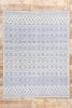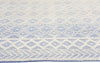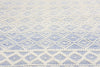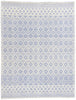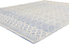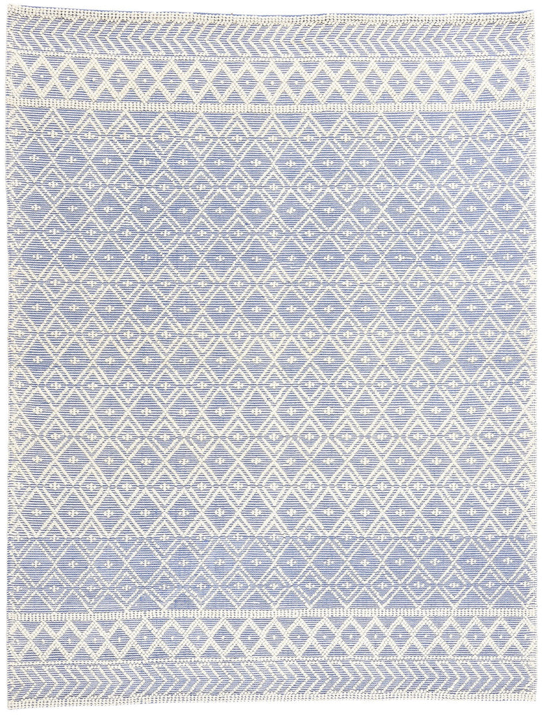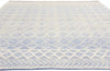 The rug's design is composed of interlocking diamond motifs, each carefully crafted to form a harmonious and balanced pattern. The soft blue and ivory-beige hues blend seamlessly, evoking a sense of calm and tranquility. The pattern is framed by a series of smaller geometric shapes that create a beautifully intricate border, adding a touch of refinement to the overall design. This combination of shapes and colors results in a sophisticated and timeless piece that can enhance any living space.