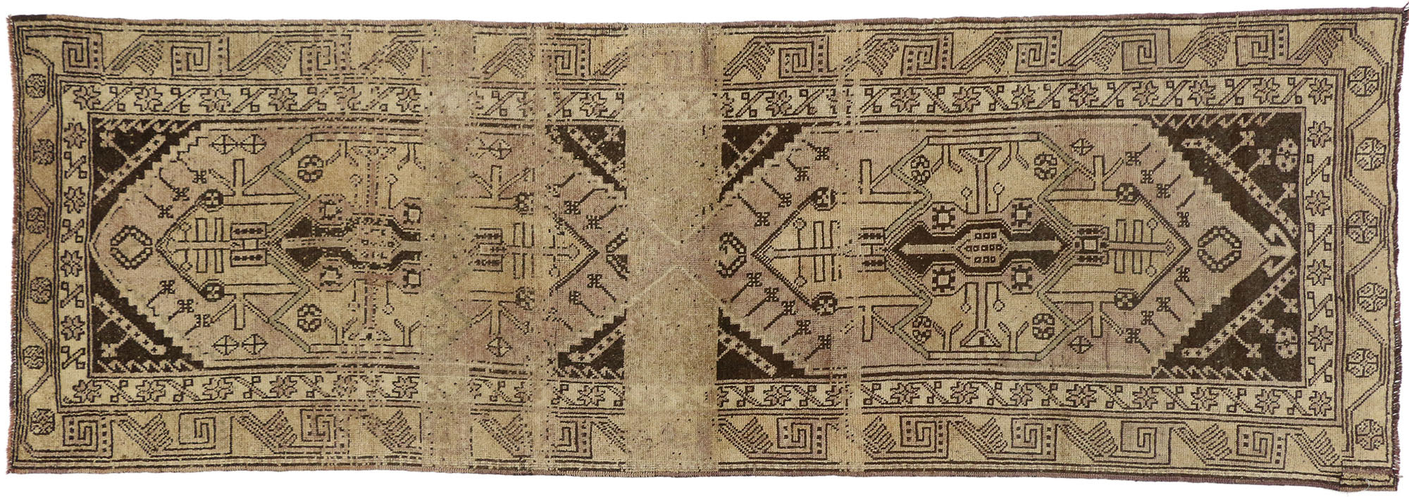 50749 Vintage Turkish Oushak Carpet Runner with Mid-Century Modern Style 03'06 x 10'07. Warm and inviting, this hand knotted wool vintage Turkish Oushak runner beautifully embodies Mid-Century Modern style. It features two large-scale mirrored hexagonal amulets highlighting an all-over rectilinear pattern composed of ambiguous Anatolian symbols. It is enclosed with a rectilinear meander border flanked with an inner geometric star guard border. The limited color palette based around soft neutrals is highly versatile, while also giving the piece a pleasant and calming sensibility This rustic vintage Turkish Oushak runner would be a charming and stylish addition to any space. Rendered in muted hues and variegated shades of tan, coffee, ecru, sand, beige, lavender, mauve and light gray with other accent colors. Perfect for a hallway, alcove, small space, mudroom, long stair landing, galley kitchen, corridor, grand foyer, designer entryway, home office, private library, conservatory, wine cellar, executive suite, grand parlor, theater room, royal suite, billiards room, game room, bedroom, study, sitting room, sunroom-- or it would make a lovely accent next to a buffet in a dining room, behind the sofa table in the living room, or by a vestibule in a hotel lobby. Well-suited for a wide range of interior styles: Mid-Century Modern, Belgian, Shaker, Amish, Traditional, Manor House, English, Tudor, Arts & Crafts, English Cottage, Craftsman, Bungalow, Artisan, Rustic, Mission, Lodge, Cabin, Urban, Industrial, and Eclectic. Antique Wash. Abrash. Hand knotted wool. Made in Turkey. Measures: 03’06 x 10’07.