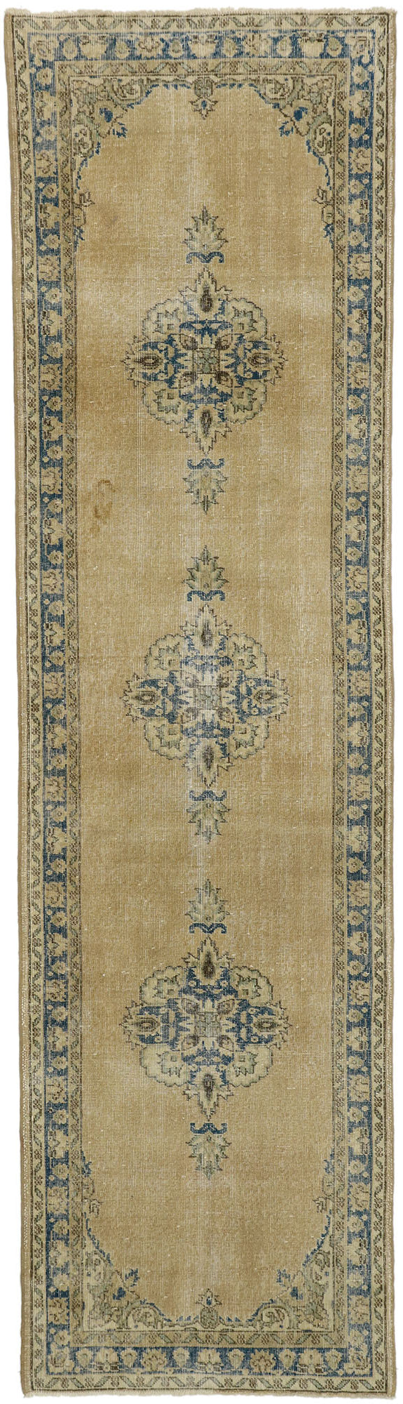 52118 Distressed Vintage Turkish Sivas Runner with Gustavian Farmhouse Style 03'04 x 11'11. This hand-knotted wool distressed vintage Turkish Sivas runner features three stylized medallions patterned and anchored with blooming palmettes. It is framed with delicate frondescent corner spandrels and a botanical border flanked with inner and outer meander guard bands. With its light and airy colors combined with cozy casual living, this distressed vintage Sivas runner creates an inviting atmosphere with its relaxed yet formal style. Enclosed in a meandering vine and palmette border on blue background, this classic Sivas carpet runner will add a touch of class and vintage shabby chic to nearly any space. Perfect for a hallway, corridor, kitchen, long foyer, entryway, stair landing, home office, private library, nook, parlor, small sitting area, vestibule, or it would make a lovely accent in a living room, bedroom, dining room, front room, great room, state room, family room, studio, study, loft, and lounge. Well-suited for period interior styles: Shabby chic, French, Victorian, Rococo, French Provincial, Gustavian, Swedish Farmhouse, Rustic Feminine, French Cottage, or European Country. Rendered in variegated shades of tan, sand, ecru, beige, taupe, almond, navy blue, and celadon with other accent colors. Distressed. Desirable Age Wear. Abrash. Hand knotted wool. Made in Turkey. Measures: 3'4 x 11'11.