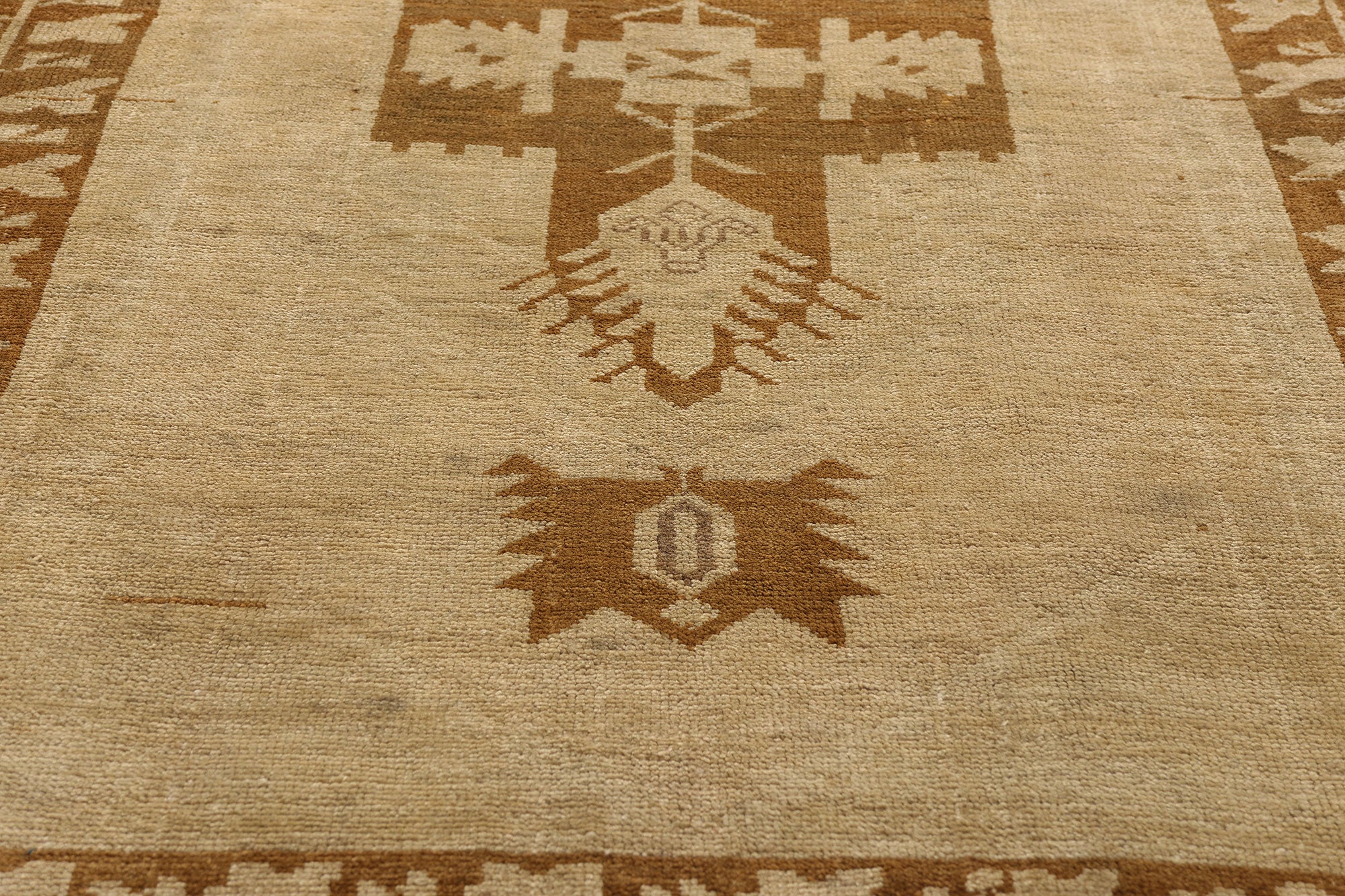 At the heart of the runner, monumental cross-shaped medallions radiate a dignified geometry, their stepped contours and finial flourishes echoing the silhouettes of Anatolian fortresses and divine guardians. Each motif is steeped in symbolic gravitas, invoking protection, direction, and the sacred meeting point of heaven and earth. The warm, golden ochre and parchment palette renders these bold symbols with regal subtlety, offering a contemporary sensibility while preserving their ancient voice. It is a composition of confidence—neither ornamental nor austere, but ceremonially composed.