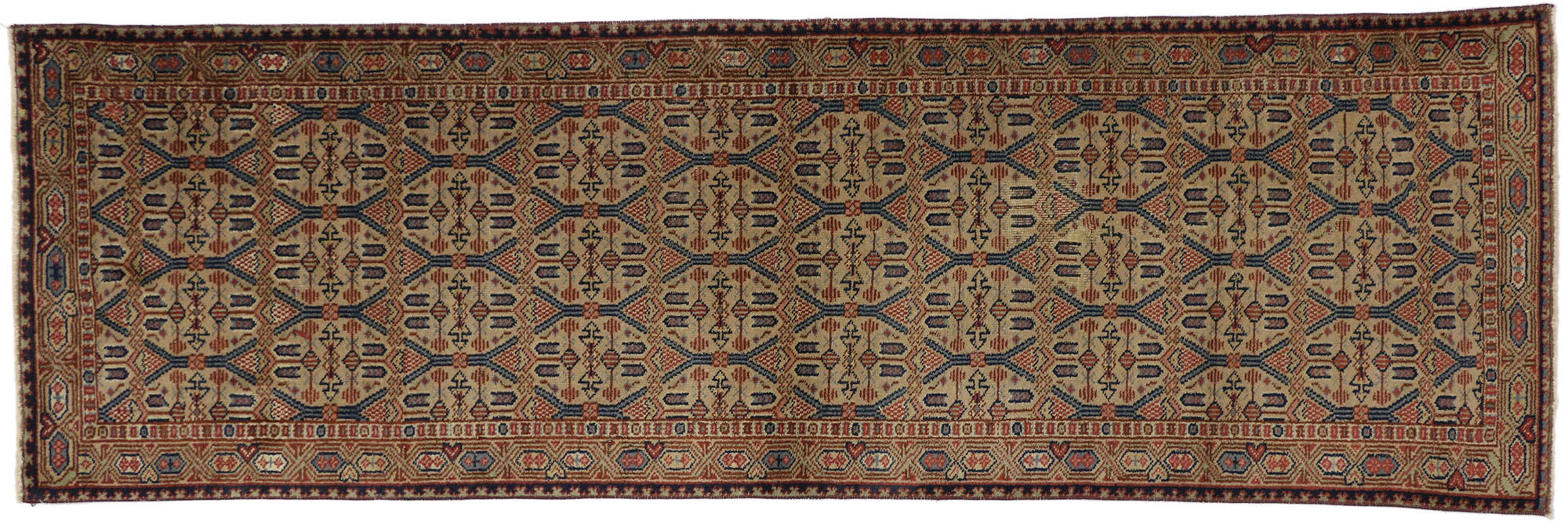 51338 Vintage Turkish Oushak Hallway Runner with Rustic Art Deco Style 02'09 x 08'08. Delicate yet bold, this hand-knotted wool vintage Turkish Oushak runner displays a geometric lattice pattern composed of symbolic Anatolian tribal motifs. Enhanced by its particularly soft and lustrous wool, this vintage Oushak runner highlights its alluring patina. The time-softened tones and fascinating tribal motifs contribute to the overall magnificence of this Oushak hallway runner, while the geometric designed border creates an impeccable frame to enclose this captivating work of art. Rendered in variegated shades of ecru, tan, sand, beige, brown, coffee, sky blue, navy blue, rose, baby blue, sage, brick red, and terra cotta with other accent colors. Perfect for a hallway, stair landing, open hall or long entry, kitchen, corridor, private library, den, mudroom, study, home office, sitting room, bathroom, grand foyer and designer entryway, or it would make a lovely accent to a living room, bedroom, hotel lobby, or long vestibule. Well-suited for a wide range of interior styles: Traditional, Eclectic, Modern, Mid-Century Modern, Arts & Crafts, Craftsman, Contemporary, Industrial, Rustic, Lodge, Tudor, neoclassical, English Country, Bungalow, Manor House, Art Deco, Primitive and Tribal. Desirable Age Wear. Abrash. Hand-knotted wool. Made in Turkey. Measures: 02'09 X 08'08.
