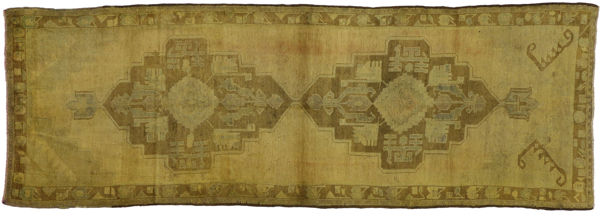 Emanating grace and sophistication, this hand knotted wool vintage Turkish Oushak rug showcases a refined Mid-Century Modern style. The abrashed golden camel colored field features two large-scale cusped medallions anchored with palmette pendants at either end. Angular snake motifs grace two of the corner spandrels. It is enclosed with a rectilinear botanical border flanked with an outer guard band. The warm earth-tone colors in this vintage Oushak rug balance out spaces with bolder colors and dark architectural elements allowing a space to transition from casual to luxurious, without sacrificing comfort.