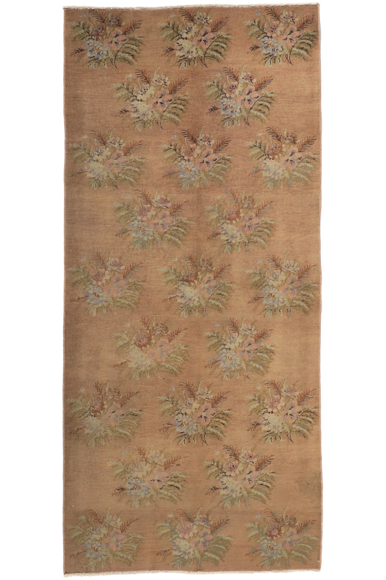 In a delightful union of Artisan and Cottagecore styles, this hand-knotted wool vintage Turkish Sivas rug runner whispers tales of timeless beauty. The careful blending of handcrafted natural materials from the Artisan aesthetic harmonizes perfectly with Cottagecore's love of florals and rustic finishes. Against a warm brown backdrop, floral bouquets joyfully dance across the field, their rhythmic sway creating a mesmerizing allover pattern.