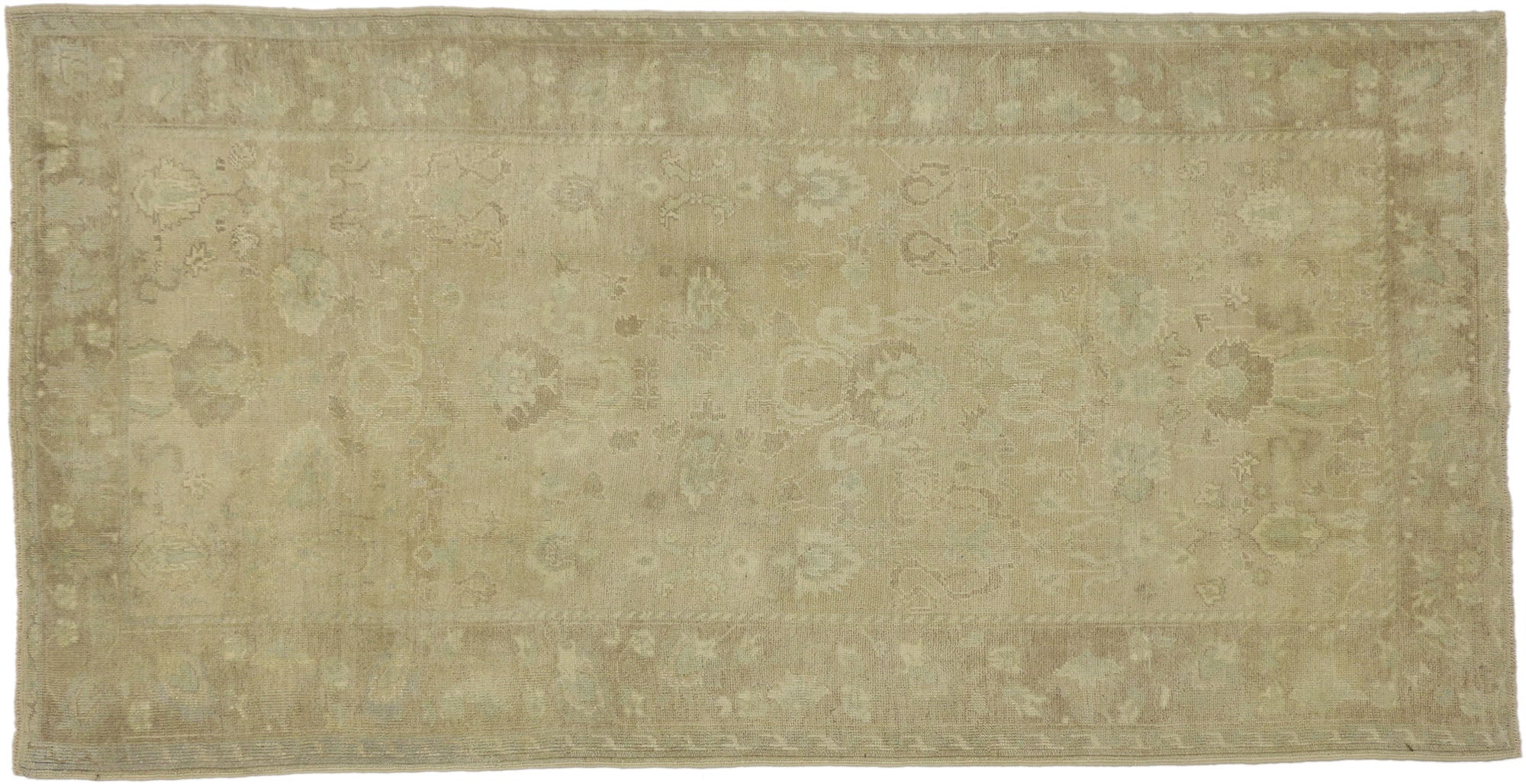 Effortless beauty and soft, bespoke vibes meet minimalist French Country Cottage style in this hand knotted wool vintage Turkish Oushak rug. The abrashed tan field is covered in an all-over geometric botanical pattern composed of Harshang motifs, blooming palmettes, cloudbands, leafy tendrils, stylized florals, and amorphous organic shapes. It is enclosed with a palmette border flanked with an inner barber pole guard band and outer running water guard border. Emanating timeless appeal and inimitable warmth in subdued colors, this vintage Oushak rug is the answer to sophisticated, upscale design furnishings with a calming ambiance.