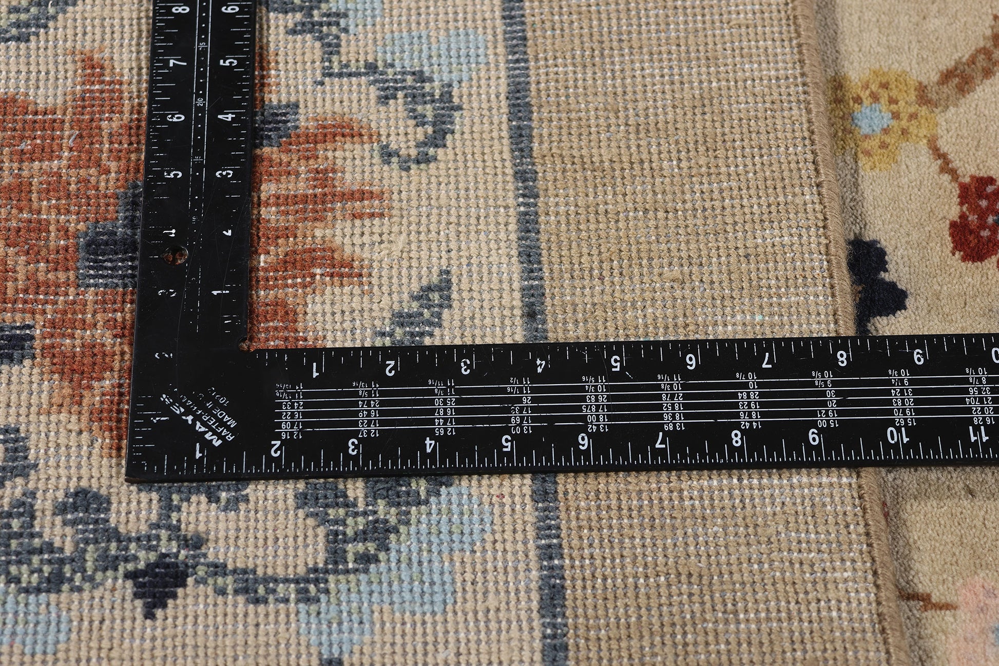 Framing this poetic tableau is an ornate border adorned with scrolling vine motifs, chrysanthemums, and peonies, meticulously woven in soft blues, warm terracotta reds, and golden ochre hues. The chrysanthemum, emblematic of longevity and wisdom, is a flower deeply intertwined with autumn’s reflective beauty, while the peony, known as the “King of Flowers,” represents wealth, honor, and high status. These floral elements, meticulously arranged along the border, create a harmonious balance, enhancing the overall splendor of the rug while echoing traditional Chinese artistic sensibilities.