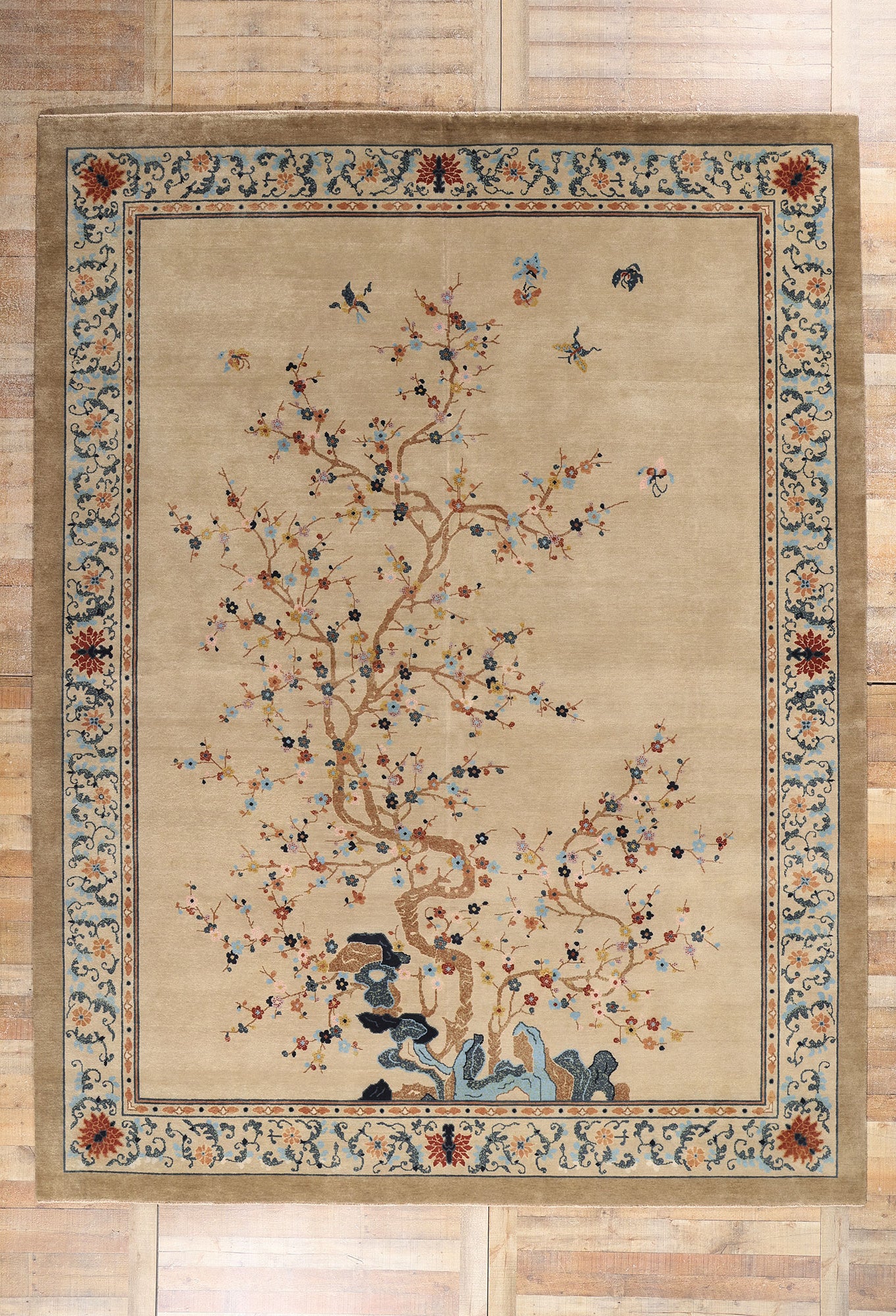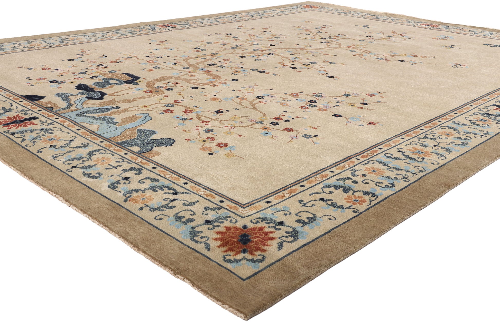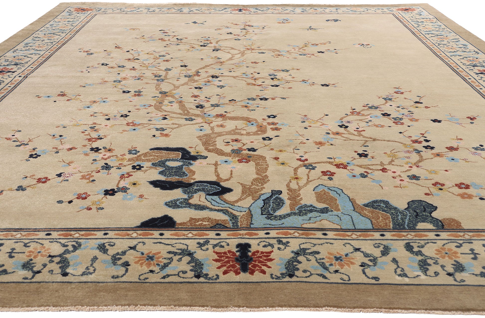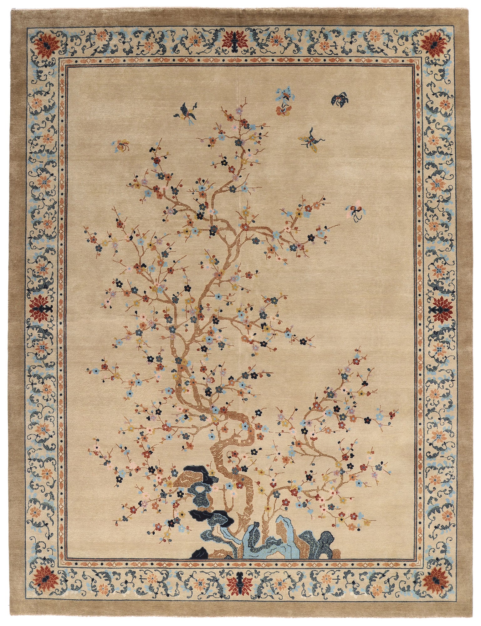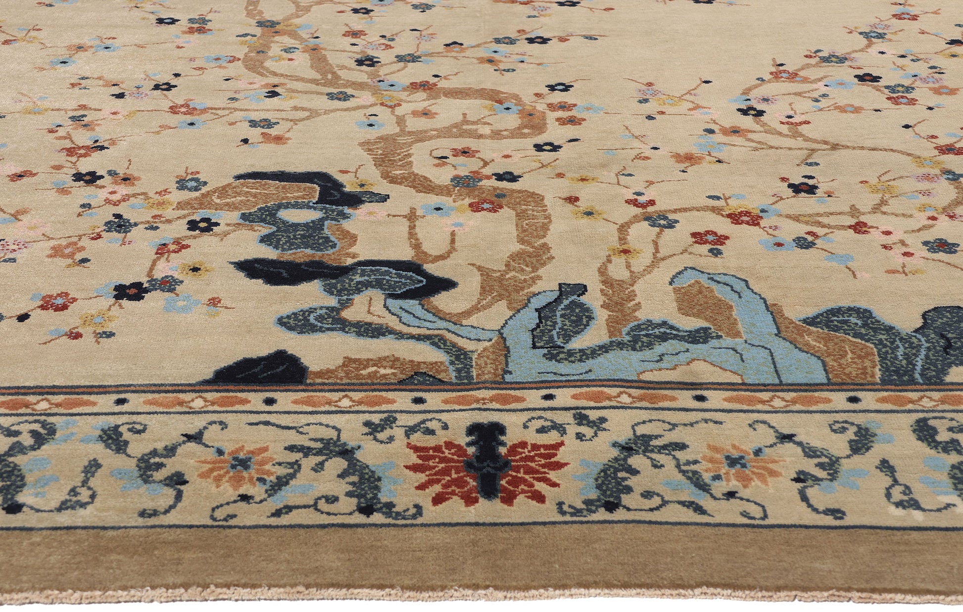 A breathtaking fusion of artistic heritage and modern craftsmanship, this hand-knotted wool Chinese Art Deco rug draws inspiration from the grandeur of early 20th-century design while embracing the delicate symbolism of Chinese culture. Originating from India, this masterpiece features a serene beige field that serves as an elegant canvas for an exquisite pictorial composition. At its heart, a gracefully winding plum blossom tree ascends from a rocky outcrop, its branches adorned with a profusion of delicate blossoms in shades of red, blue, and gold. The rhythmic movement of the tree, with its gnarled trunk and flourishing blooms, evokes a sense of tranquility and timeless beauty.