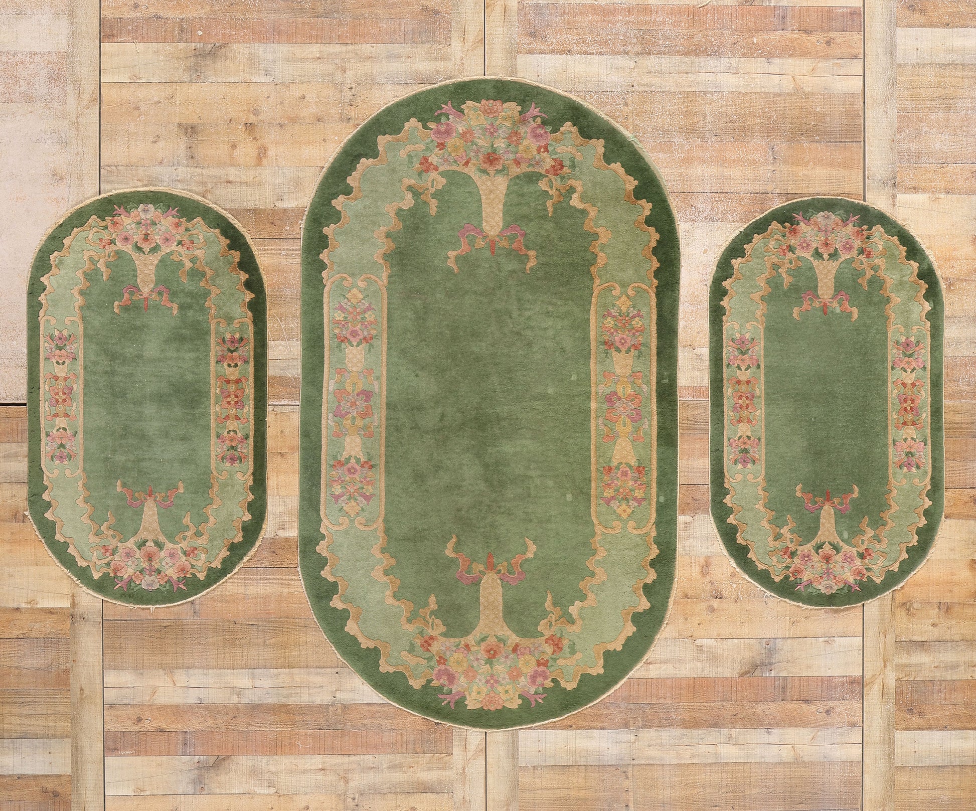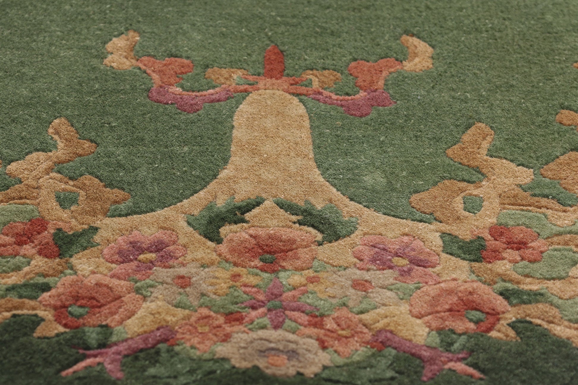 This exquisite hand-knotted wool antique Chinese Art Deco rug is a captivating example of the elegance and craftsmanship of early 20th-century Chinese rug-making. Drawing inspiration from the famed work of Walter Nichols, a key figure in the Art Deco movement, this oval-shaped rug combines traditional Chinese motifs with the streamlined elegance of Art Deco design. The lush green field serves as the perfect canvas for the decorative details that unfold along the border and within the composition, evoking a sense of grace and harmony. The unique shape of the rug adds to its charm, making it a timeless piece that would enhance any interior space.