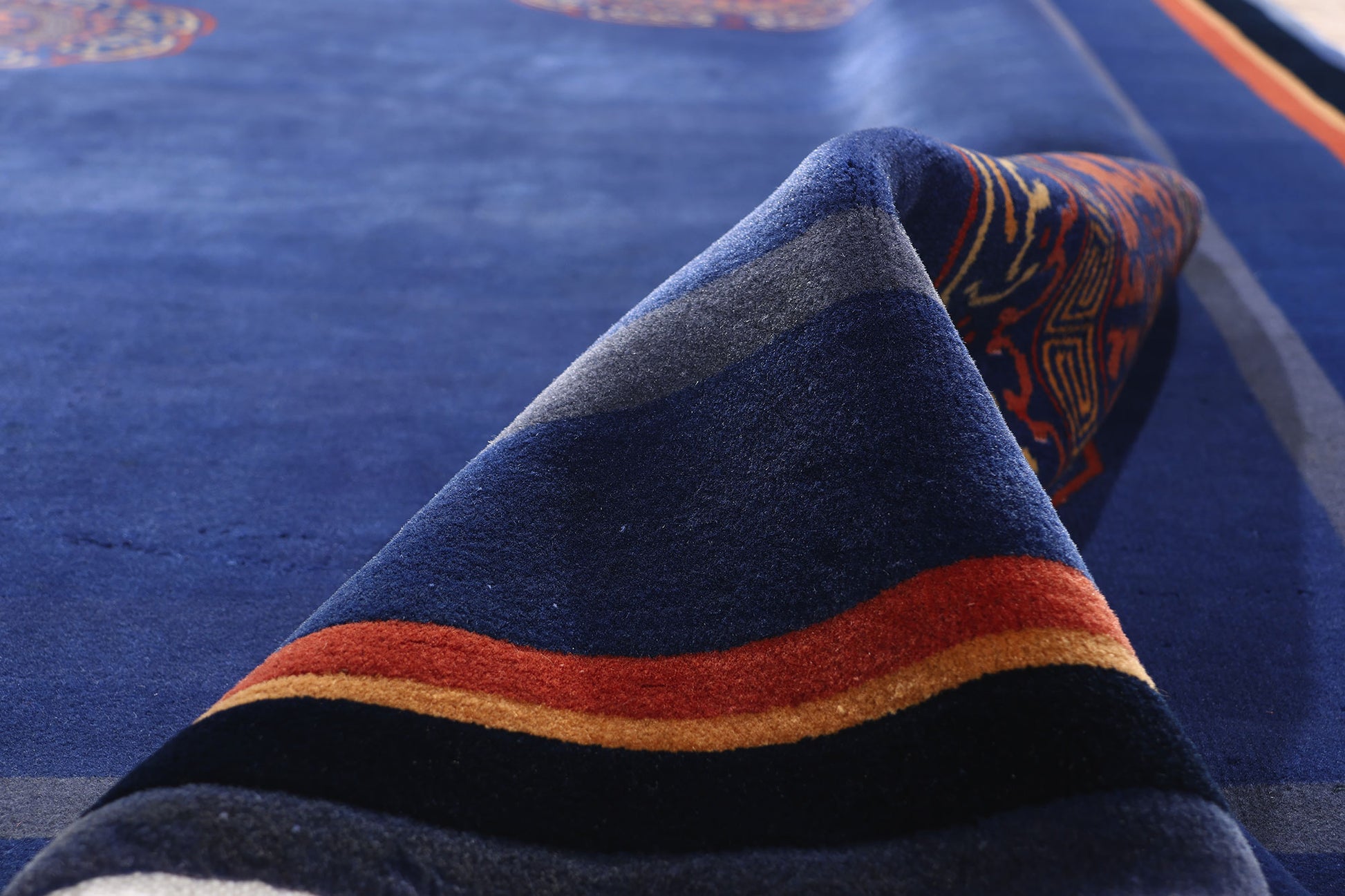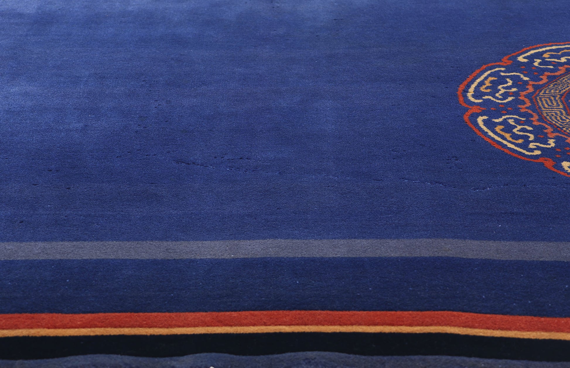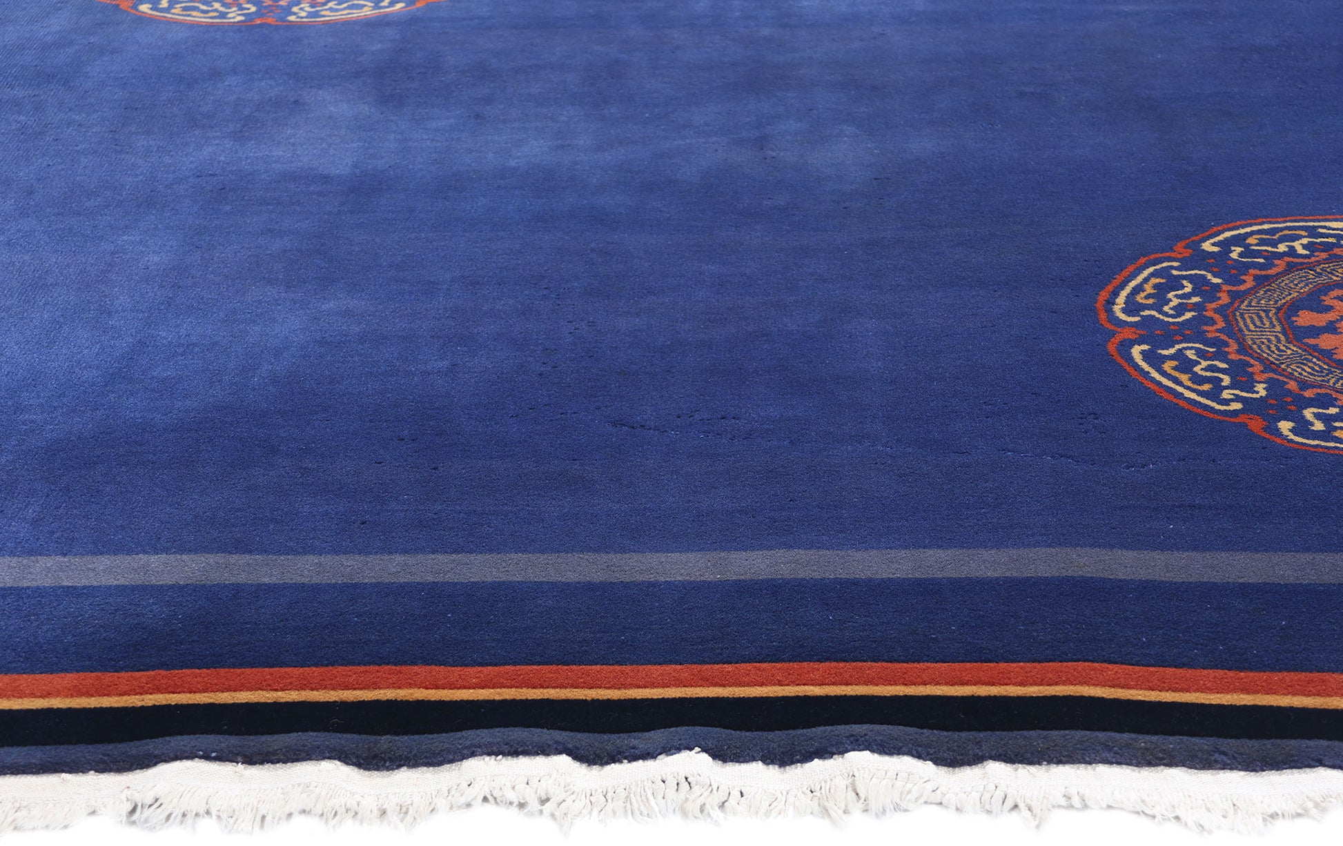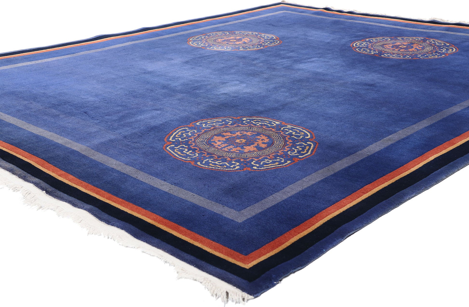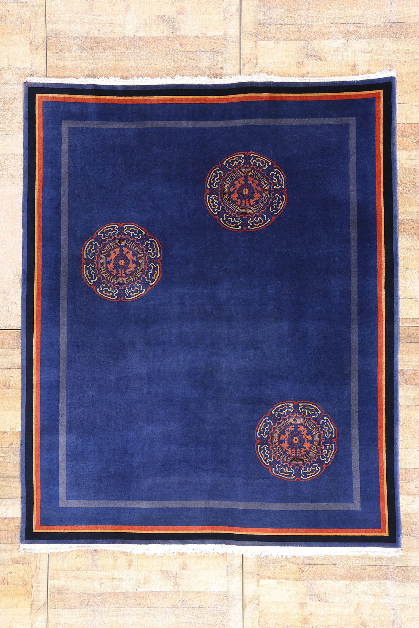 In the golden hush of the 1920's, when East met West in a symphony of style and spirit, this hand knotted wool antique Chinese Art Deco rug was born—a woven reverie crafted in the famed looms of Tianjin or Beijing. With its deep indigo blue field, it evokes the velvet hush of twilight skies over Peking’s imperial rooftops, a stillness pierced only by the whisper of silk robes and the distant chime of temple bells. Suspended across this tranquil sea are three circular medallions, blooming like celestial seals—guardians of symmetry, echoing ancient Chinese roundels reimagined through the lens of Art Deco modernism.