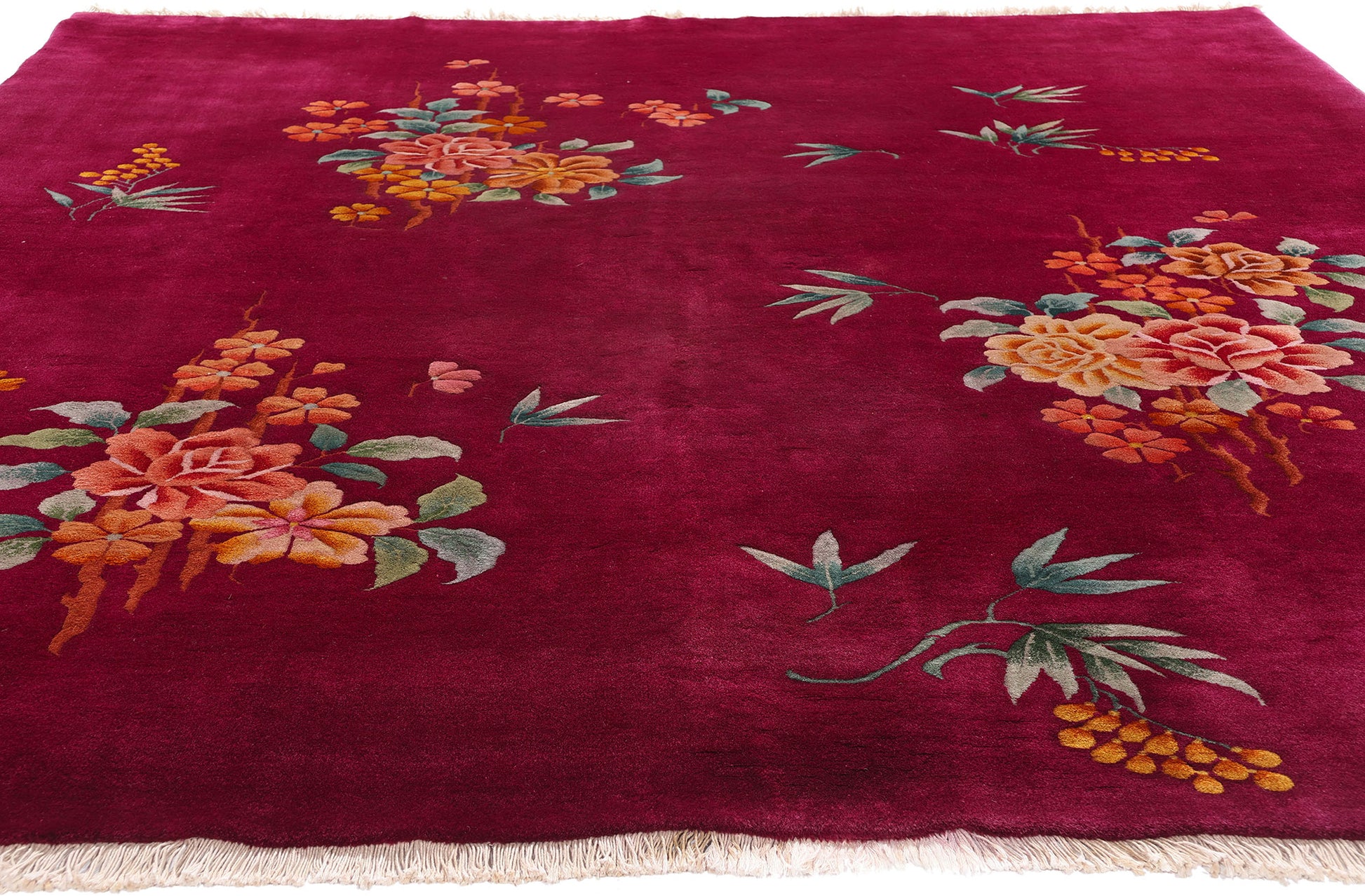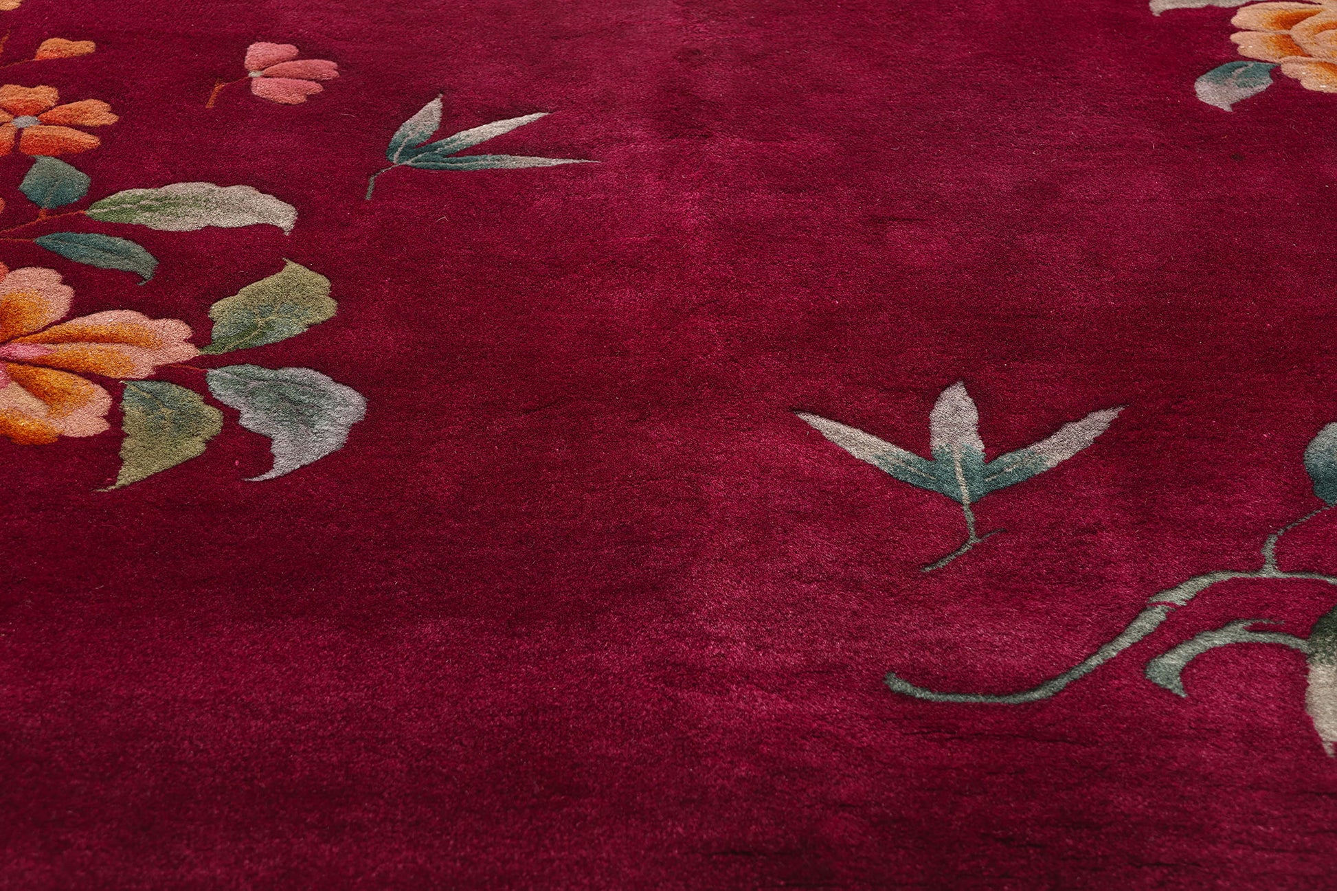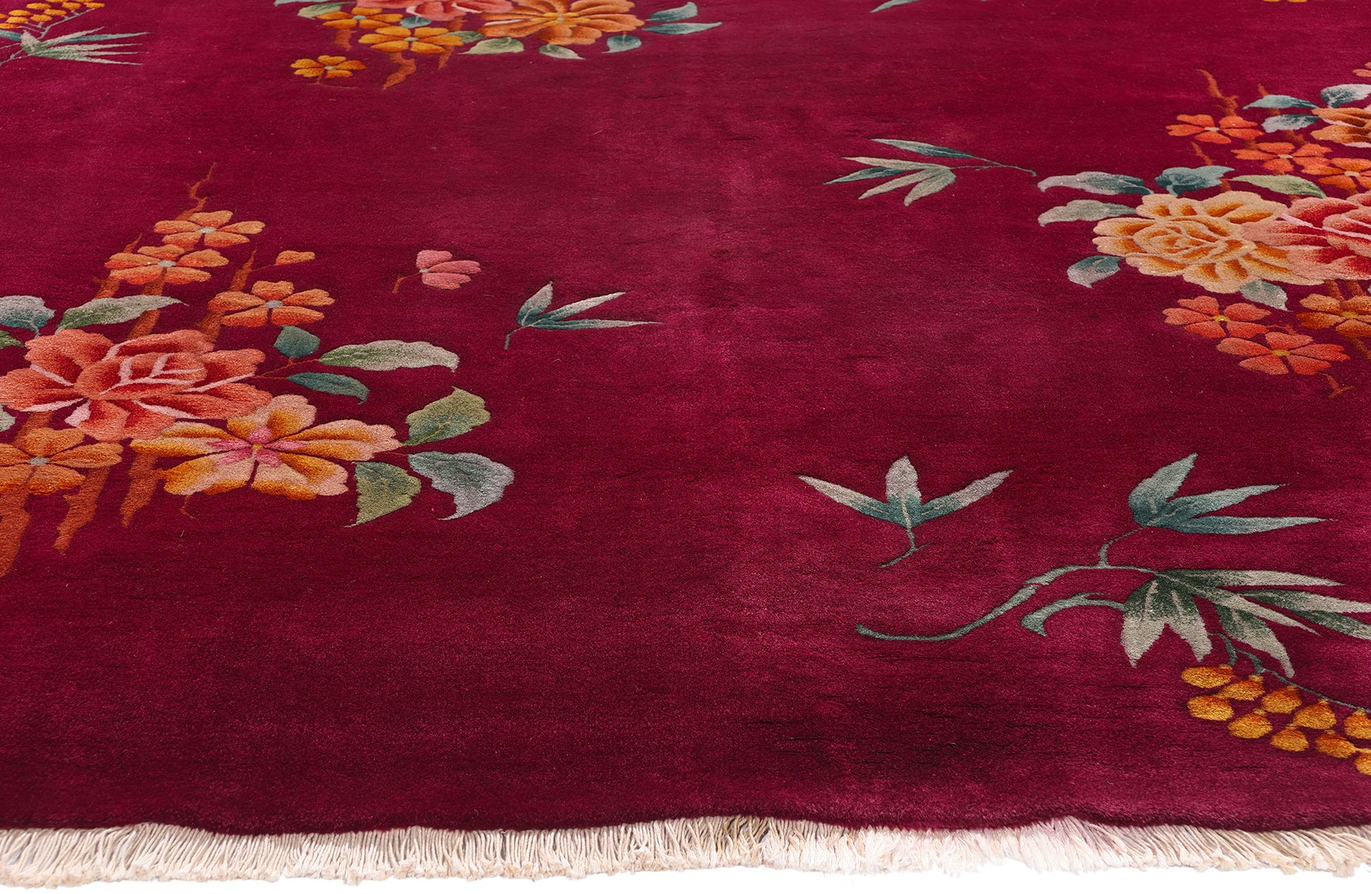 This hand-knotted wool antique Chinese Art Deco rug is a radiant example of 20th-century artistry, blending the bold aesthetics of the Art Deco movement with the timeless symbolism of Chinese culture. The deep, lustrous ruby-red field sets a dramatic stage, serving as a backdrop for an array of exquisitely rendered floral motifs. The saturated hue exudes warmth, passion, and vitality, inviting the viewer to explore its intricate details and profound cultural meanings.