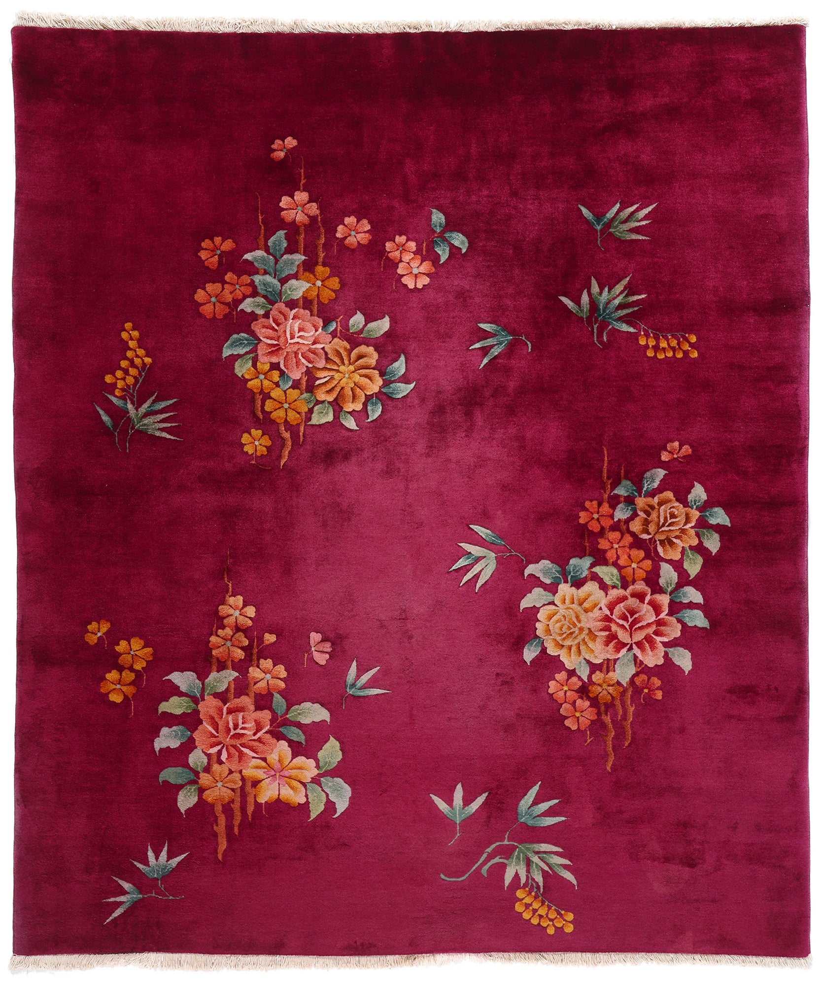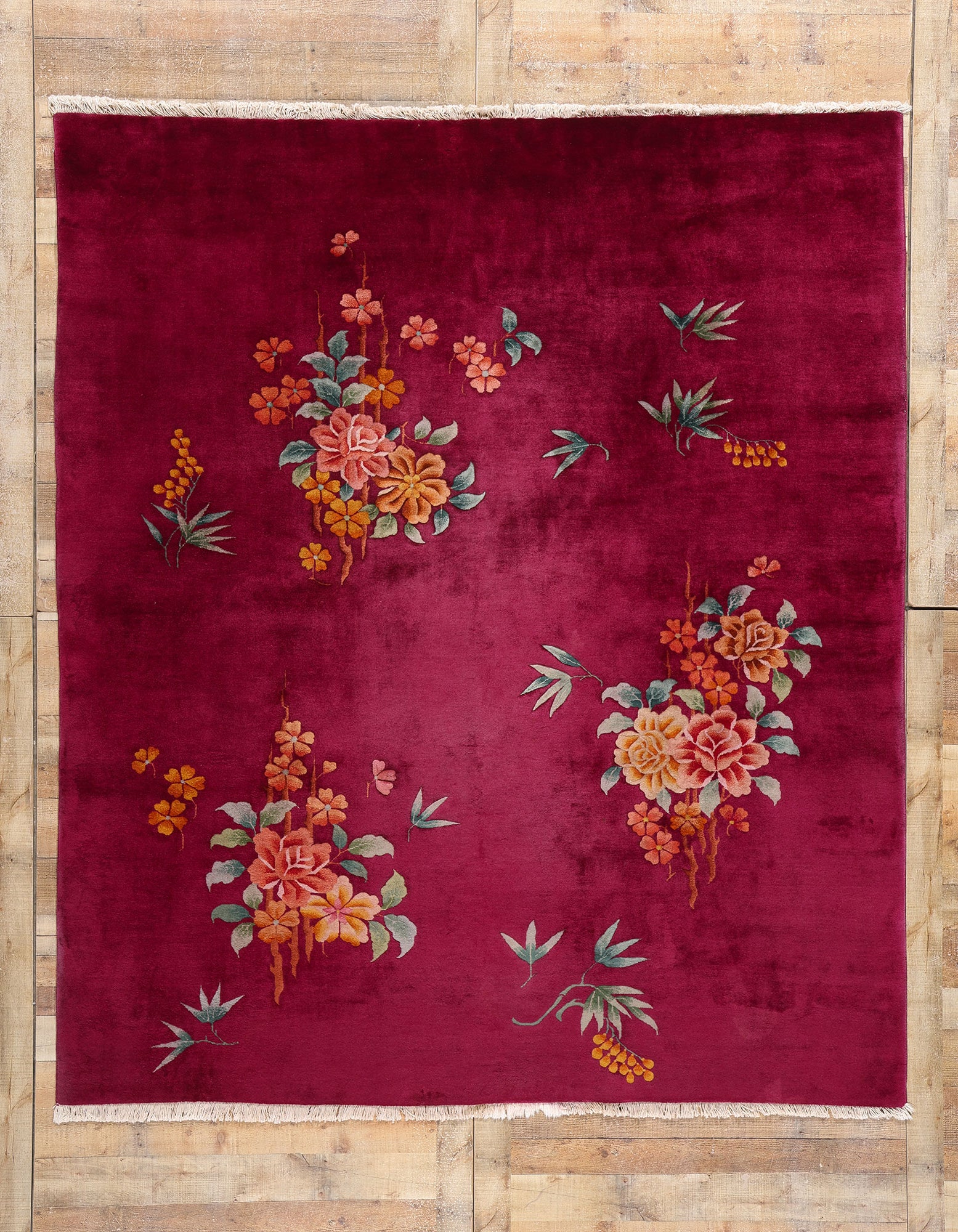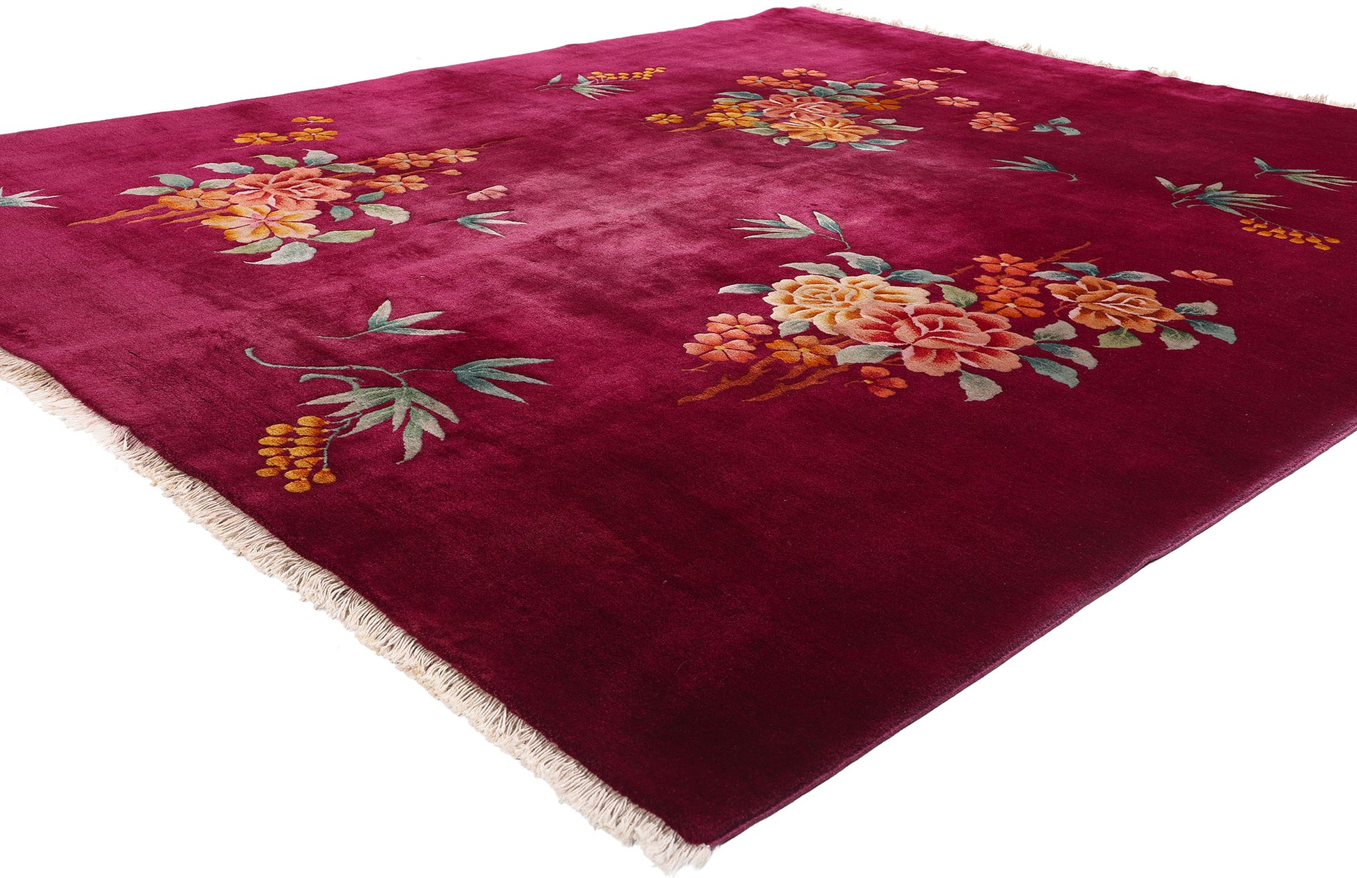 This hand-knotted wool antique Chinese Art Deco rug is a radiant example of 20th-century artistry, blending the bold aesthetics of the Art Deco movement with the timeless symbolism of Chinese culture. The deep, lustrous ruby-red field sets a dramatic stage, serving as a backdrop for an array of exquisitely rendered floral motifs. The saturated hue exudes warmth, passion, and vitality, inviting the viewer to explore its intricate details and profound cultural meanings.