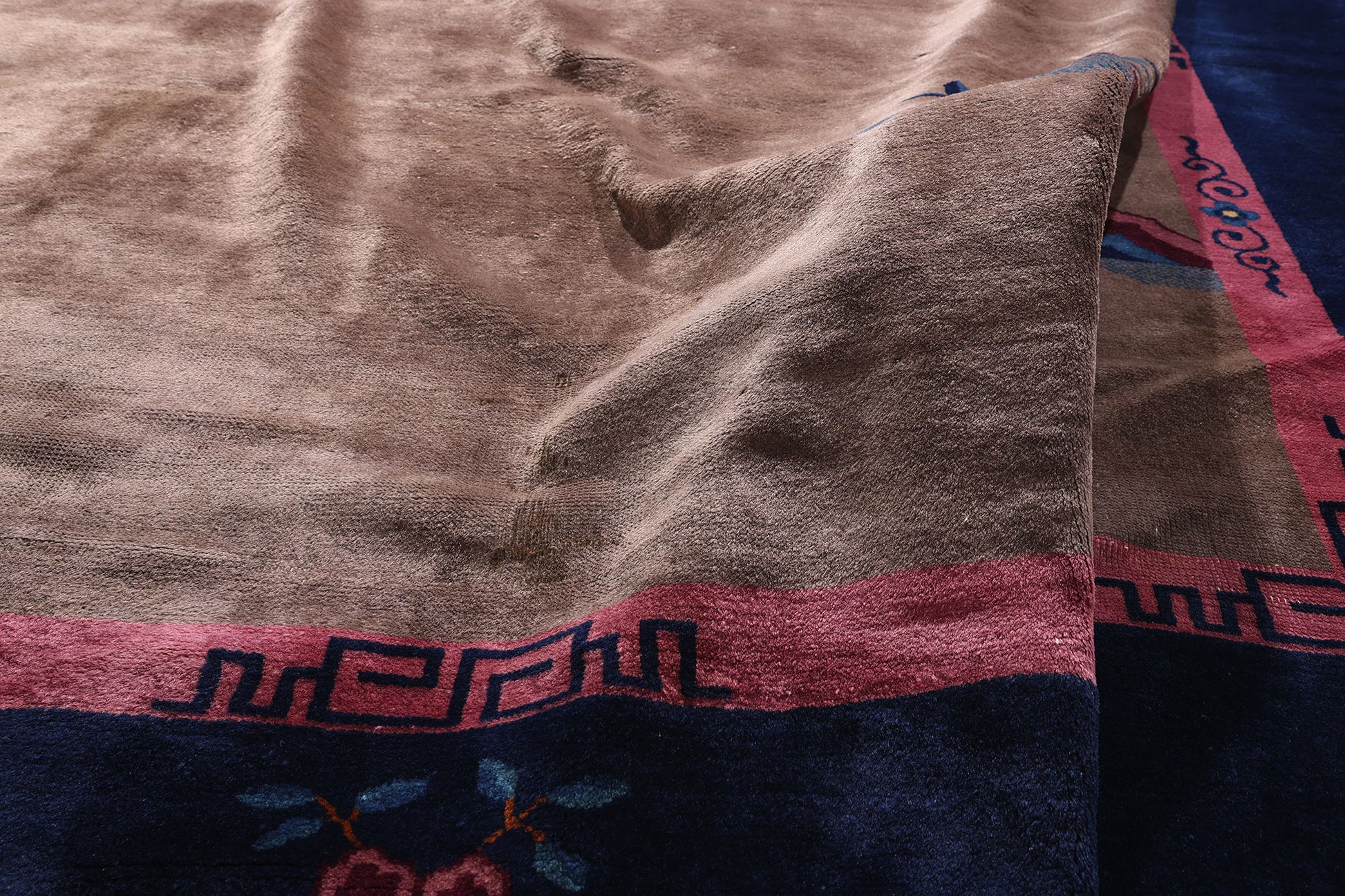 An unparalleled expression of whimsical elegance and cultural depth, this hand-knotted wool antique Chinese Art Deco rug is a rare and captivating masterpiece—a tailored expression of East-meets-Deco design reserved for the most discerning collector. With its luminous café-au-lait field encased in a midnight blue border, the rug unfolds as an immersive canvas of celestial serenity and curated symbolism. The blush pink inner border gently frames a composition both tranquil and commanding, invoking the timeless sophistication of early 20th-century Shanghai salons and the elite interiors of Art Deco-era metropolises.