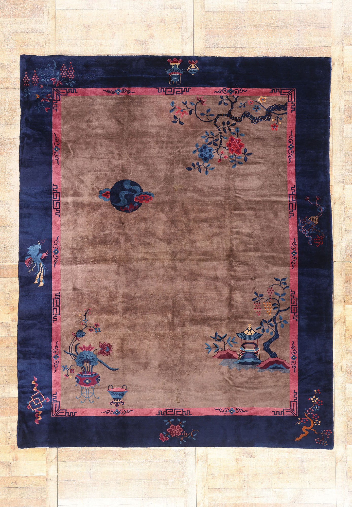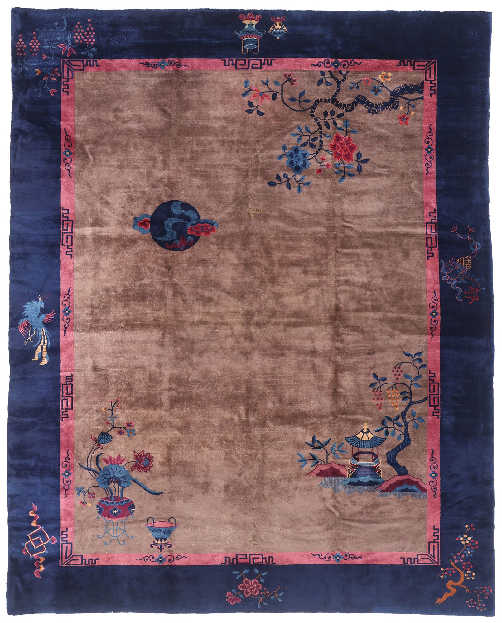 Each signature motif is meticulously arranged with impeccable attention to detail, creating a layered story rich with symbolic prestige. In the upper right corner, a flowering prunus tree—symbol of resilience and rebirth—gracefully bends toward a classical Chinese pagoda, representing harmony and scholarly retreat. Delicate floral sprays of peonies and chrysanthemums bloom with coveted beauty, each petal speaking to prosperity, longevity, and nobility. A solitary phoenix graces the left, its flowing plumage rendered in lapis and rose—a mythical creature emblematic of virtue, grace, and feminine power. This mythical bird imbues this magnificent work of art with a sense of timeless enchantment and quiet majesty.