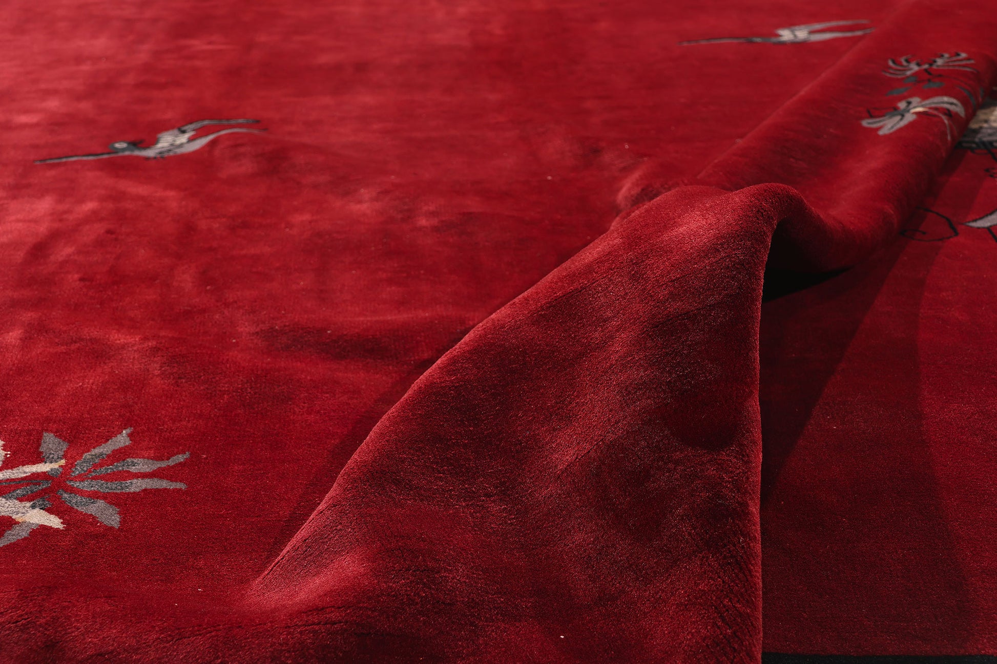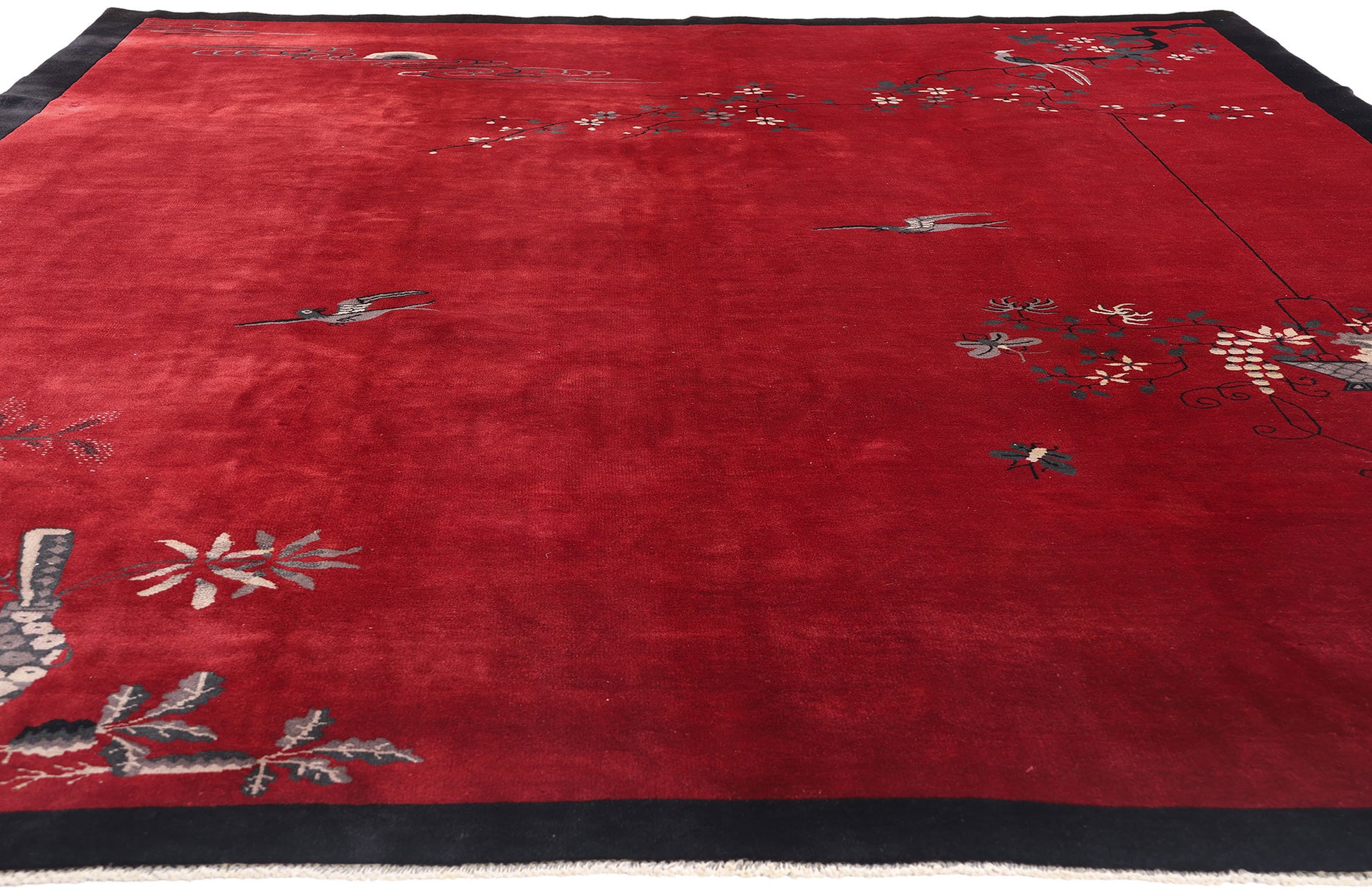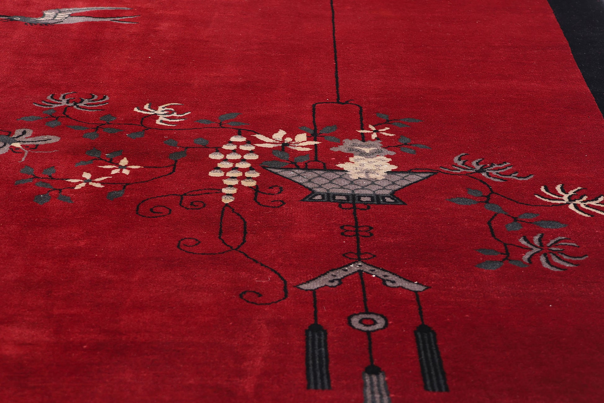 Bathed in the glow of ruby red, this hand-knotted wool antique Chinese Art Deco rug unfurls like a tranquil evening scroll, steeped in elegance and layered with symbolic beauty. Its minimal yet evocative design captures the spirit of Chinese visual poetry—a quiet narrative told through careful placement of natural and scholarly motifs. At its heart, the vast red field evokes the warmth of fading daylight, while a slim black border gently frames the scene, lending it structure without constraint. The composition flows asymmetrically, inviting the eye to wander from one moment to the next as though meandering through a garden in thoughtful contemplation.
