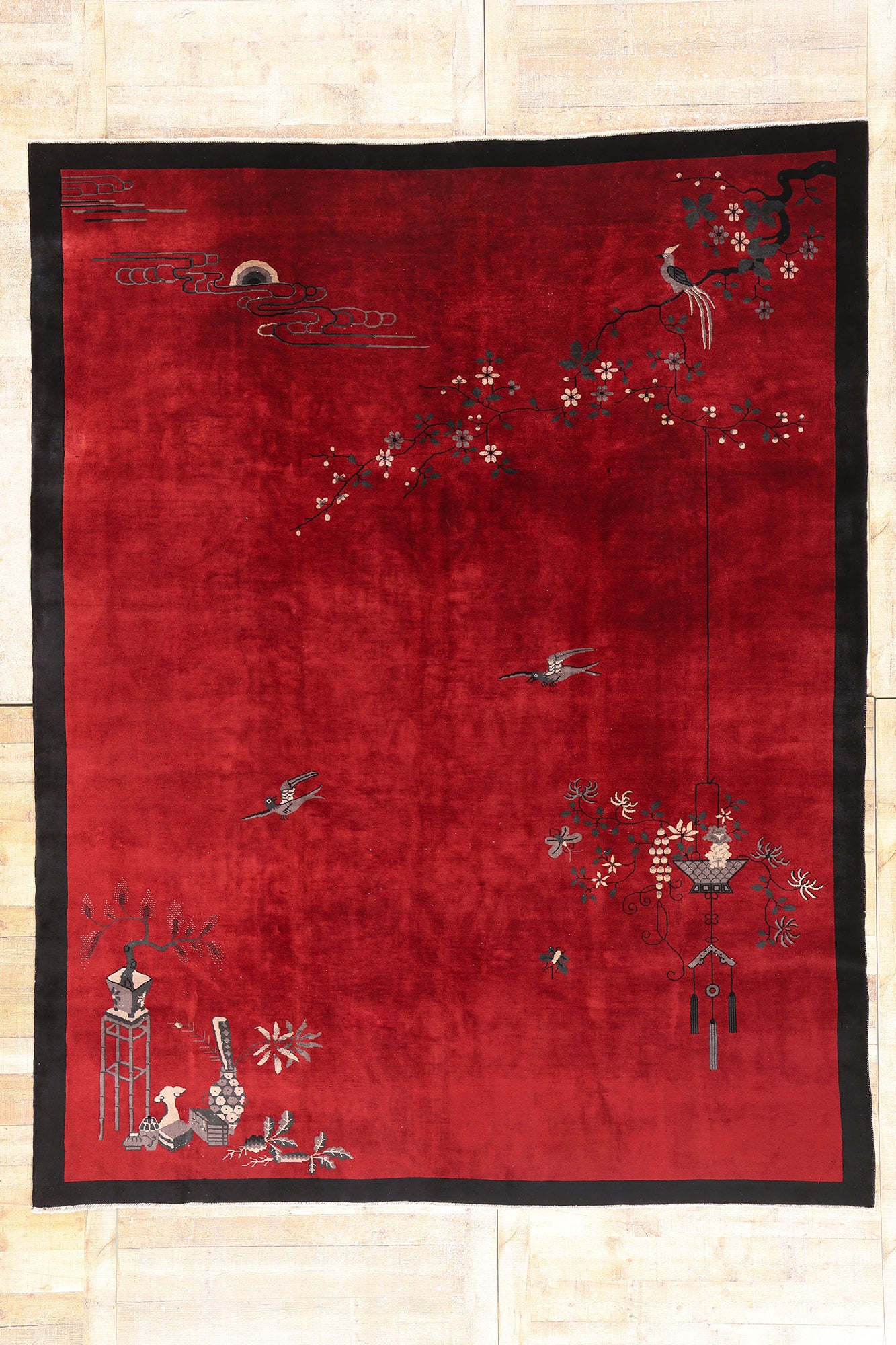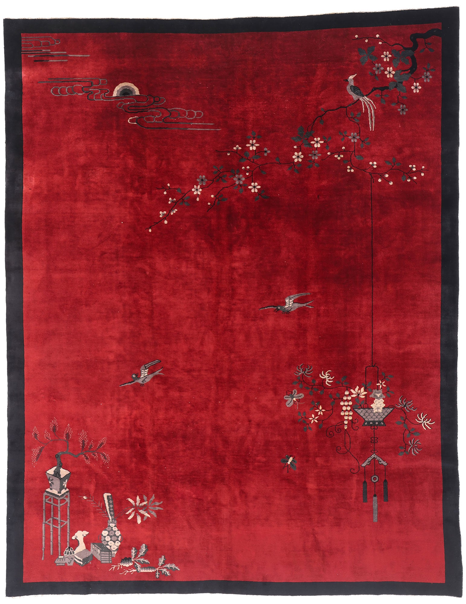 Across the lower left quadrant, an assembly of scholarly objects rests with dignified serenity: a tall pedestal, an open scroll, a brush pot, and vases brimming with flowers. These emblems of learning and cultivated taste speak to the values of Confucian refinement and artistic endeavor. Nearby, birds flit mid-flight across the expansive red field, lending the scene a gentle energy and suggestion of transience. Their elegant forms, painted with restraint, seem to hover just above the Chinese Art Deco rug’s surface, guiding the viewer's gaze from corner to corner, tying the elements together with lyrical grace. In the upper left, stylized ruyi clouds swirl beside a rising moon, symbols of harmony and wish fulfillment, hinting at celestial influence over this grounded world.