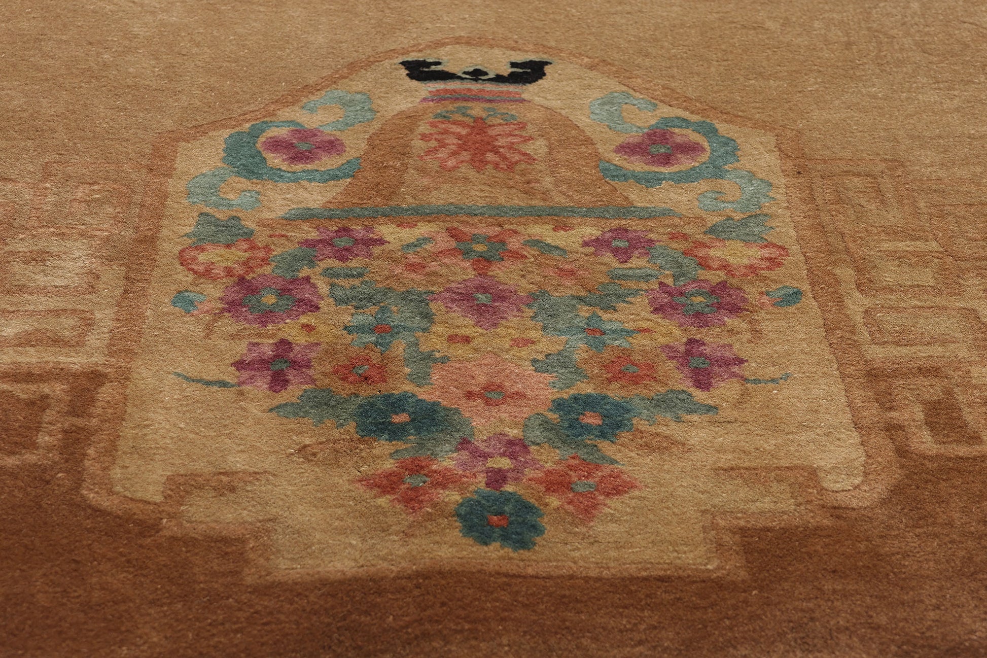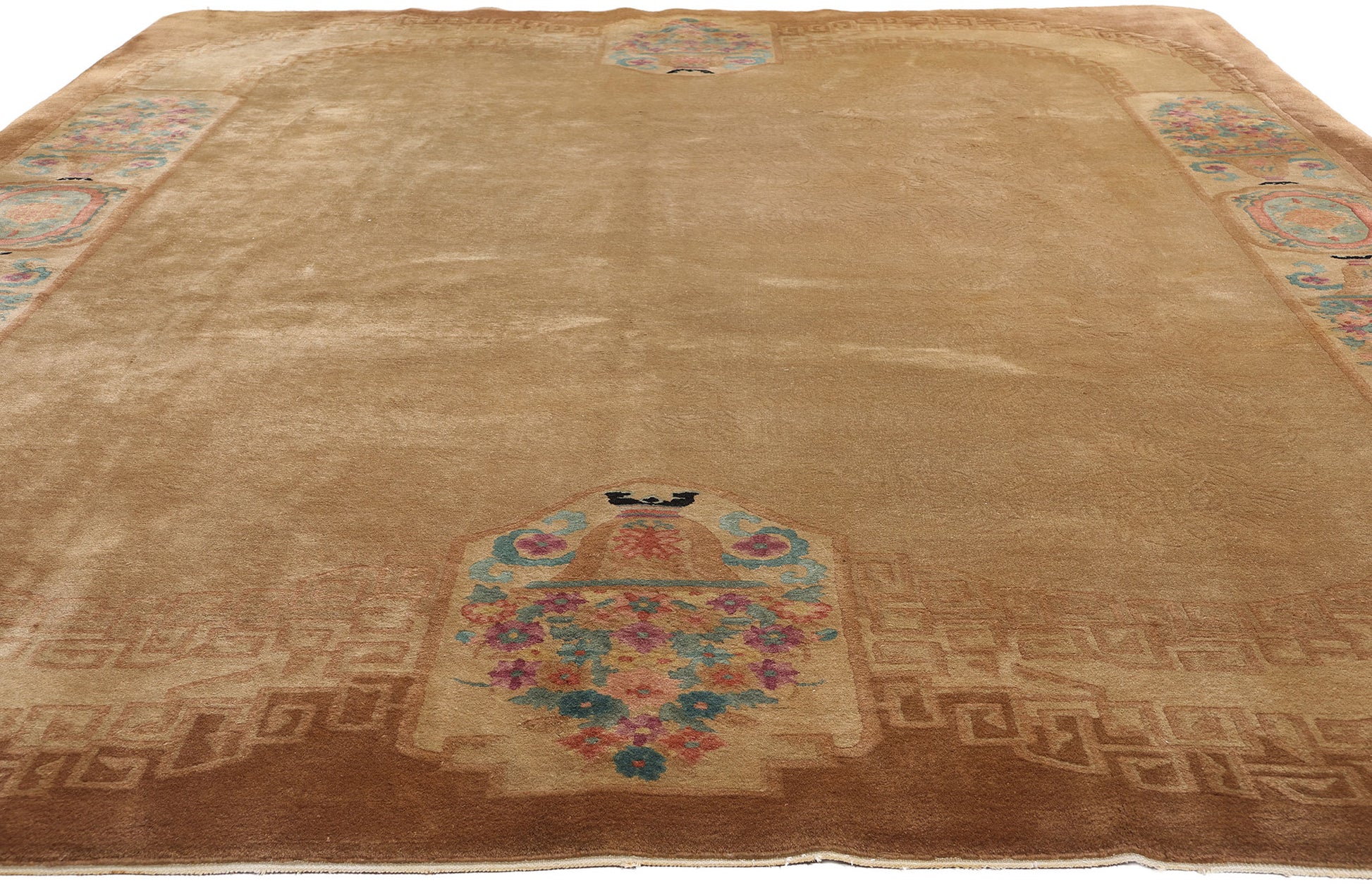 The quality of craftsmanship in this antique Chinese Art Deco rug is remarkable. Hand-knotted from fine wool, it offers a plush texture and exceptional durability, reflecting the masterful techniques passed down through generations of Chinese artisans. The soft, earthy tones and pastel colors create a warm, inviting ambiance while emphasizing the rug’s quiet elegance. Each floral element and geometric line is meticulously crafted, adding depth and dimension to the design. The open expanse of the tan field not only enhances its modern appeal but also exemplifies a timeless aesthetic that seamlessly fits within contemporary and traditional interiors.