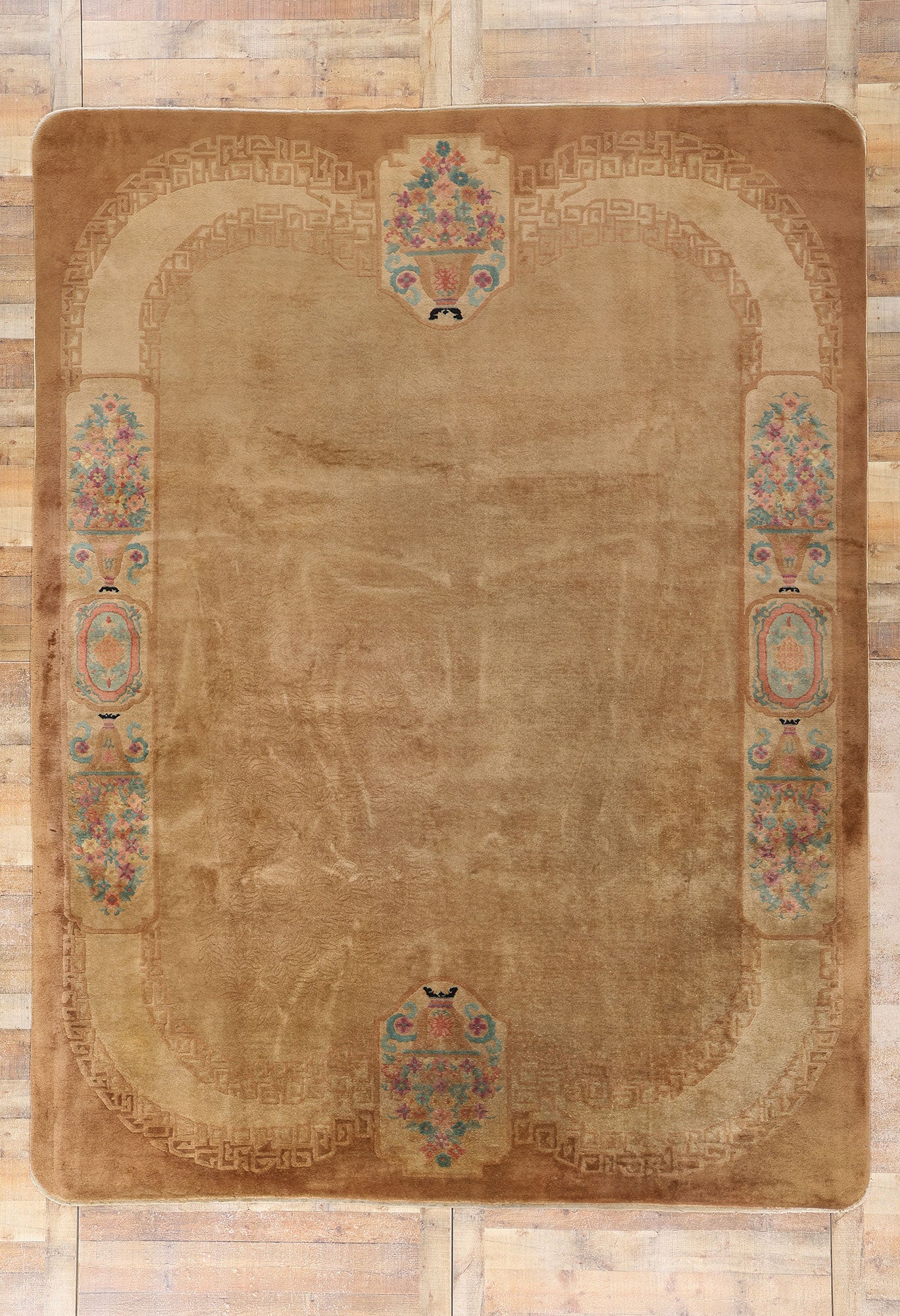 This exquisite hand-knotted wool antique Chinese Art Deco rug embodies the elegance and restrained beauty characteristic of early 20th-century textile artistry in China. Its soft, open tan field exudes a serene and minimalist charm, inviting a sense of tranquility into any space it graces. Art Deco influences, with their emphasis on modern simplicity and decorative refinement, are subtly evident in the symmetrical arrangement of pastel floral vases that encircle the border. These vases, delicately rendered in shades of pink, purple, and turquoise evoke the timeless motifs of nature and cultural symbolism cherished in Chinese decorative arts. This understated beauty makes the Chinese Art Deco rug an enduring testament to a period of artistic synthesis when traditional Chinese craftsmanship met modernist design.