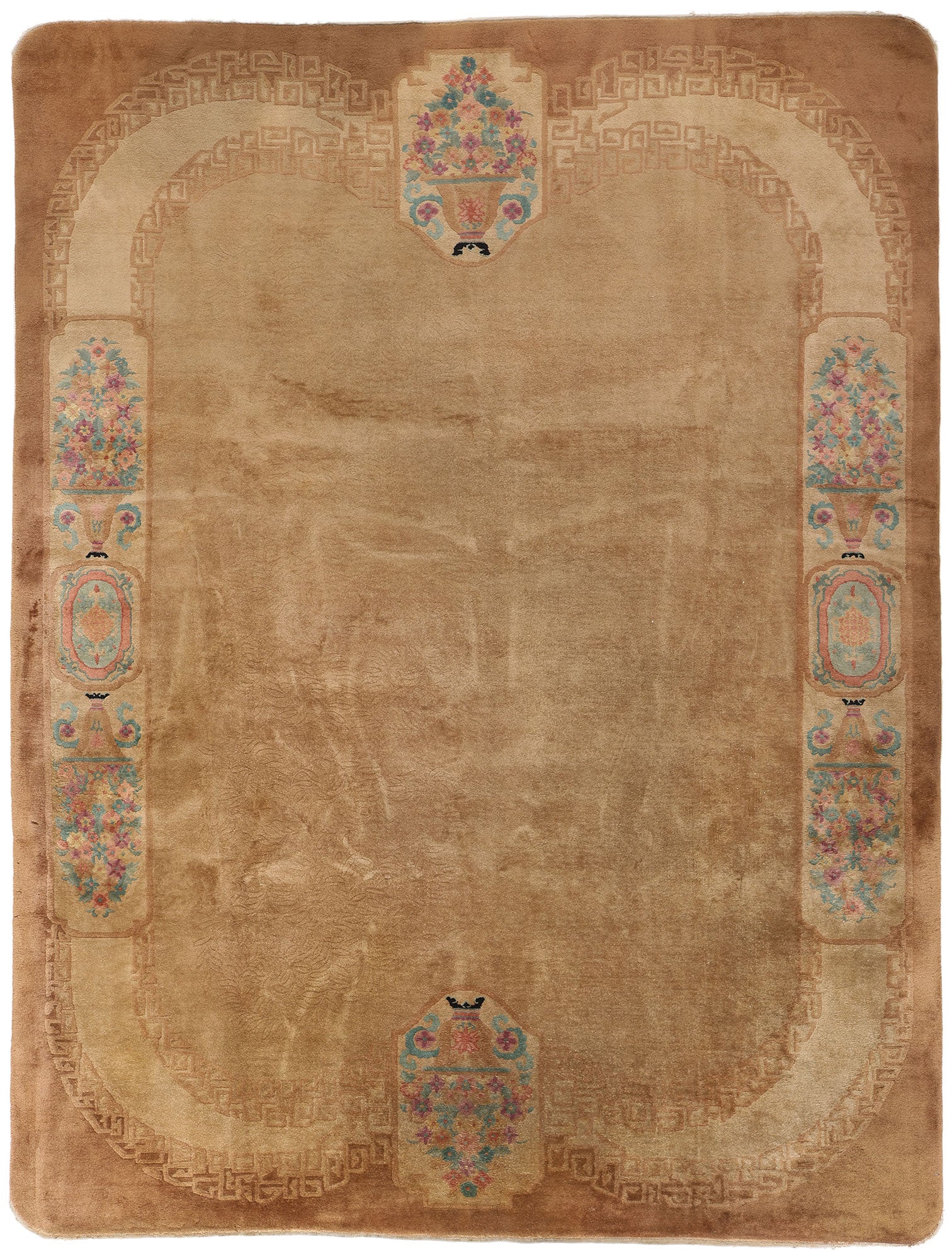 Drawing inspiration from the refined designs often associated with Helen Fette, this Chinese Art Deco rug exemplifies her approach to understated elegance and soft, harmonious palettes. The simplicity of the open tan field and the subtlety of the pastel floral vases reflect her influence, highlighting a balance of restraint and beauty that was a hallmark of her workAs a historical artifact, this rug captures a unique moment in textile history when China’s cultural heritage met the global Art Deco movement. It represents more than mere decoration; it serves as a reminder of the dialogue between tradition and innovation that defined early 20th-century Chinese craftsmanship. By combining refined simplicity, cultural motifs, and modern design sensibilities, this Chinese masterpiece remains a cherished piece of art, embodying both the heritage and the transformative beauty of its time. Its enduring appeal lies in its ability to connect past and present, making it a treasured addition to any collection or home.