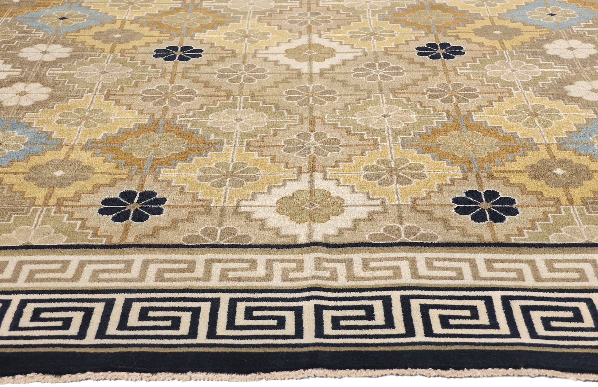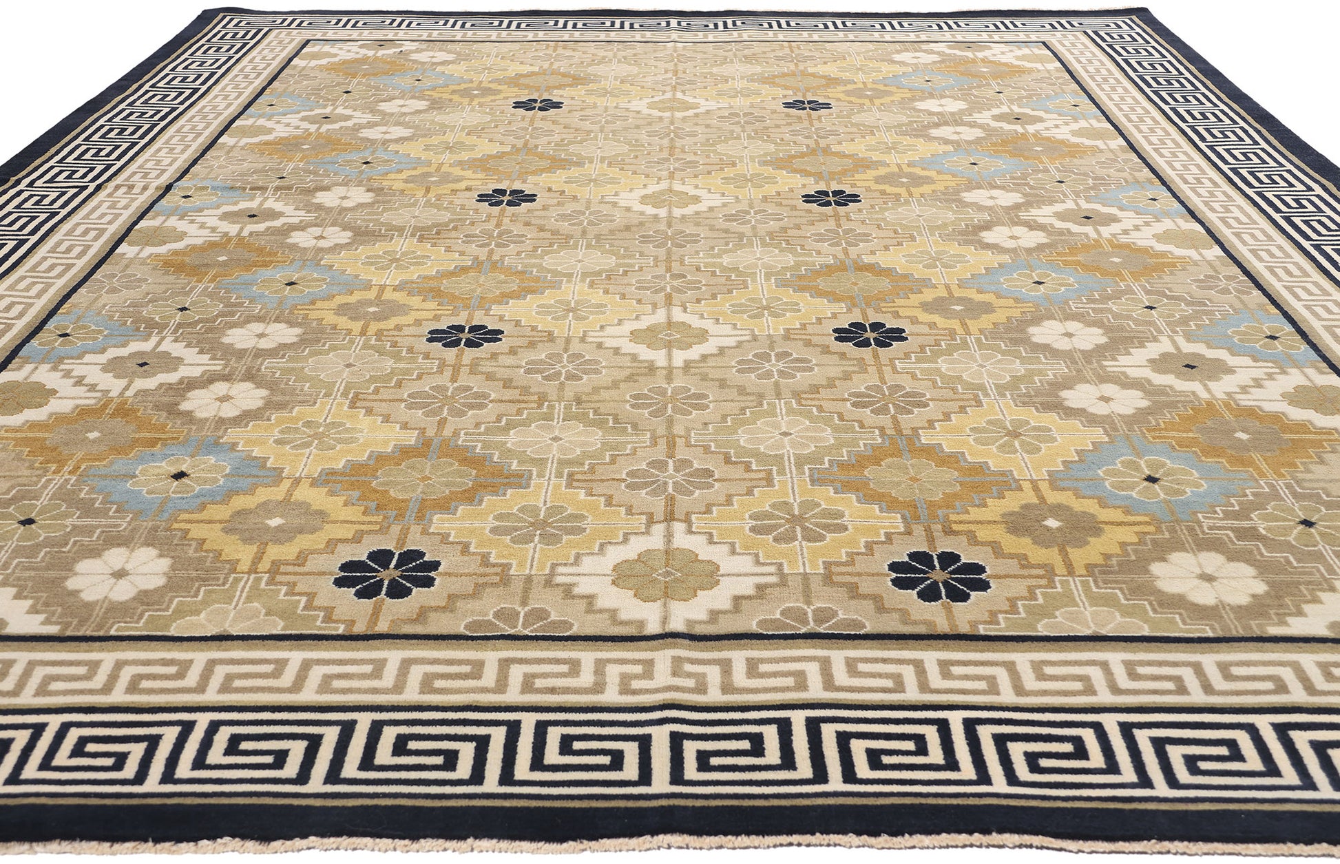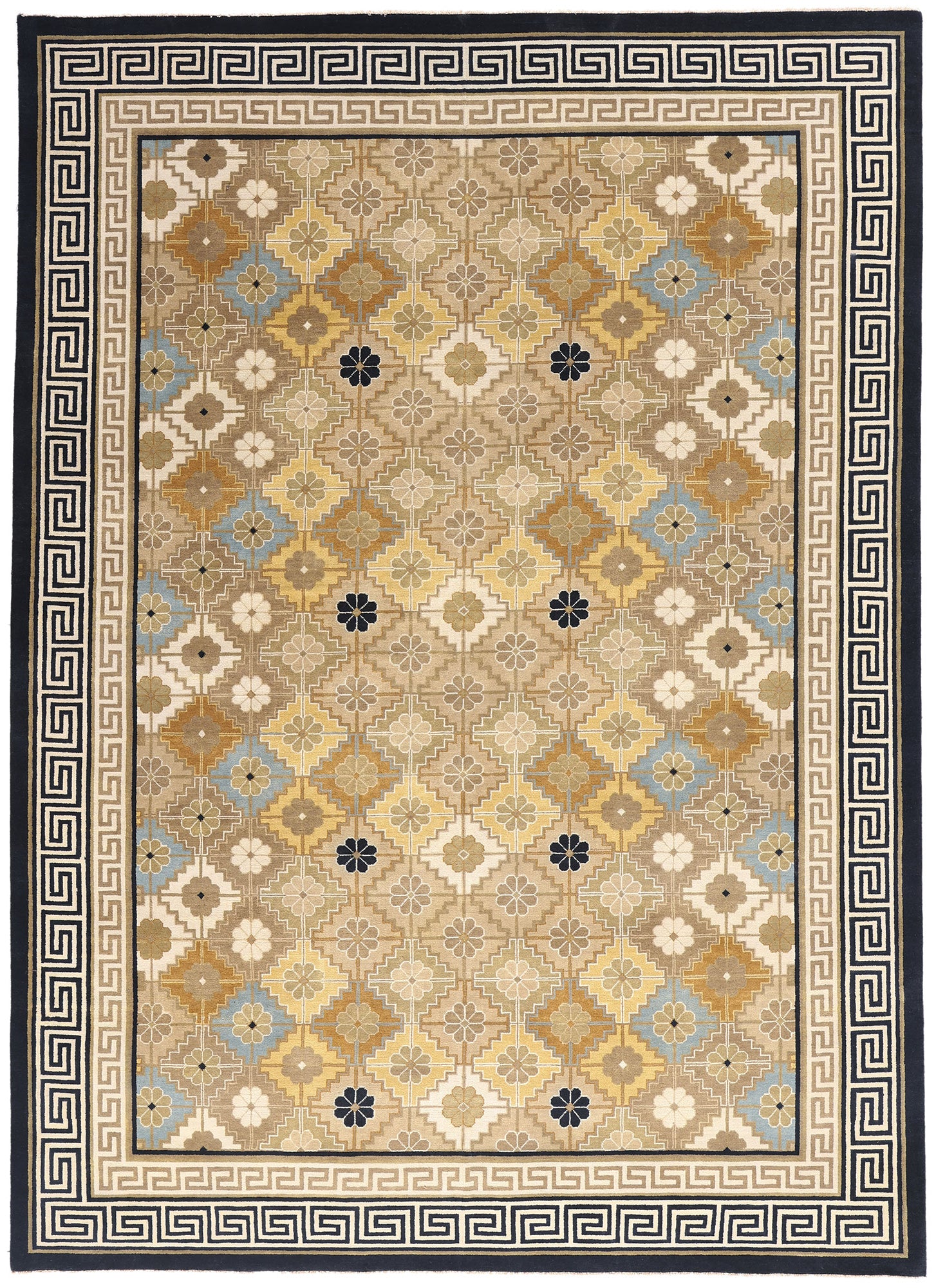 Encasing the rhythmic floral lattice is an exquisite border featuring the classic Greek key motif, a timeless emblem of infinity and continuity. The undulating lines of this labyrinthine pattern symbolize protection and unity, creating a visually compelling frame that accentuates the rug’s intricate center. The layered interplay of beige, taupe, and navy blue within the border amplifies the sense of structure and refinement, grounding the rug’s ethereal elegance in a rich historical narrative.