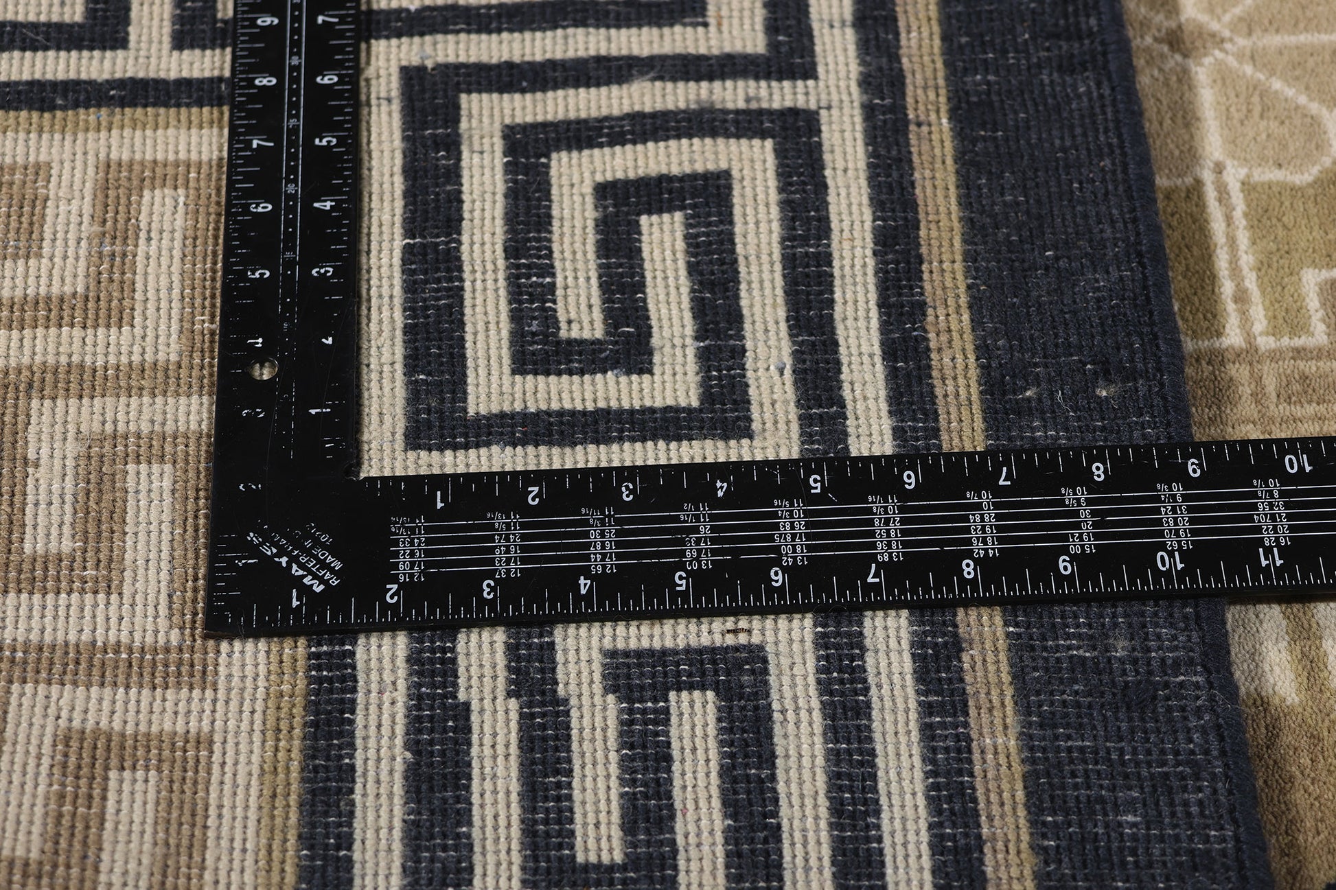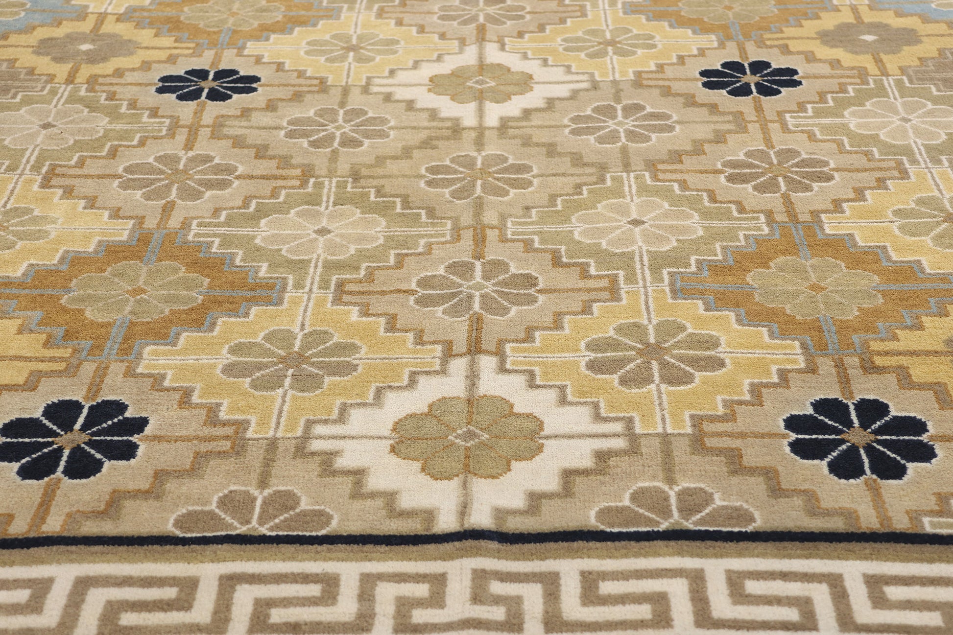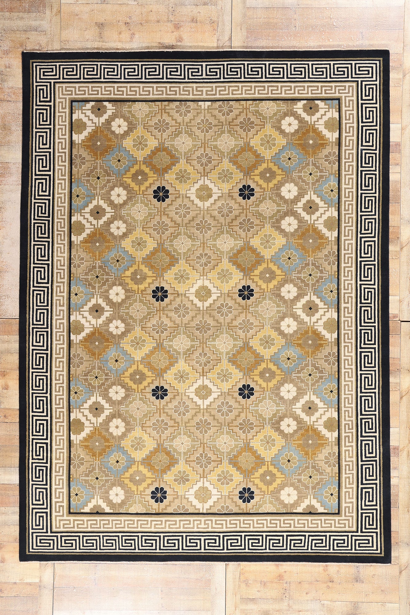 Encasing the rhythmic floral lattice is an exquisite border featuring the classic Greek key motif, a timeless emblem of infinity and continuity. The undulating lines of this labyrinthine pattern symbolize protection and unity, creating a visually compelling frame that accentuates the rug’s intricate center. The layered interplay of beige, taupe, and navy blue within the border amplifies the sense of structure and refinement, grounding the rug’s ethereal elegance in a rich historical narrative.