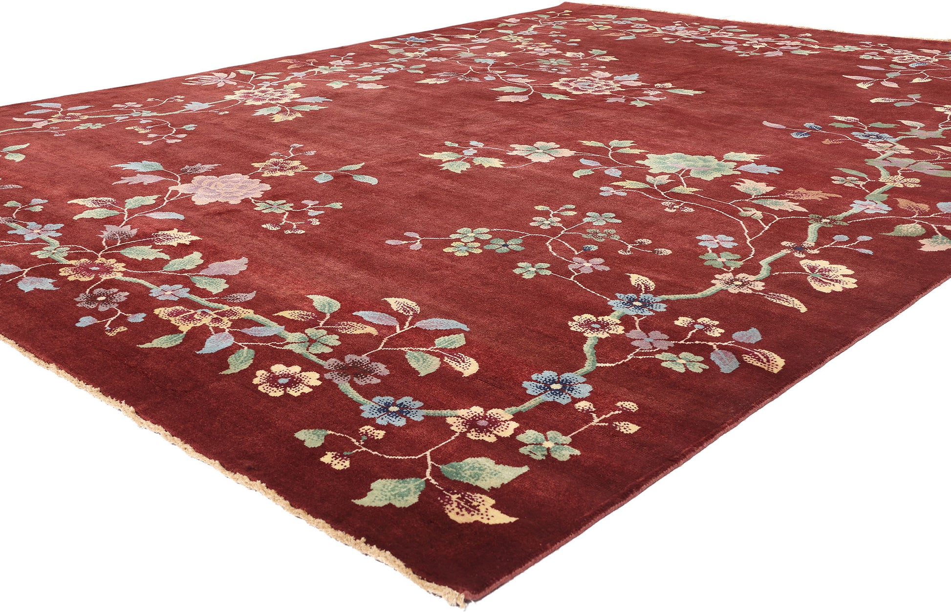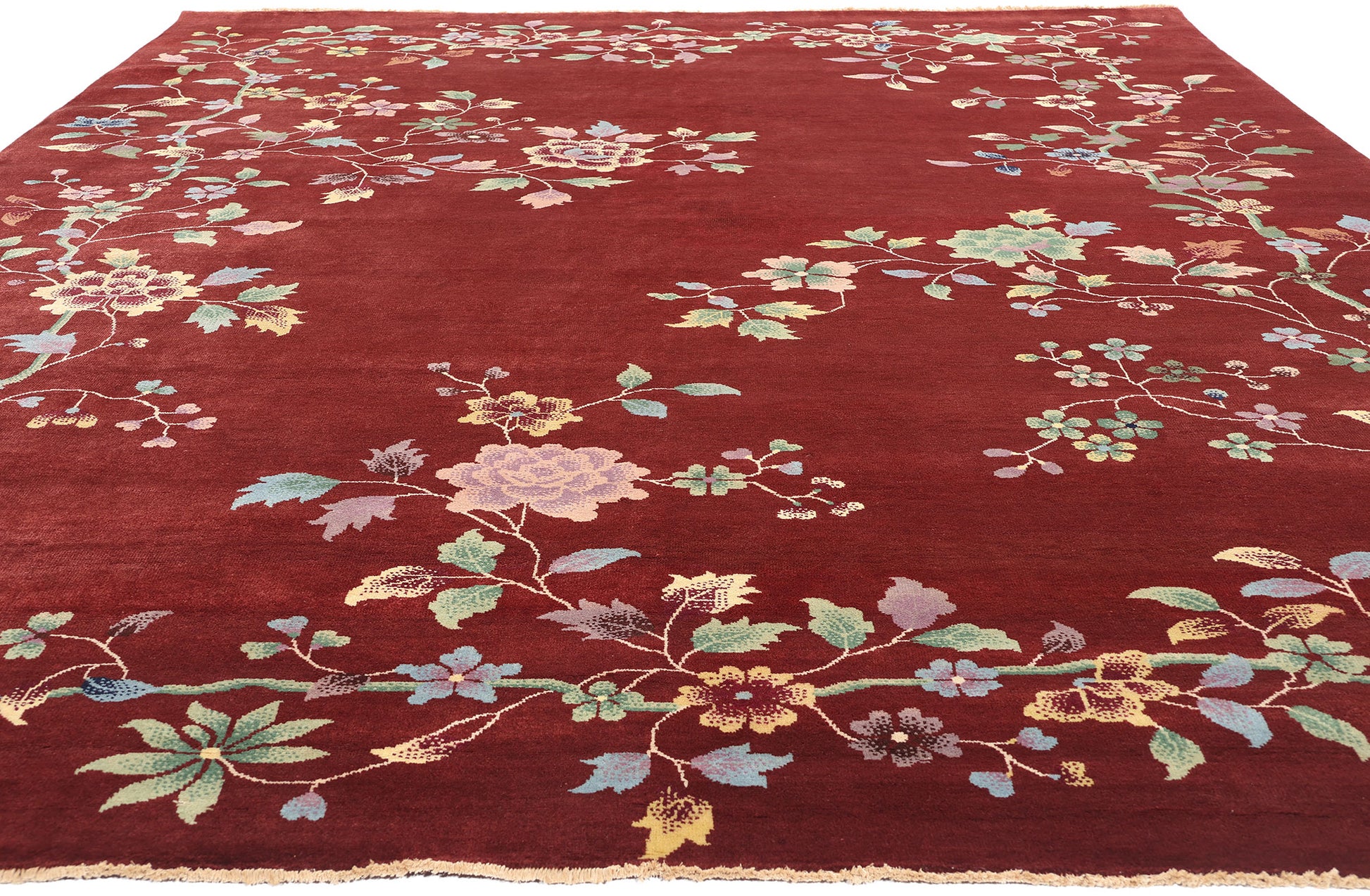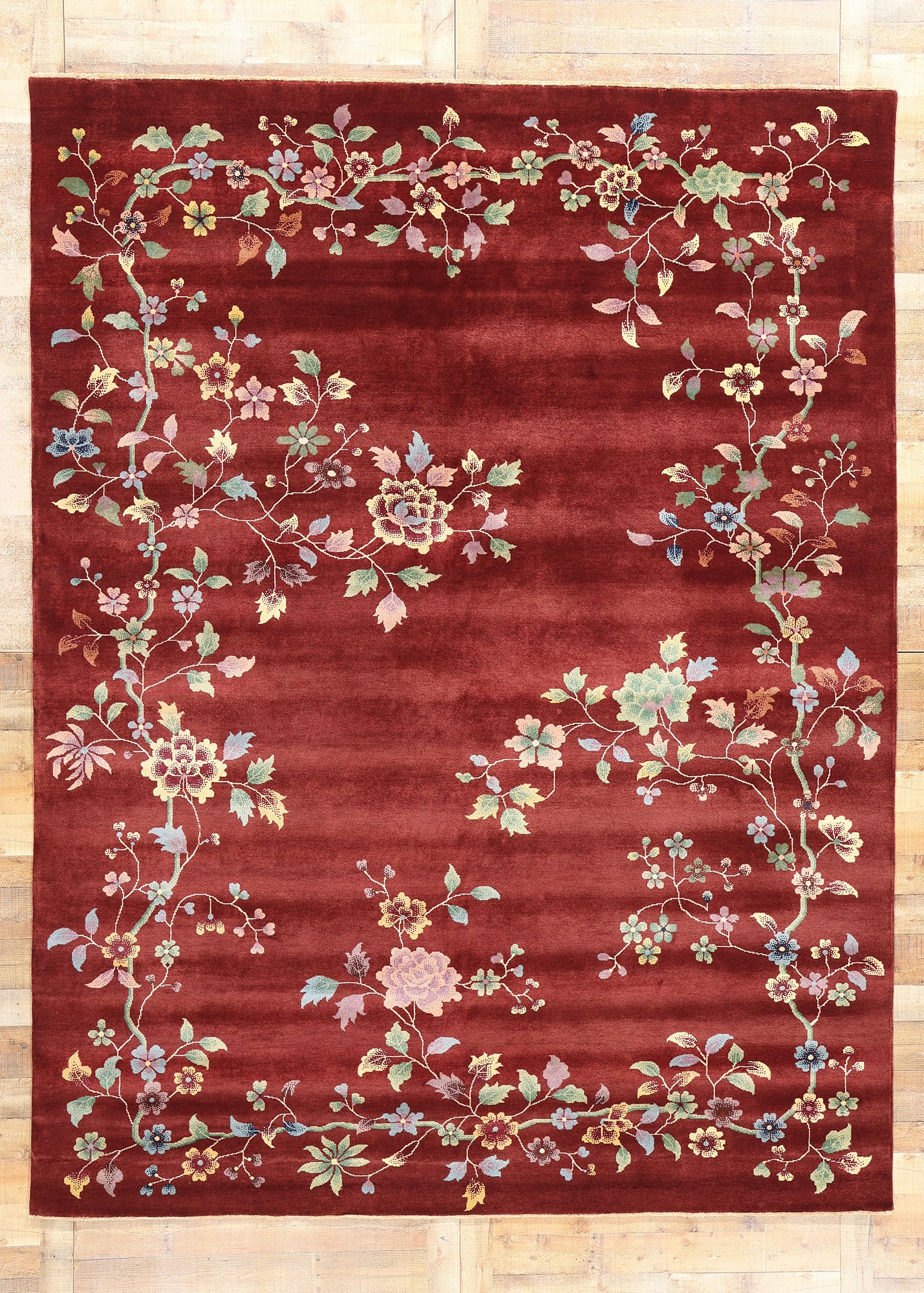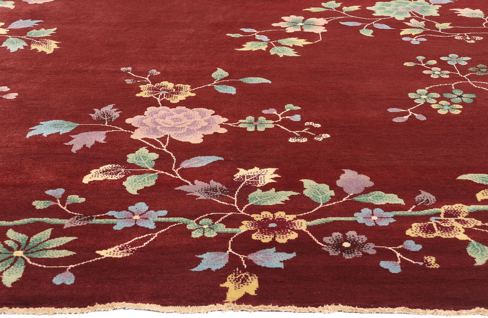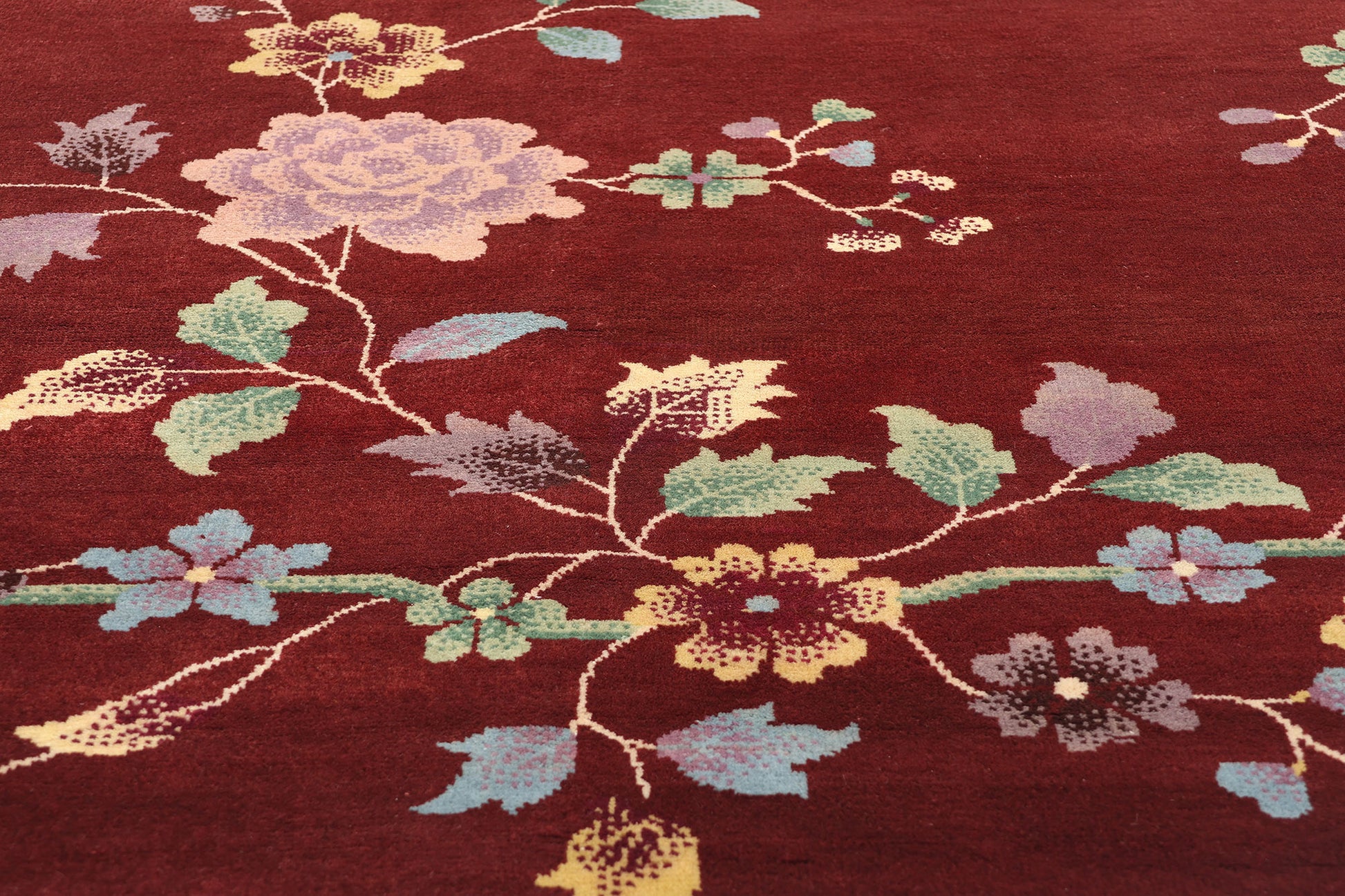 Channeling the elegance and opulence of the famed Walter Nichols style of the 1920s and 1930s, this hand-knotted wool modern Chinese Art Deco rug is a true embodiment of timeless beauty and cultural richness. The rug’s design, rendered in a manner faithful to the beloved Art Deco rugs that inspired it, exudes a sense of luxury and sophistication. The plush pile, soft and inviting, sets the stage for a breathtaking display of floral artistry, where large, glorious sprays of flowers are meticulously arranged to create a scene of unparalleled splendor and vitality.