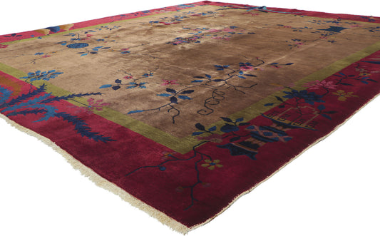 In the realm of rugs, Walter Nichols, an American, played a significant role. He manufactured Chinese Art Deco carpets in Tientsin, China, using the finest materials such as wool and silk. These rugs depicted exotic Asian flowers and birds in rich, bold colors, marking a departure from traditional Chinese rug designs.