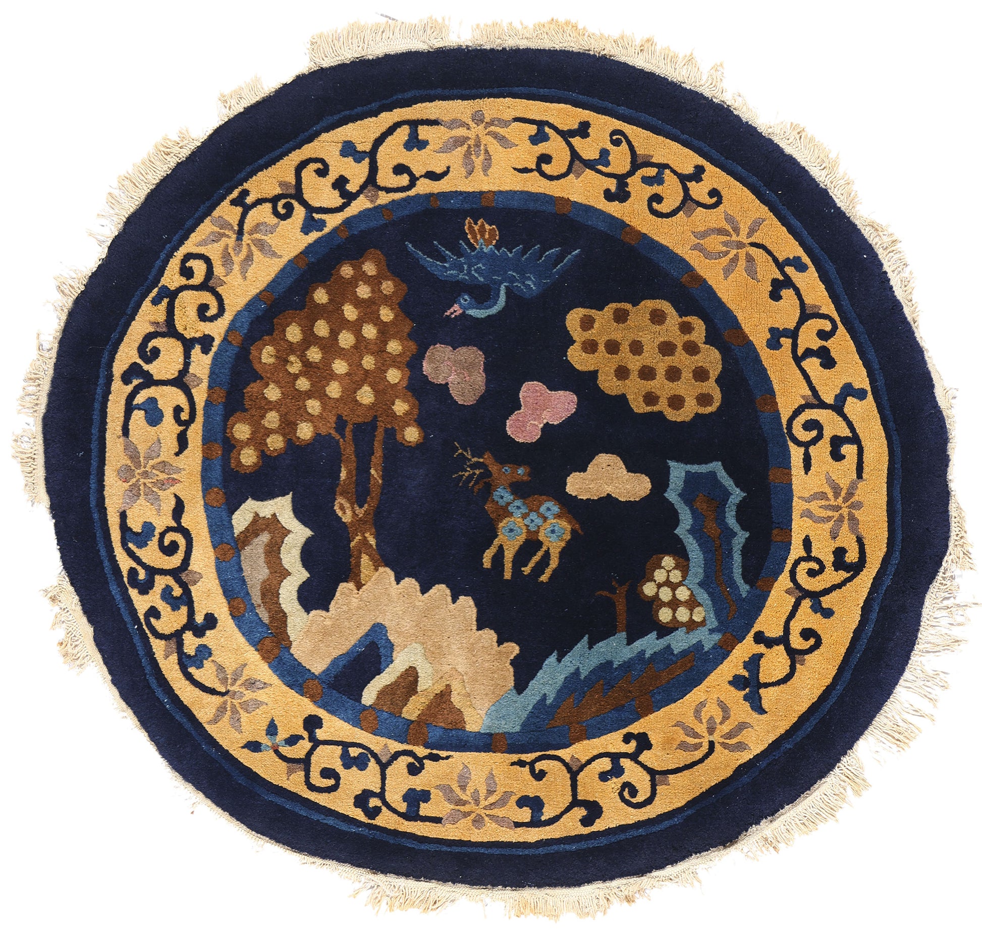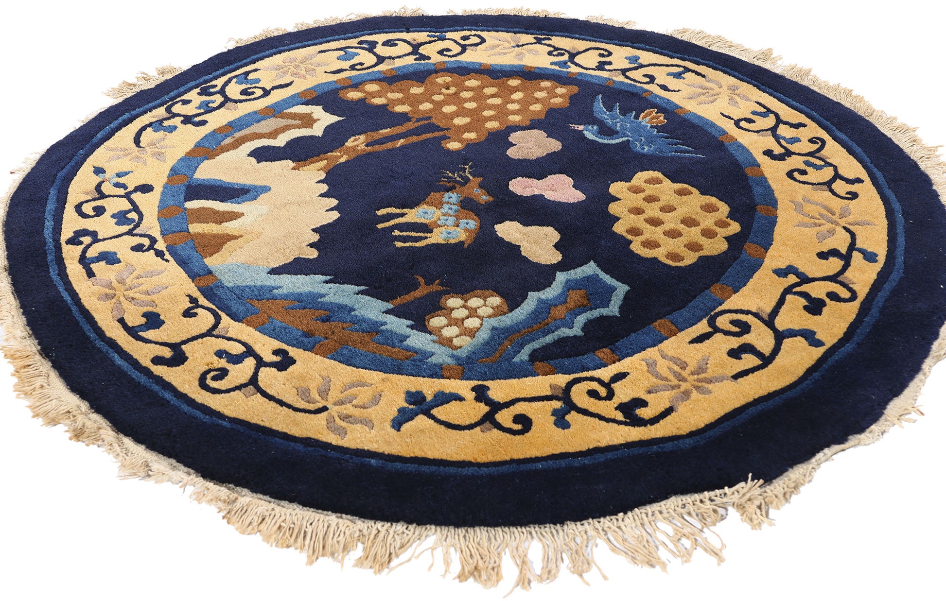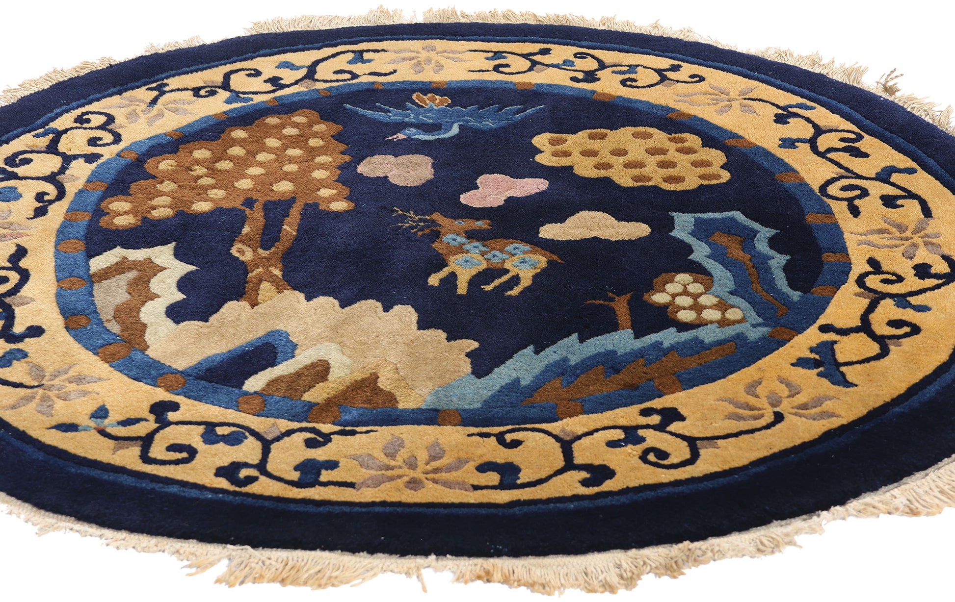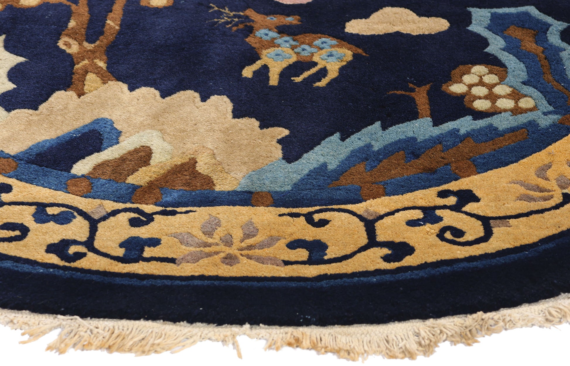 This exquisite hand-knotted wool vintage Chinese round Peking pictorial rug is a captivating example of traditional Chinese artistry infused with profound cultural symbolism. The deep navy-blue field is adorned with a carefully balanced composition of motifs, each rich in meaning. In the foreground, a graceful deer stands beneath a tree with golden blooms, signifying longevity and prosperity. In Chinese culture, the deer, or "Lu," is considered a creature of fortune, believed to be able to locate the rare and mystical lingzhi fungus, which is said to grant immortality. The presence of the deer in this Chinese Peking rug conveys wishes for a long and prosperous life.