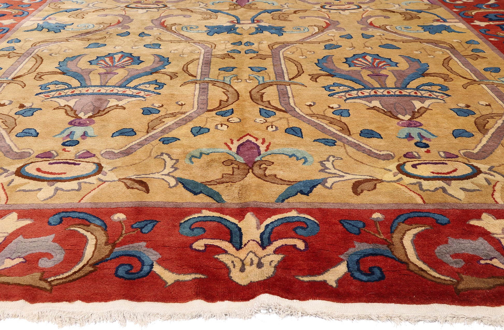 The warm tan field unfolds in a disciplined all-over arrangement of stylized floral urns and lotus-derived palmettes, each rendered with elegant restraint. These repeating motifs are linked by sinuous vine scrolls and delicate leaf clusters, forming a rhythmic lattice that feels both ceremonial and meditative. Rooted in Buddhist and Chinese garden symbolism, the design evokes abundance, spiritual balance, and continuity—an idealized vision of harmony that resonates deeply with collectors drawn to meaning as much as beauty.