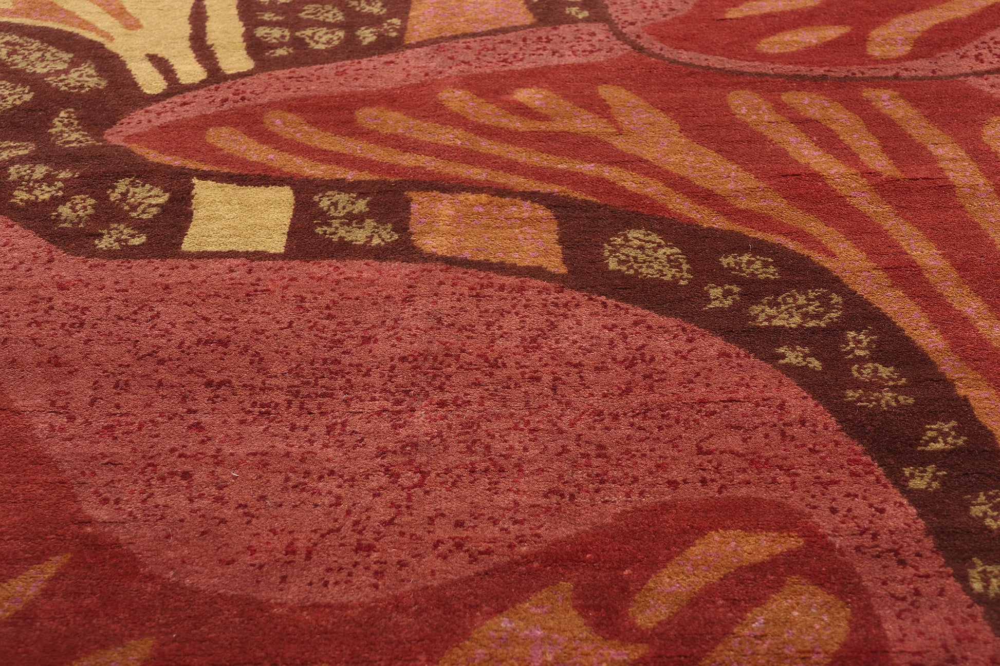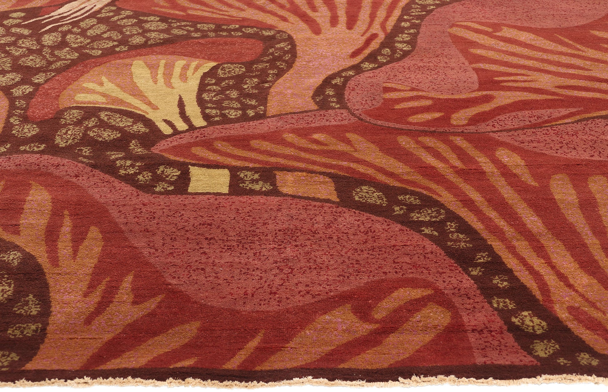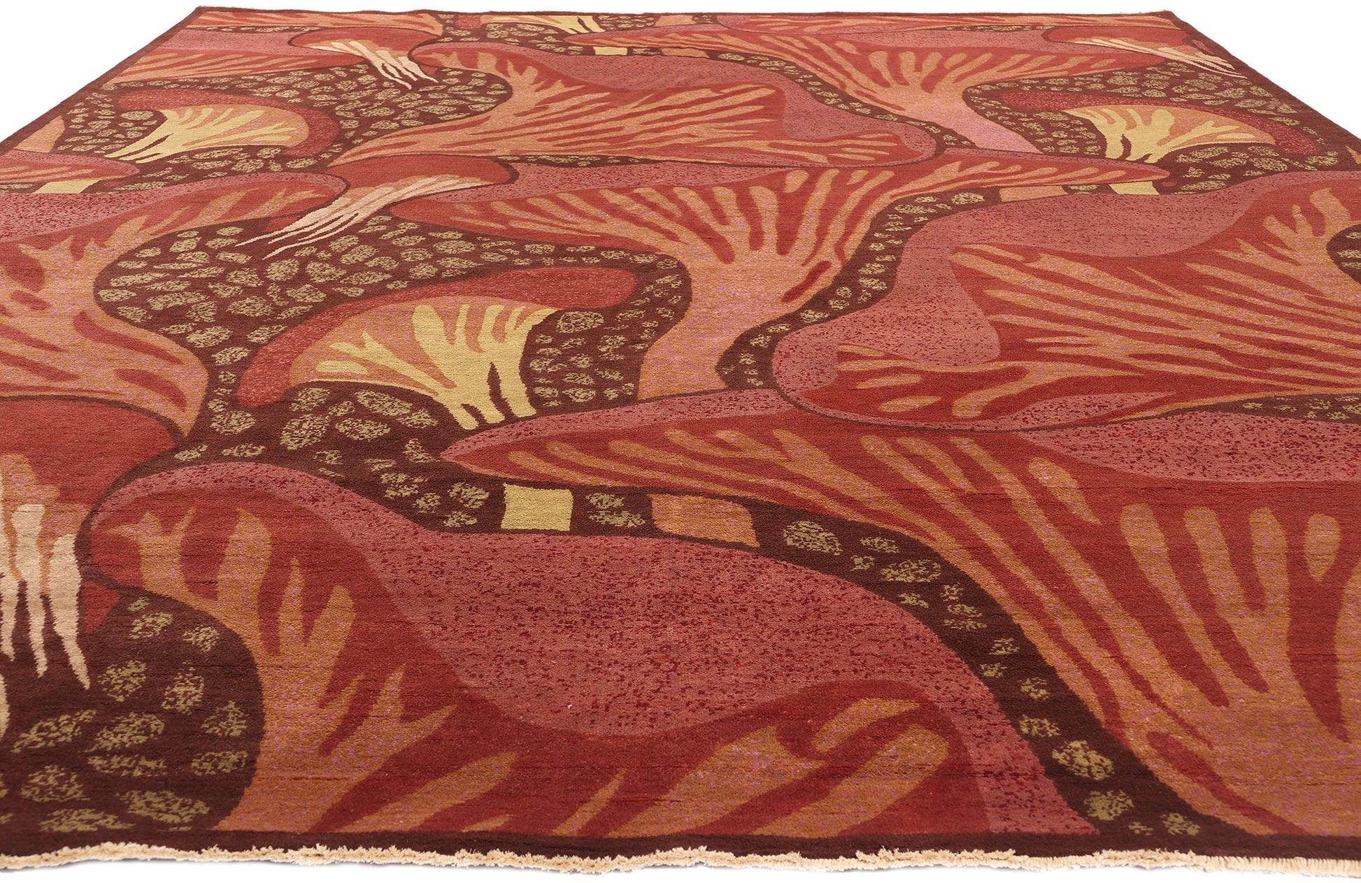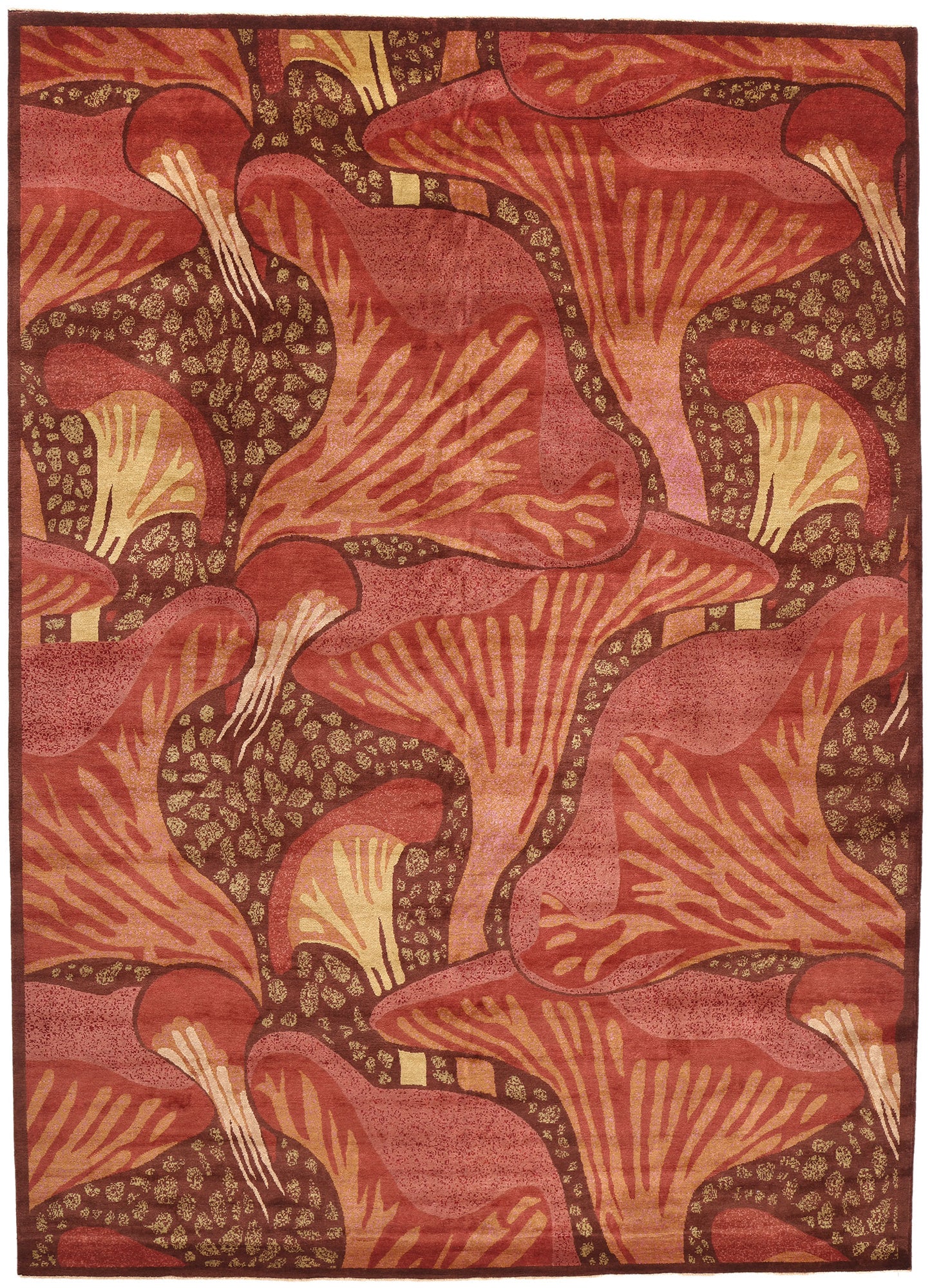The Modern Moser Mushroom Biophilic rug, captured in this image, is a mesmerizing contemporary rendition of Koloman Moser's celebrated "Schwamme" (Mushrooms) design from 1899. This hand-knotted wool rug, expertly crafted in India, breathes new life into Moser's intricate vision. The rug's design masterfully showcases the sinuous lines and flowing forms that are quintessential to the Art Nouveau movement, transforming the natural motif of mushrooms into an enchanting and organic work of art.