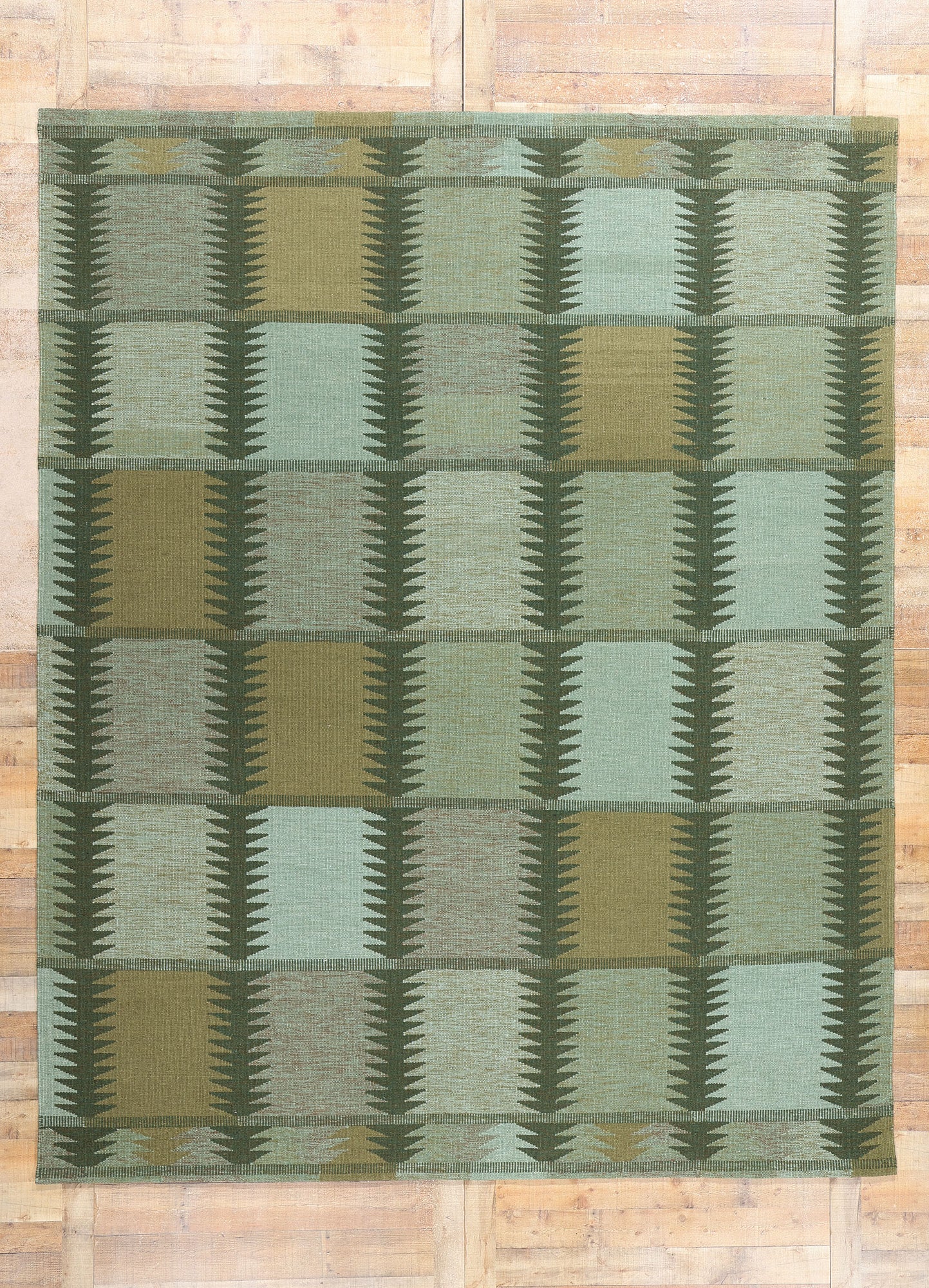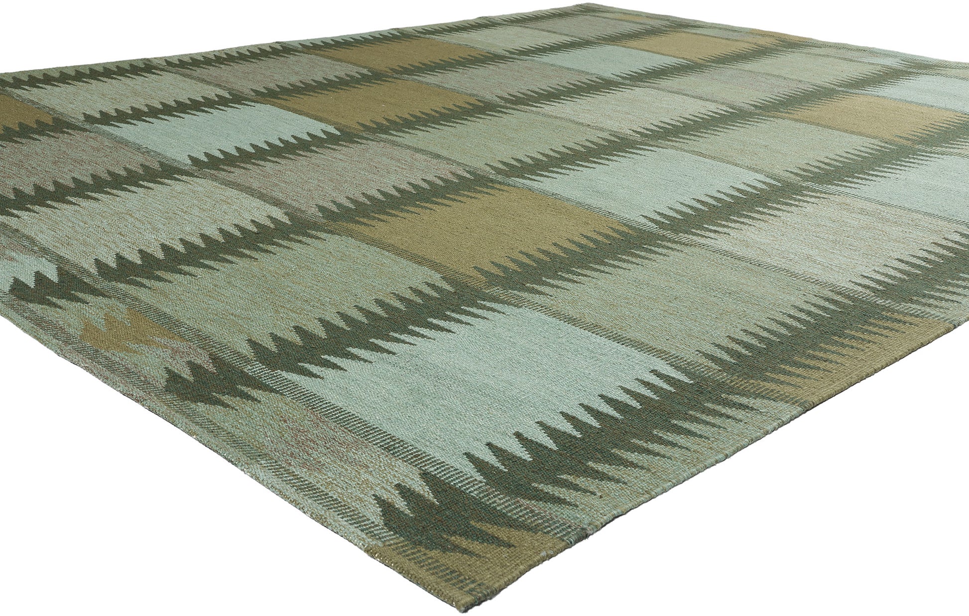 31118 New Scandinavian Modern Green Swedish Inspired Kilim Rug, 09'04 x 11'07.