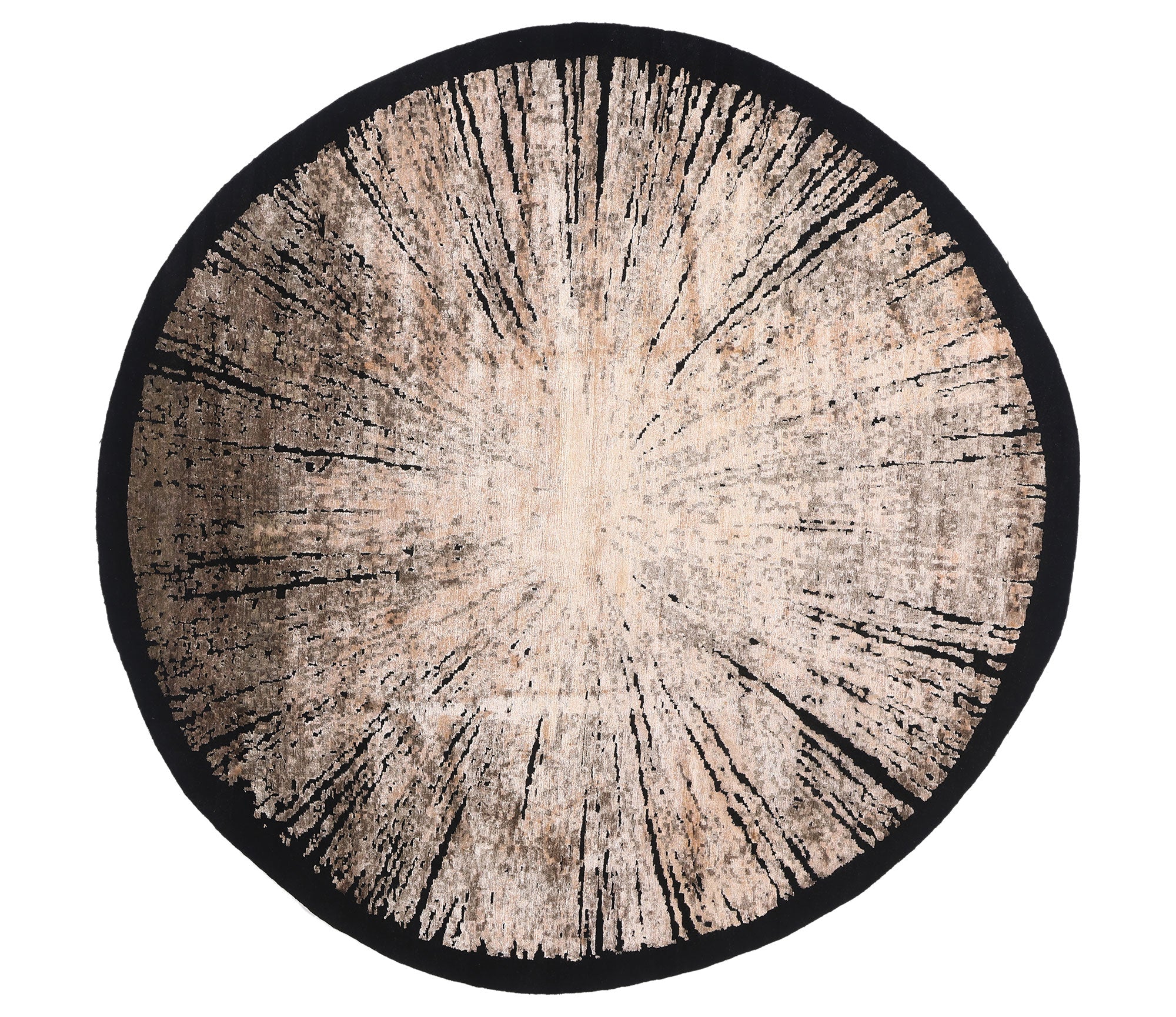 This hand knotted wool and silk contemporary round Indian rug reads like a radiant meditation on light, movement, and nature itself. The circular format becomes a stage for a powerful sunburst composition, where organic striations ripple outward from a glowing core. The design feels elemental and intentional, evoking the quiet drama of dawn breaking through shadow. It is a commanding visual statement, both grounding and transcendent, crafted for interiors that value art as atmosphere.