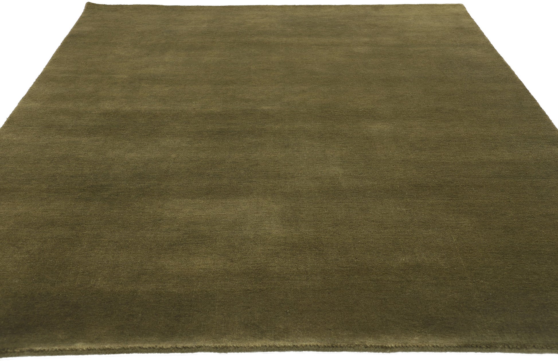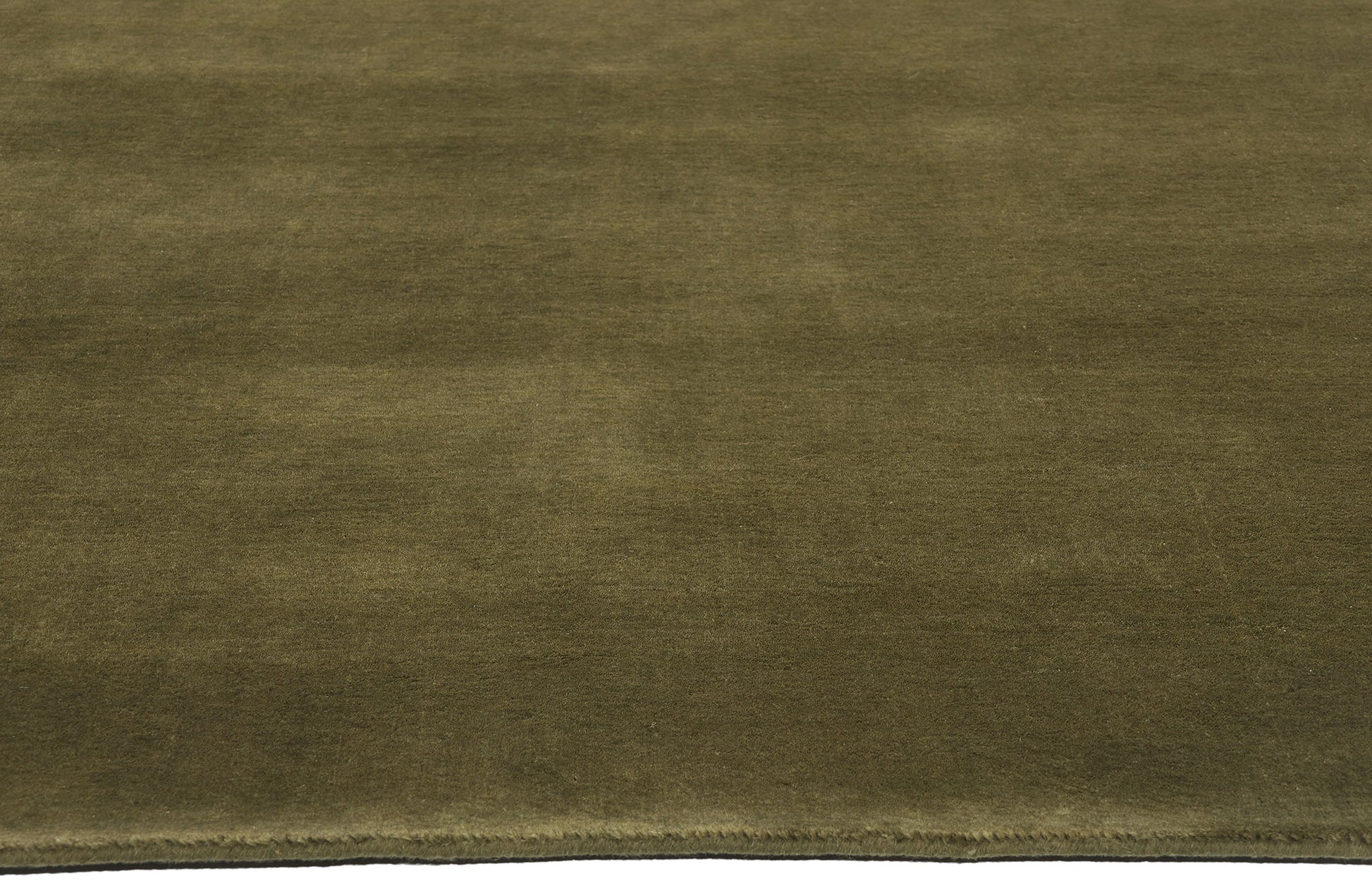 This Solid Olive Green Modern Area Rug perfectly marries biophilic design with an earthy, sophisticated aesthetic. Handcrafted with exquisite detail, its rich olive green color, interwoven with shades of Spanish moss, evokes the serenity of tranquil landscapes. The soft gradations and tonal variations across this modern Indian rug add depth and texture, capturing the essence of nature's subtle beauty.