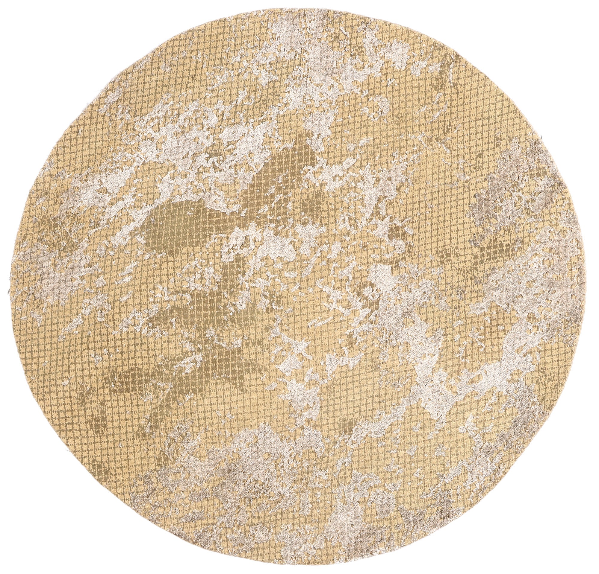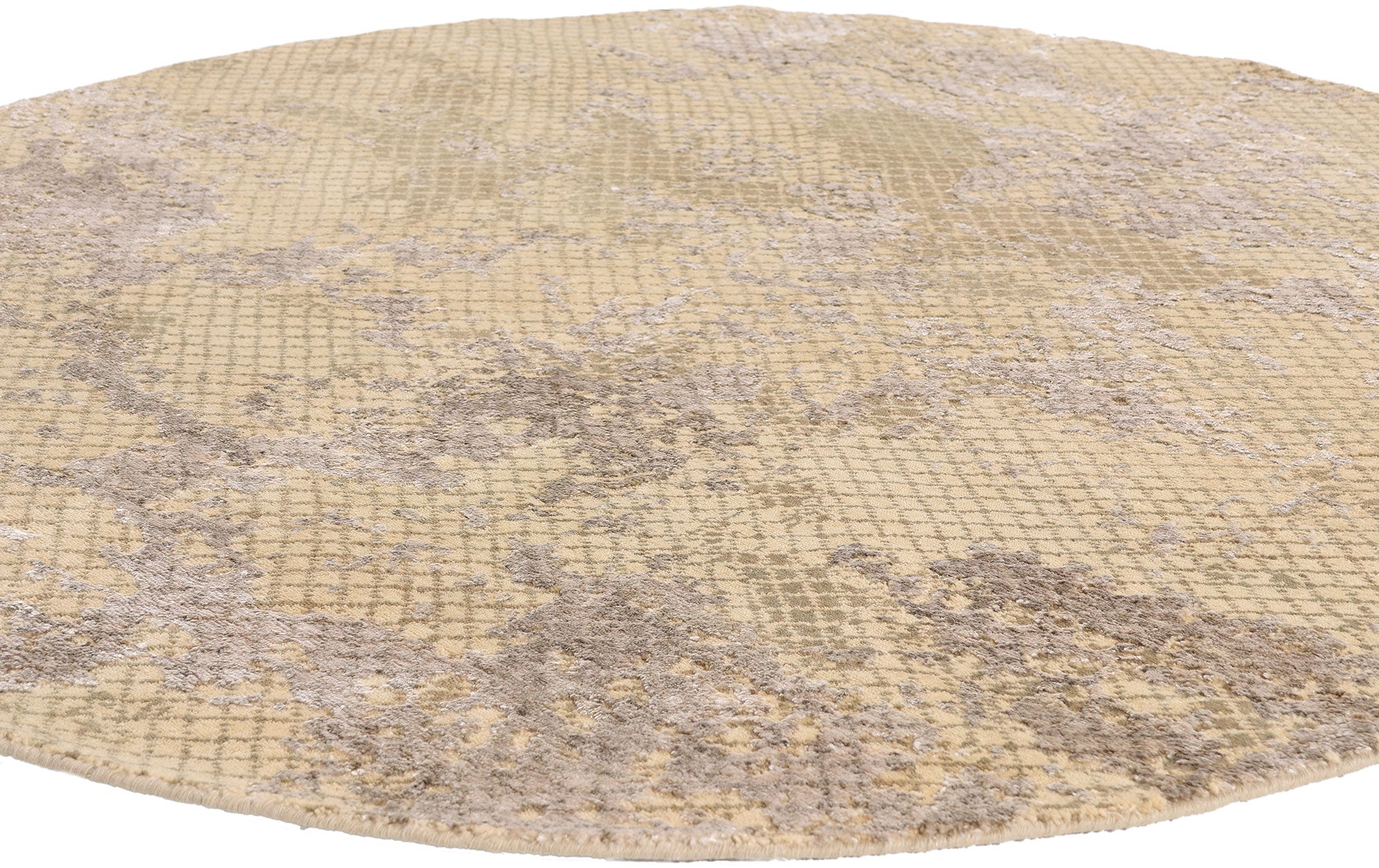 This hand knotted wool and silk contemporary round Indian rug unfolds like a quiet landscape viewed from above—subtle, layered, and deeply intentional. Its circular form invites a sense of wholeness and continuity, while the softly weathered pattern evokes natural terrain shaped by time rather than ornament. The design speaks in hushed tones, offering a refined alternative to overt decoration, perfectly suited for interiors where sophistication is expressed through restraint.