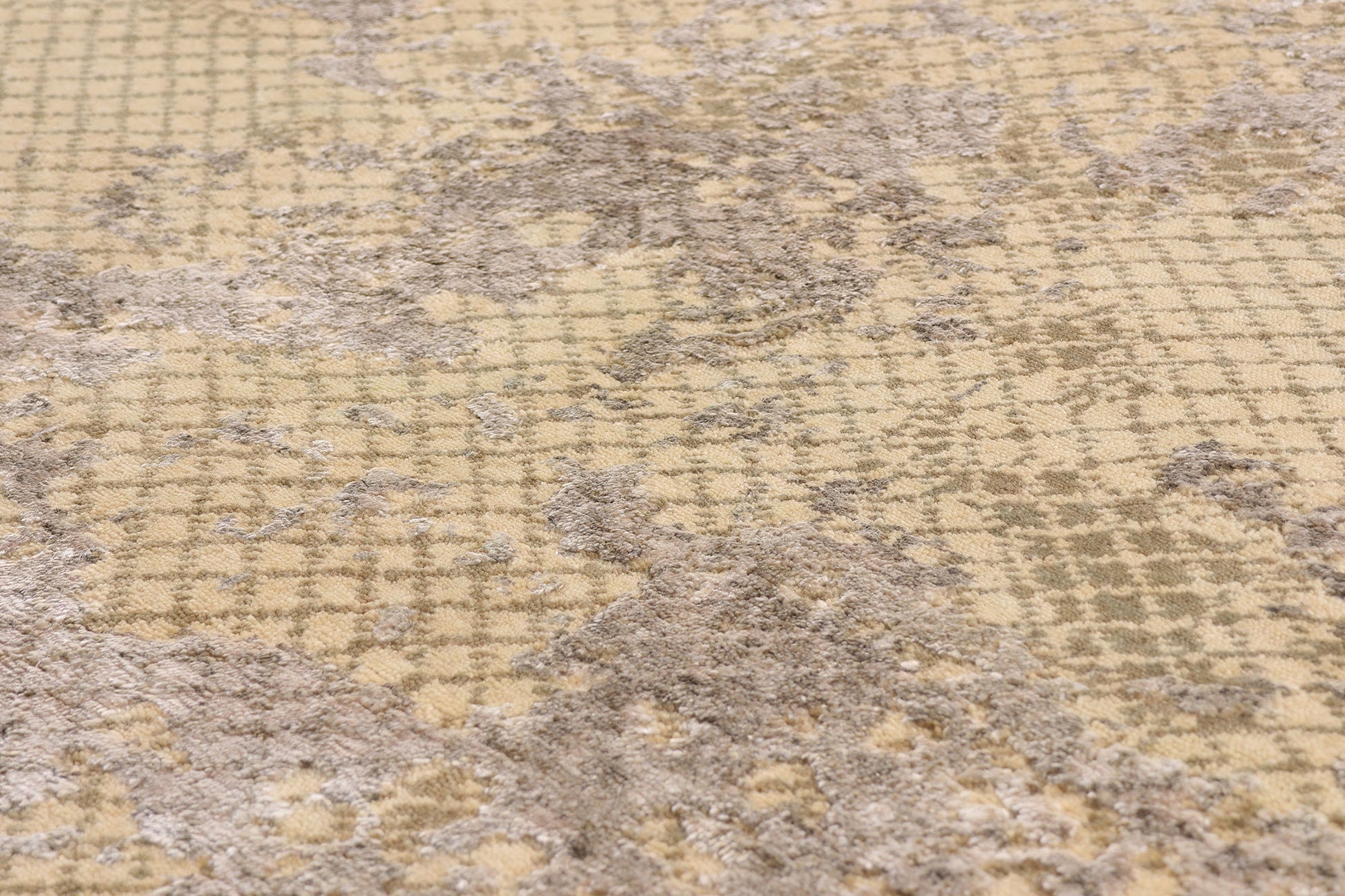 The sumptuous surface reveals a richly textured interplay of wool and silk, where tactile depth becomes the true ornament. A delicate crosshatched ground anchors the composition, over which organic, mineral-like striations drift with an almost geological calm. Precious silk fibers emerge gently from the woolen foundation, catching the light like veins of quartz embedded in stone. This nuanced shimmer gives this exquisite work of art a living presence, one that subtly evolves as light moves through the space.
